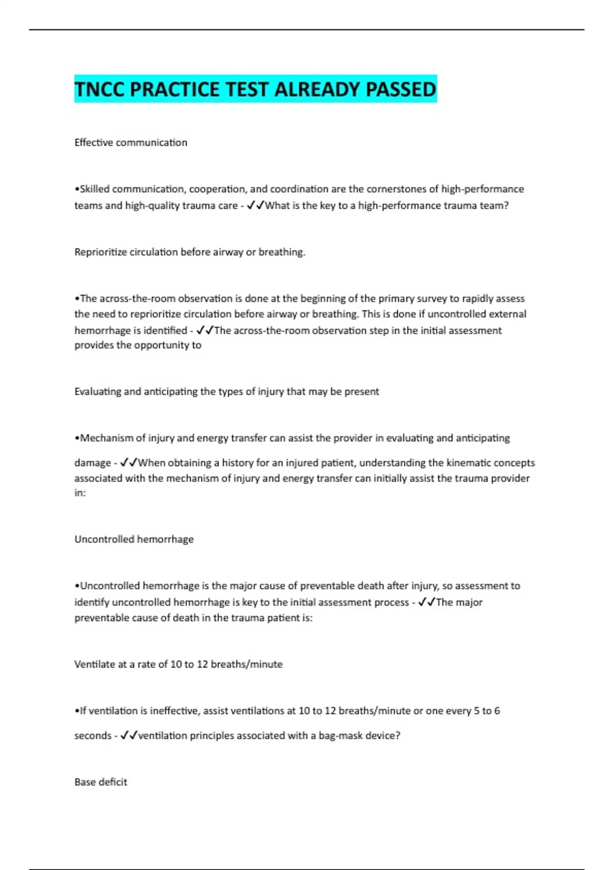 identify uncontrolled hemorrhage is key to the initial assessment process - ✔✔The major