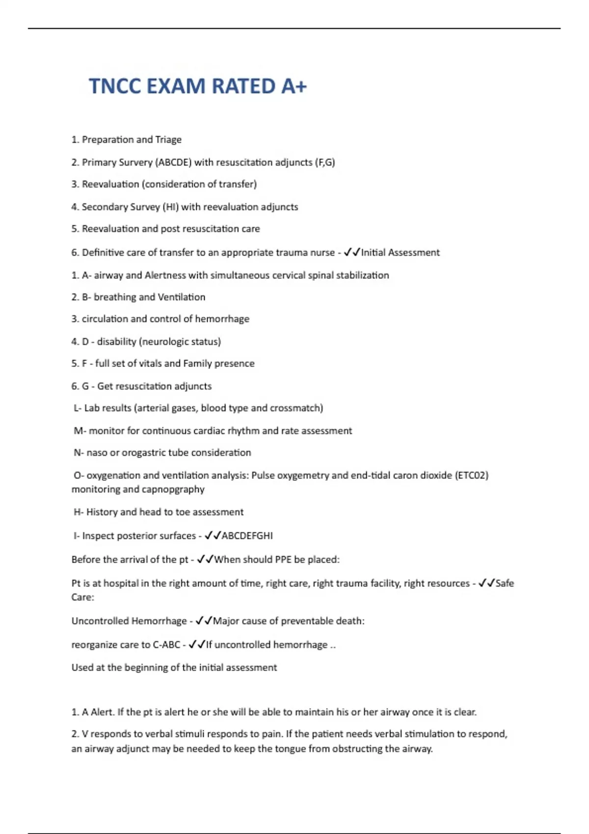 1. Preparation and Triage 2. Primary Survery (ABCDE) with resuscitation adjuncts (F,G) 3. Reevaluation (consideration of transfer) 4. Secondary Survey (HI) with reevaluation adjuncts 5. Reevaluation and post resuscitation care 6. Definitive care of transfer to an appropriate trauma nurse - Initial Assessment 1. A- airway and Alertness with simultaneous cervical spinal stabilization 2. B- breathing and Ventilation 3. circulation and control of hemorrhage 4. D - disability (neurologic status) 5. F - full set of vitals and Family presence 6. G - Get resuscitation adjuncts L- Lab results (arterial gases, blood type and crossmatch) M- monitor for continuous cardiac rhythm and rate assessment N- naso or orogastric tube consideration O- oxygenation and ventilation analysis: Pulse oxygemetry and end-tidal caron dioxide (ETC02) monitoring and capnopgraphy H- History and head to toe assessment I- Inspect posterior surfaces - ABCDEFGHI Before the arrival of the pt - When should PPE be placed: Pt is at hospital in the right amount of time, right care, right trauma facility, right resources - Safe Care: Uncontrolled Hemorrhage - Major cause of preventable death: reorganize care to C-ABC - If uncontrolled hemorrhage .. Used at the beginning of the initial assessment 1. A Alert. If the pt is alert he or she will be able to maintain his or her airway once it is clear. 2. V responds to verbal stimuli responds to pain. If the patient needs verbal stimulation to respond, an airway adjunct may be needed to keep the tongue from obstructing the airway.