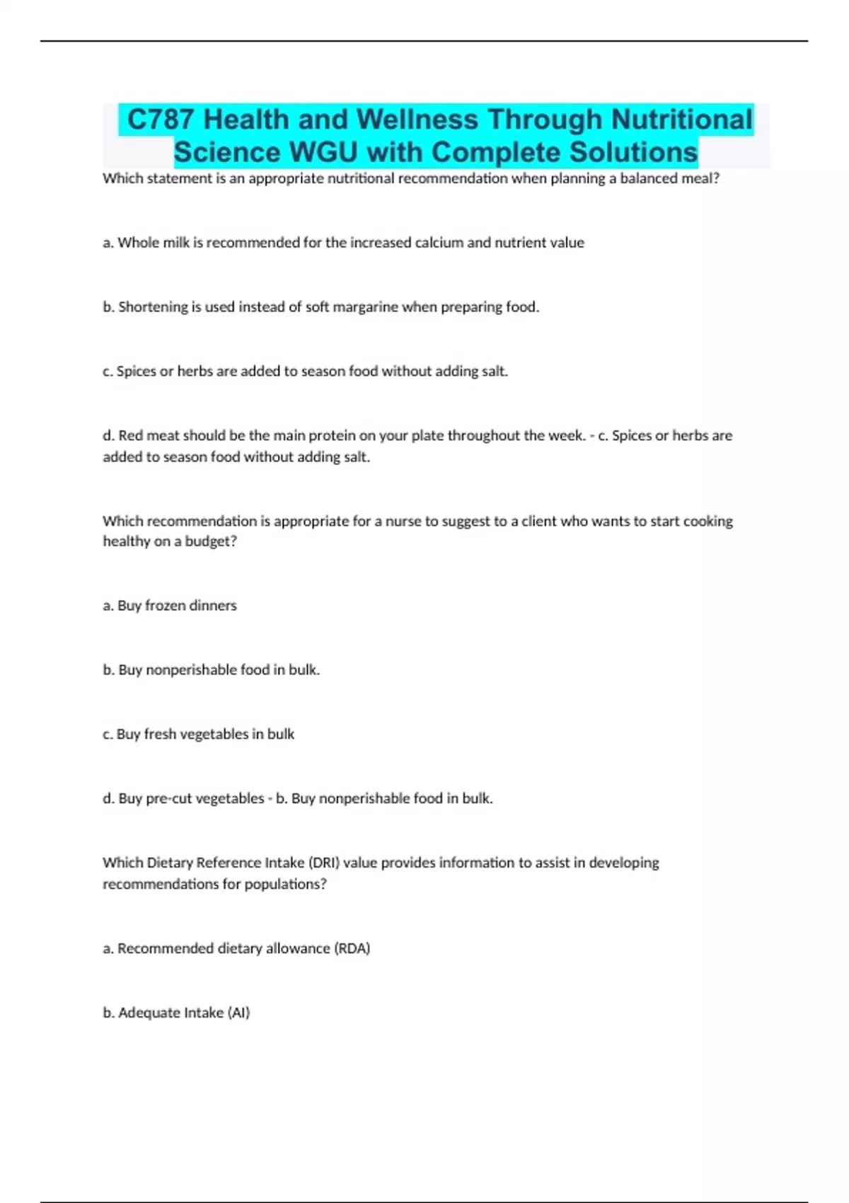 C787 Health and Wellness Through Nutritional Science WGU with Complete Solutions Which statement is an appropriate nutritional recommendation when planning a balanced meal? a. Whole milk is recommended for the increased calcium and nutrient value b. Shortening is used instead of soft margarine when preparing food. c. Spices or herbs are added to season food without adding salt. d. Red meat should be the main protein on your plate throughout the week. - c. Spices or herbs are added to season food without adding salt. Which recommendation is appropriate for a nurse to suggest to a client who wants to start cooking healthy on a budget? a. Buy frozen dinners b. Buy nonperishable food in bulk. c. Buy fresh vegetables in bulk d. Buy pre-cut vegetables - b. Buy nonperishable food in bulk. Which Dietary Reference Intake (DRI) value provides information to assist in developing recommendations for populations? a. Recommended dietary allowance (RDA) b. Adequate Intake (AI)