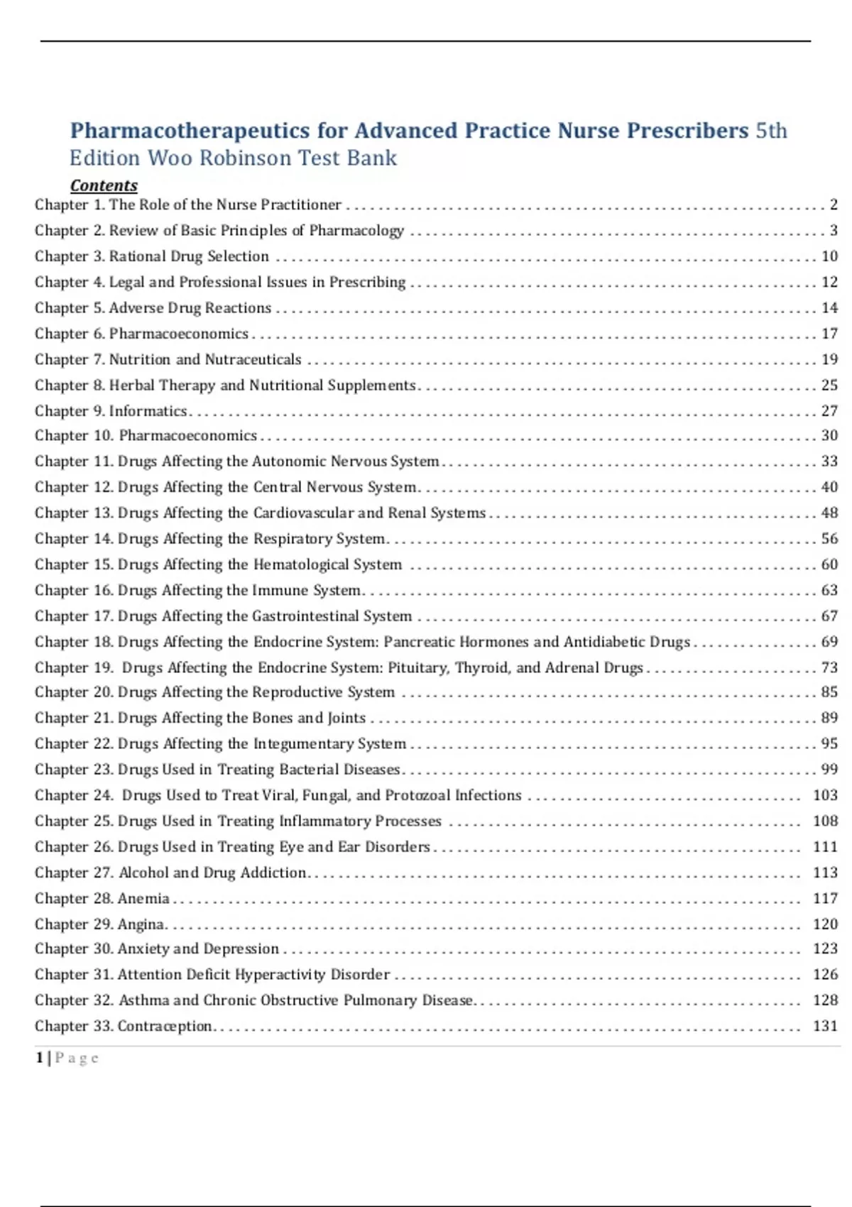 Pharmacotherapeutics for Advanced Practice Nurse Prescribers 5th Edition Woo Robinson Test BankContents Chapter 1. The Role of the Nurse Practitioner ................................ ............................. 2 Chapter 2. Review of Basic Principles of Pharmacology ................................ ..................... 3 Chapter 3. Rational Drug Selection ................................ ................................ ..... 10 Chapter 4. Legal and Professional Issues in Prescribing ................................ .................... 12 Chapter 5. Adverse Drug Reactions ................................ ................................ ..... 14 Chapter 6. Pharmacoeconomics ................................ ................................ ........ 17 Chapter 7. Nutrition and Nutraceuticals ................................ ................................ . 19 Chapter 8. Herbal Therapy and Nutritional Supplements ................................ ................... 25 Chapter 9. Informatics ................................ ................................ ................ 27 Chapter 10. Pharmacoeconomics ................................ ................................ ....... 30 Chapter 11. Drugs Affecting the Autonomic Nervous System ................................ ................ 33 Chapter 12. Drugs Affecting the Central Nervous System ................................ ................... 40 Chapter 13. Drugs Affecting the Cardiovascular and Renal Systems ................................ .......... 48 Chapter 14. Drugs Affecting the Respiratory System ................................ ....................... 56 Chapter 15. Drugs Affecting the Hematological System ................................ .................... 60 Chapter 16. Drugs Affecting the Immune System ................................ .......................... 63 Chapter 17. Drugs Affecting the Gastrointestinal System ................................ ................... 67 Chapter 18. Drugs Affecting the Endocrine System: Pancreatic Hormones and Antidiabetic Drugs ................ 69 Chapter 19. Drugs Affecting the Endocrine System: Pituitary, Thyroid, and Adrenal Drugs ...................... 73 Chapter 20. Drugs Affecting the Reproductive System ................................ ..................... 85 Chapter 21. Drugs Affecting the Bones and Joints ................................ ......................... 89 Chapter 22. Drugs Affecting the Integumentary System ................................ .................... 95 Chapter 23. Drugs Used in Treating Bacterial Diseases ................................ ..................... 99 Chapter 24. Drugs Used to Treat Viral, Fungal, and Protozoal Infections ................................ ... 103 Chapter 25. Drugs Used in Treating Inflammatory Processes ................................ ............. 108 Chapter 26. Drugs Used in Treating Eye and Ear Disorders ................................ ............... 111 Chapter 27. Alcohol and Drug Addiction ................................ ............................... 113 Chapter 28. Anemia ................................ ................................ ................ 117 Chapter 29. Angina ................................ ................................ ................. 120 Chapter 30. Anxiety and Depression ................................ ................................ .. 123 Chapter 31. Attention Deficit Hyperactivity Disorder ................................ .................... 126 Chapter 32. Asthma and Chronic Obstructive Pulmonary Disease ................................ .......... 128 Chapter 33. Contraception................................ ................................ ........... 131 1 | P a g eChapter 34. Dermatologic Conditions ................................ ................................ . 133 Chapter 35. Diabetes Management ................................ ................................ ... 136 Chapter 35 Diabetes Management ................................ ................................ ..... 141 Chapter 36. Gastroesophageal Reflux and Peptic Ulcer Disease ................................ ............ 143 Chapter 37. Headaches ................................ ................................ ............. 145 Chapter 38. Heart Failure ................................ ................................ ........... 148 Chapter 39. Human Immunodeficiency Virus Disease and Acquired Immunodeficiency Syndrome .............. 152 Chapter 40. Hormone Replacement Therapy ................................ ........................... 154 Chapter 41. Hyperlipidemia ................................ ................................ ......... 157 Chapter 42. Hypertension ................................ ................................ ........... 160 Chapter 43. Hyperthyroidism and Hypothyroidism ................................ ...................... 163 Chapter 44. Pain Management: Acute and Chronic Pain ................................ .................. 166 Chapter 45. Pneumonia ................................ ................................ ............. 169 Chapter 46. Smoking Cessation ................................ ................................ ...... 171 Chapter 47. Sexually Transmitted Infections and Vaginitis ................................ ................ 173 Chapter 48. Tuberculosis ................................ ................................ ............ 176 Chapter 49. Upper Respiratory Infection, Pharyngitis, Sinusitis, Otitis Media, and Otitis Externa ................ 177 Chapter 50. Urinary Tract Infections ................................ ................................ .. 180 Chapter 51: Women as Patients ................................ ................................ ...... 182 Chapter 52. Men as Patients ................................ ................................ ......... 185 Chapter 53. Pediatric Patients ................................ ..........................