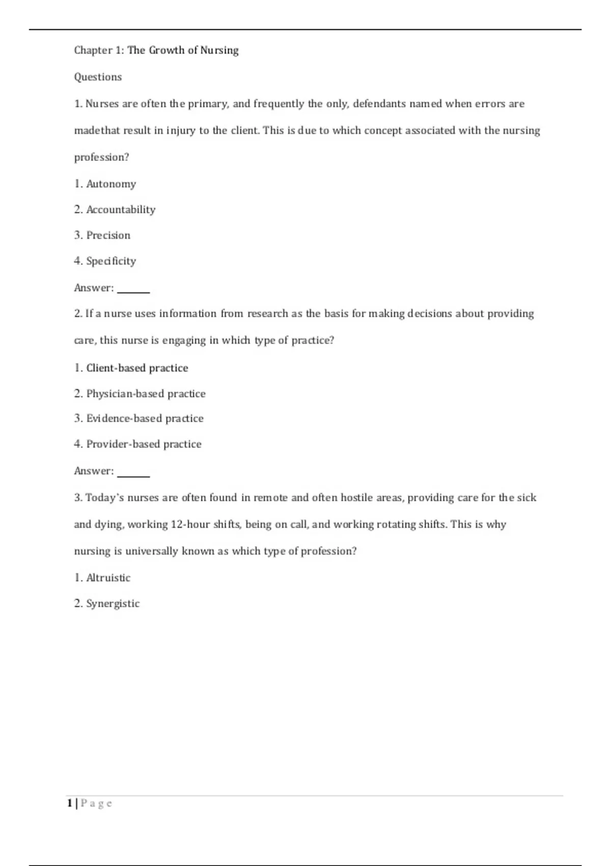 TEST BANK NURSING NOW Today's Issues, Tomorrow's Trends 8TH EDITION CATALANOChapter 1: The Growth of Nursing Questions 1. Nurses are often the primary, and frequently the only, defendants named when errors are made that result in injury to the client. This is due to which concept associated with the nursing profession? 1. Autonomy 2. Accountability 3. Precision 4. Specificity Answer: 2. If a nurse uses information from research as the basis for making decisions about providing care, this nurse is engaging in which type of practice? 1. Client-based practice 2. Physician-based practice 3. Evidence-based practice 4. Provider-based practice Answer: 3. Today’s nurses are often found in remote and often hostile areas, providing care for the sick and dying, working 12-hour shifts, being on call, and working rotating shifts. This is why nursing is universally known as which type of profession? 1. Altruistic 2. Synergistic NURSINGTB.COM 1 | P a g e3. Optimistic 4. Pragmatic Answer: 4. With Florence Nightingale’s radically new idea about a separate educational setting for nurses, the nursing profession took its first steps toward which of the following? 1. Autonomy 2. Accountability 3. Precision 4. Specificity Answer: 5. If an advanced practice nurse is prepared to provide direct client care in primary care settings, focusing on health promotion, illness prevention, early diagnosis, and treatment of common health problems, this nurse is acting in which advanced practice role? 1. Nurse practitioner 2. Certified nurse midwife 3. Clinical nurse specialist 4. Case manager Answer: 6. If an advanced practice nurse focuses on the care of pregnant women before, during, and after the birth process, this nurse is acting in which advanced practice role? 1. Nurse practitioner 2. Certified nurse midwife 3. Clinical nurse specialist NURSINGTB.COM 2 | P a g e4. Case manager Answer: 7. If an advanced practice nurse is comfortable working in high-tech environments with seriously ill individuals and their families, this nurse is acting in which advanced practice role? 1. Nurse practitioner 2. Certified nurse midwife 3. Clinical nurse specialist 4. Case manager Answer: 8. If an advanced practice nurse functions to coordinate services for clients with high-risk or long-term health problems who require access to the full continuum of health-care services, this nurse is acting in which advanced practice role? 1. Nurse practitioner 2. Certified nurse midwife 3. Clinical nurse specialist 4. Case manager Answer: 9. If a nurse taking action to perform the activities that promote patient care, this nurse is acting with which of the following? 1. Power 2. Control 3. Authority 4. Empowerment NURSINGTB.COM 3 | P a g eAnswer: 10. Although the client likely would prefer to avoid taking medications, tolerating uncomfortable treatments, and participating in demanding activities, he or she cooperates because the nurse has a good relationship with the client; this is an example of which type of power? 1. Referent power 2. Expert power 3. Coercive power 4. Legitimate power Answer: 11. By demonstrating their knowledge of the client’s condition, recent laboratory tests, and other elements that are vital to the client’s recovery, nurses demonstrate which type of power? 1. Referent power 2. Expert power 3. Coercive power 4. Legitimate power Answer: 12. If a nurse employs the underlying principles in the process of behavior modification, the nurse is utilizing which type of power? 1. Referent power 2. Expert power 3. Coercive power 4. Power of rewards Answer: NURSINGTB.COM 4 | P a g e13. If a nurse uses which type of power, it can destroy therapeutic and personal relationships, and it can also be considered unethical and even illegal in certain situations? 1. Referent power 2. Expert power 3. Coercive power 4. Power of rewards Answer: 14. Nursing decisions made about client care can come only from individuals who have which source of power? 1. Referent power 2. Expert power 3. Coercive power 4. Legitimate power Answer: 15. The first, and certainly the most important, way in which nurses can gain power in all areas is through which action? 1. Professional unity 2. Political activity 3. Accountability and professionalism 4. Networking Answer: NURSINGTB.COM 5 | P a g eQuestions, Answers, and Rationales 1. Nurses are often the primary, and frequently the only, defendants named when errors are made that result in injury to the client. This is due to which concept associated with the nursing profession? 1. Autonomy 2. Accountability 3. Precision 4. Specificity ANS: 2 Page: 00 Feedback NURSINGTB.COM 1. This is incorrect. The autonomous nature of the nursing profession has no impact on nurses acting as defendants in court cases. 2. This is correct. Nurses must be accountable and demonstrate a high level of responsibility for the care and services they provide. 3. This is incorrect. The precision in which nurses must practice has no impact on nurses acting as defendants in court cases. 4. This is incorrect. The specificity in which nurses must practice has no impact on nurses acting as defendants in court cases. 2. If a nurse uses information from research as the basis for making decisions about providing care, this nurse is engaging in which type of practice? 6 | P a g e1. Client-based practice 2. Physician-based practice 3. Evidence-based practice 4. Provider-based practice ANS: 3 Page: 00 Feedback 1. This is incorrect. Client-based care does not use information from research as the basis for making decisions. 2. This is incorrect. Physician-based care does not use information from research as the basis for making decisions. 3. This is correct. Evidence-based care uses information from research as the basis for making decisions. NURSINGTB.COM 4. This is incorrect. Provider-based care does not use information from research as the basis for making decisions. 3. Today’s nurses are often found in remote and often hostile areas, providing c