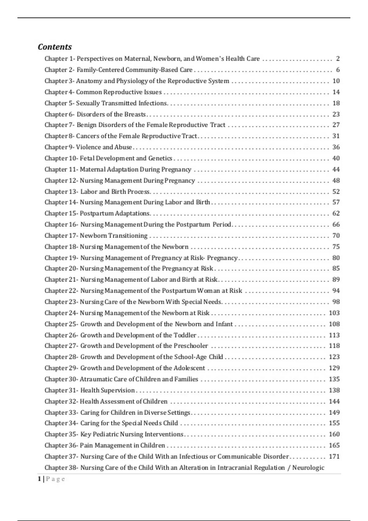Test Bank Maternity and Pediatric Nursing 3rd Edition by Ricci, Kyle and CarmanContents Chapter 1- Perspectives on Maternal, Newborn, and Women’s Health Care ..................... 2 Chapter 2- Family-Centered Community-Based Care ................................ ......... 6 Chapter 3- Anatomy and Physiology of the Reproductive System ............................. 10 Chapter 4- Common Reproductive Issues ................................ ................. 14 Chapter 5- Sexually Transmitted Infections ................................ ................ 18 Chapter 6- Disorders of the Breasts ................................ ...................... 23 Chapter 7- Benign Disorders of the Female Reproductive Tract .............................. 27 Chapter 8- Cancers of the Female Reproductive Tract ................................ ....... 31 Chapter 9- Violence and Abuse ................................ .......................... 36 Chapter 10- Fetal Development and Genetics ................................ .............. 40 Chapter 11- Maternal Adaptation During Pregnancy ................................ ........ 44 Chapter 12- Nursing Management During Pregnancy ................................ ....... 48 Chapter 13- Labor and Birth Process ................................ ..................... 52 Chapter 14- Nursing Management During Labor and Birth ................................ ... 57 Chapter 15- Postpartum Adaptations ................................ ..................... 62 Chapter 16- Nursing Management During the Postpartum Period ............................. 66 Chapter 17- Newborn Transitioning ................................ ..................... 70 Chapter 18- Nursing Management of the Newborn ................................ ......... 75 Chapter 19- Nursing Management of Pregnancy at Risk- Pregnancy ........................... 80 Chapter 20- Nursing Management of the Pregnancy at Risk ................................ .. 85 Chapter 21- Nursing Management of Labor and Birth at Risk ................................ . 89 Chapter 22- Nursing Management of the Postpartum Woman at Risk ......................... 94 Chapter 23- Nursing Care of the Newborn With Special Needs ................................ 98 Chapter 24- Nursing Management of the Newborn at Risk ................................ .. 103 Chapter 25- Growth and Development of the Newborn and Infant ........................... 108 Chapter 26- Growth and Development of the Toddler ................................ ...... 113 Chapter 27- Growth and Development of the Preschooler ................................ .. 118 Chapter 28- Growth and Development of the School-Age Child .............................. 123 Chapter 29- Growth and Development of the Adolescent ................................ ... 129 Chapter 30- Atraumatic Care of Children and Families ................................ ..... 135 Chapter 31- Health Supervision ................................ ........................ 138 Chapter 32- Health Assessment of Children ................................ .............. 144 Chapter 33- Caring for Children in Diverse Settings ................................ ........ 149 Chapter 34- Caring for the Special Needs Child ................................ ........... 155 Chapter 35- Key Pediatric Nursing Interventions ................................ .......... 160 Chapter 36- Pain Management in Children ................................ ............... 165 Chapter 37- Nursing Care of the Child With an Infectious or Communicable Disorder ........... 171 Chapter 38- Nursing Care of the Child With an Alteration in Intracranial Regulation / Neurologic 1 | P a g eDisorder ................................ ................................ ........... 176 Chapter 39- Nursing Care of the Child With an Alteration in Sensory Perception / Disorder of the Eyes or Ears ................................ ................................ ........ 181 Chapter 40- Nursing Care of the Child With an Alteration in Gas Exchange / Respiratory Disorder 187 Chapter 41- Nursing Care of the Child With an Alteration in Perfusion / Cardiovascular Disorder . 191 Chapter 42- Nursing Care of the Child With an Alteration in Bowel Elimination / Gastrointestinal Disorder ................................ ................................ ........... 196 Chapter 43- Nursing Care of the Child With an Alteration in Urinary Elimination / Genitourinary Disorder ................................ ................................ ........... 201 Chapter 44- Nursing Care of the Child With an Alteration in Mobility / Neuromuscular or Musculoskeletal Disorder ................................ ............................. 206 Chapter 45- Nursing Care of the Child With an Alteration in Tissue Integrity / Integumentary Disorder ................................ ................................ ........... 217 Chapter 46- Nursing Care of the Child With an Alteration in Cellular Regulation / Hematologic or Neoplastic Disorder ................................ ................................ . 221 Chapter 47- Nursing Care of the Child With an Alteration in Immunity or Immunologic Disorder . 231 Chapter 48- Nursing Care of the Child With an Alteration in Metabolism / Endocrine Disorder ... 236 Chapter 49- Nursing Care of the Child With an Alteration in Genetics ......................... 241 Chapter 50- Nursing Care of the Child With an Alteration in Behavior, Cognition, or Development 247 Chapter 51- Nursing Care During a Pediatric Emergency ................................ ... 252 Chapter 1- Perspectives on Maternal, Newborn, and Women’s Health Care 1. The United States ranks 50th in the world for maternal mortality and 41st among industrialized nations for infant mortality rate. When developing programs to assist in decreasing these rates, which factor would most likely need to be addressed as having the greatest impact? A) Resolving all language and cultural differences B) Assuring e