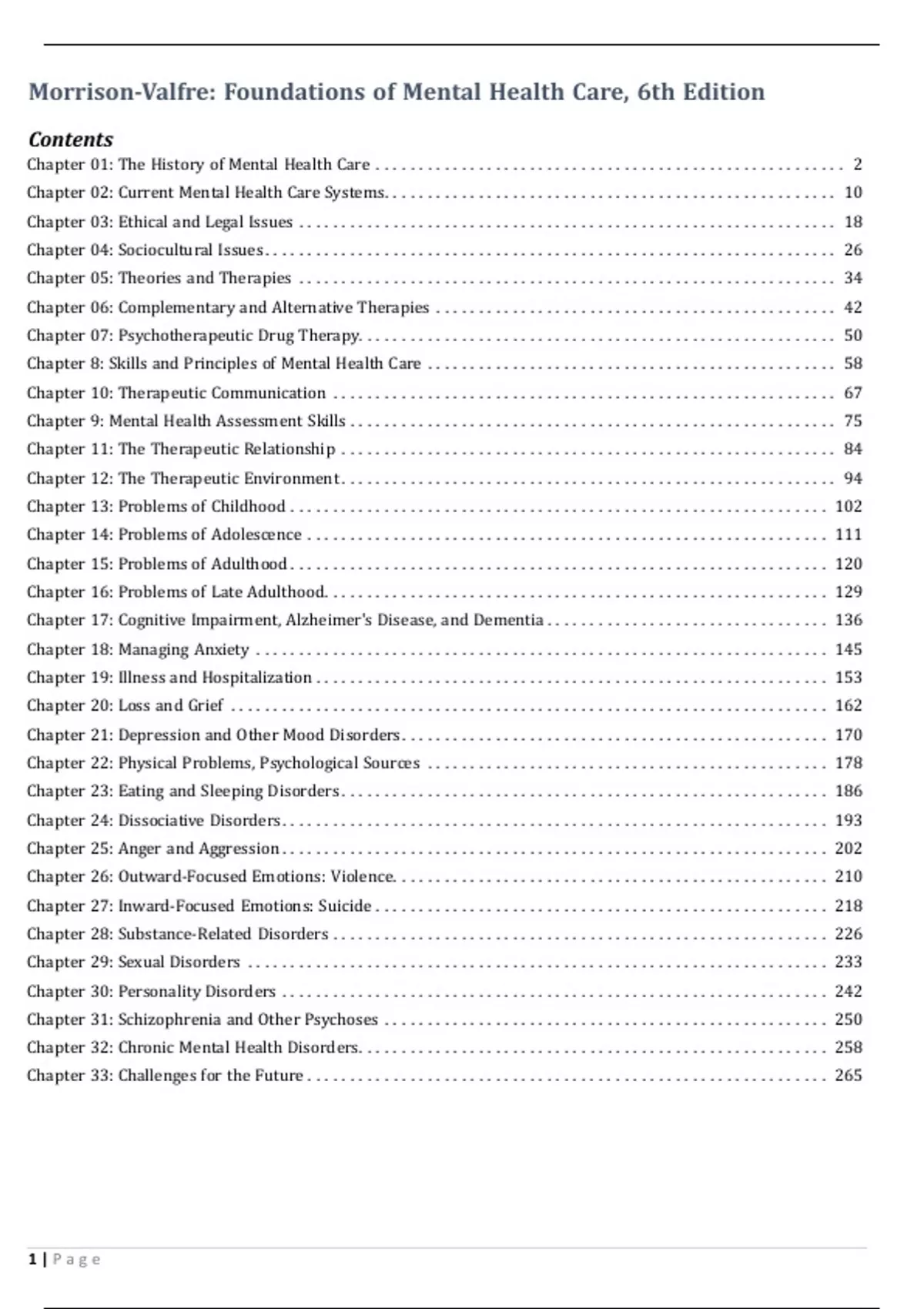 Test Bank Morrison-Valfre Foundations of Mental Health Care, 6th EditionContents Chapter 01: The History of Mental Health Care ................................ ....................... 2 Chapter 02: Current Mental Health Care Systems ................................ ..................... 10 Chapter 03: Ethical and Legal Issues ................................ ............................... 18 Chapter 04: Sociocultural Issues ................................ ................................ ... 26 Chapter 05: Theories and Therapies ................................ ............................... 34 Chapter 06: Complementary and Alternative Therapies ................................ ............... 42 Chapter 07: Psychotherapeutic Drug Therapy ................................ ........................ 50 Chapter 8: Skills and Principles of Mental Health Care ................................ ................ 58 Chapter 10: Therapeutic Communication ................................ ........................... 67 Chapter 9: Mental Health Assessment Skills ................................ ......................... 75 Chapter 11: The Therapeutic Relationship ................................ .......................... 84 Chapter 12: The Therapeutic Environment ................................ .......................... 94 Chapter 13: Problems of Childhood ................................ ............................... 102 Chapter 14: Problems of Adolescence ................................ ............................. 111 Chapter 15: Problems of Adulthood ................................ ............................... 120 Chapter 16: Problems of Late Adulthood ................................ ........................... 129 Chapter 17: Cognitive Impairment, Alzheimer's Disease, and Dementia ................................ . 136 Chapter 18: Managing Anxiety ................................ ................................ ... 145 Chapter 19: Illness and Hospitalization ................................ ............................ 153 Chapter 20: Loss and Grief ................................ ................................ ...... 162 Chapter 21: Depression and Other Mood Disorders ................................ .................. 170 Chapter 22: Physical Problems, Psychological Sources ................................ ............... 178 Chapter 23: Eating and Sleeping Disorders ................................ ......................... 186 Chapter 24: Dissociative Disorders ................................ ................................ 193 Chapter 25: Anger and Aggression ................................ ................................ 202 Chapter 26: Outward-Focused Emotions: Violence ................................ ................... 210 Chapter 27: Inward-Focused Emotions: Suicide ................................ ..................... 218 Chapter 28: Substance-Related Disorders ................................ .......................... 226 Chapter 29: Sexual Disorders ................................ ................................ .... 233 Chapter 30: Personality Disorders ................................ ................................ 242 Chapter 31: Schizophrenia and Other Psychoses ................................ .................... 250 Chapter 32: Chronic Mental Health Disorders ................................ ....................... 258 Chapter 33: Challenges for the Future ................................ ............................. 265 1 | P a g eChapter 01: The History of Mental Health Care MULTIPLE CHOICE 1. The belief of the ancient Greek philosopher Plato that the rational soul controlled the irrational soul could be compared with the belief of the more recent psychological theorist: a. Freud b. Pinel c. Fisher d. Rush ANS: A Sigmund Freud believed that mental illness was, in part, caused by forces both within and outside the personality. Philippe Pinel advocated acceptance of mentally ill individuals as human beings in need of medical assistance. Alice Fisher was a Florence Nightingale nurse who cared for the mentally ill, and Dr. Benjamin Rush was the author of the book Diseases ofthe Mind. PTS: 1 OBJ: 2 DIF: Cognitive Level: Comprehension TOP: Early Years of Mental Health REF: p. 4 KEY: Nursing Process Step: Assessment MSC: Client Needs: Psychosocial Integrity 2. During the mid-1500s, behaviors associated with mental illness were more accurately recorded by professionals. This practice led to for different abnormal behaviors. a. Classifications b. Diagnosing c. Treatment d. Education ANS: A Classification of abnormal behaviors did not begin until this time, after the practice of more accurate recording of behaviors was begun. Diagnoses, treatment guidelines, and any education regarding mental health disorders were not available during this period. PTS: 1 OBJ: 3 DIF: Cognitive Level: Knowledge REF: p. 5 TOP: Mental Illness During the Renaissance KEY: Nursing Process Step: Assessment MSC: Client Needs: Psychosocial Integrity 3. During the latter part of the eighteenth century, psychiatry became a separate branch of medicine, and inhumane treatment was greatly diminished by the French hospital director: a. Dix b. Beers c. Pinel d. Carter ANS: C 2 | P a g ePhilippe Pinel advocated acceptance of the mentally ill, as well as proper treatment. Dorothea Dix crusaded for construction of mental health hospitals. Clifford Beers wrote the book A Mind That Found Itself. President Jimmy Carter established the President’s Commission on Mental Health in 1978. PTS: 1 OBJ: 4 DIF: Cognitive Level: Knowledge REF: p. 5 TOP: Mental Illness in the Eighteenth Century KEY: Nursing Process Step: Assessment MSC: Client Needs: Psychosocial Integrity 4. In 1841, surveyed asylums, jails, and almshouses throughout the United States, Canada, and Scotland and is credited with bringing about public awareness and reform for the care of the mentally ill. a. Sigmund Freud b. John Cade c. Fl
