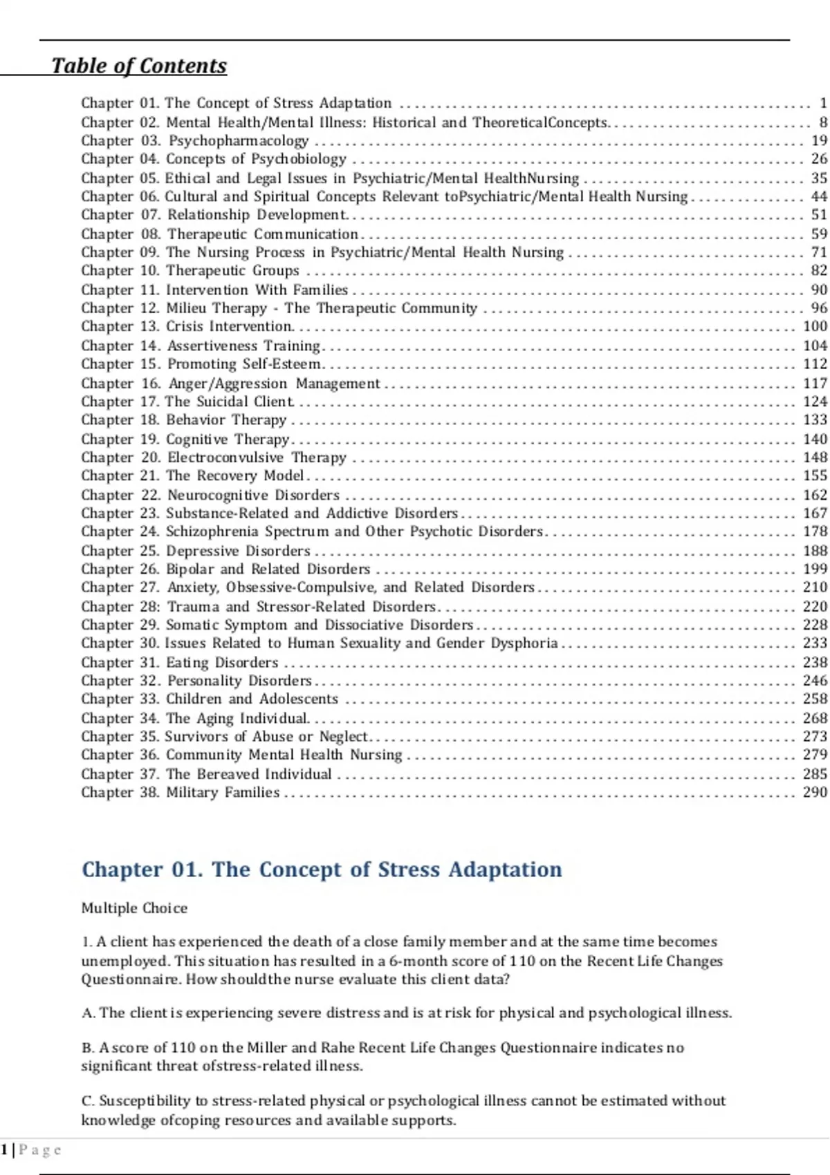 TEST BANK PSYCHIATRIC MENTAL HEALTH NURSING BY MARY TOWNSEND 9TH EDITIONTable of Contents Chapter 01. The Concept of Stress Adaptation ................................ ...................... 1 Chapter 02. Mental Health/Mental Illness: Historical and Theoretical Concepts ........................... 8 Chapter 03. Psychopharmacology ................................ ................................ 19 Chapter 04. Concepts of Psychobiology ................................ ........................... 26 Chapter 05. Ethical and Legal Issues in Psychiatric/Mental Health Nursing ............................. 35 Chapter 06. Cultural and Spiritual Concepts Relevant to Psychiatric/Mental Health Nursing ............... 44 Chapter 07. Relationship Development ................................ ............................ 51 Chapter 08. Therapeutic Communication ................................ .......................... 59 Chapter 09. The Nursing Process in Psychiatric/Mental Health Nursing ............................... 71 Chapter 10. Therapeutic Groups ................................ ................................ . 82 Chapter 11. Intervention With Families ................................ ........................... 90 Chapter 12. Milieu Therapy - The Therapeutic Community ................................ .......... 96 Chapter 13. Crisis Intervention ................................ ................................ .. 100 Chapter 14. Assertiveness Training ................................ .............................. 104 Chapter 15. Promoting Self-Esteem ................................ .............................. 112 Chapter 16. Anger/Aggression Management ................................ ...................... 117 Chapter 17. The Suicidal Client ................................ ................................ .. 124 Chapter 18. Behavior Therapy ................................ ................................ .. 133 Chapter 19. Cognitive Therapy ................................ ................................ .. 140 Chapter 20. Electroconvulsive Therapy ................................ .......................... 148 Chapter 21. The Recovery Model ................................ ................................ 155 Chapter 22. Neurocognitive Disorders ................................ ........................... 162 Chapter 23. Substance-Related and Addictive Disorders ................................ ............ 167 Chapter 24. Schizophrenia Spectrum and Other Psychotic Disorders ................................ . 178 Chapter 25. Depressive Disorders ................................ ............................... 188 Chapter 26. Bipolar and Related Disorders ................................ ....................... 199 Chapter 27. Anxiety, Obsessive-Compulsive, and Related Disorders ................................ .. 210 Chapter 28: Trauma and Stressor-Related Disorders ................................ ............... 220 Chapter 29. Somatic Symptom and Dissociative Disorders ................................ .......... 228 Chapter 30. Issues Related to Human Sexuality and Gender Dysphoria ............................... 233 Chapter 31. Eating Disorders ................................ ................................ ... 238 Chapter 32. Personality Disorders ................................ ............................... 246 Chapter 33. Children and Adolescents ................................ ........................... 258 Chapter 34. The Aging Individual ................................ ................................ 268 Chapter 35. Survivors of Abuse or Neglect ................................ ........................ 273 Chapter 36. Community Mental Health Nursing ................................ ................... 279 Chapter 37. The Bereaved Individual ................................ ............................ 285 Chapter 38. Military Families ................................ ................................ ... 290 Chapter 01. The Concept of Stress Adaptation Multiple Choice 1. A client has experienced the death of a close family member and at the same time becomes unemployed. This situation has resulted in a 6-month score of 110 on the Recent Life Changes Questionnaire. How should the nurse evaluate this client data? A. The client is experiencing severe distress and is at risk for physical and psychological illness. B. A score of 110 on the Miller and Rahe Recent Life Changes Questionnaire indicates no significant threat of stress-related illness. C. Susceptibility to stress-related physical or psychological illness cannot be estimated without knowledge of coping resources and available supports. 1 | P a g eD. The client may view these losses as challenges and perceive them as opportunities. ANS: C The Recent Life Changes Questionnaire is an expanded version of the Schedule of Recent Experiences and the Rahe-Holmes Social Readjustment Rating Scale. A 6-month score of 300 or more, or a year-score total of 500 or more, indicates high stress in a clients life. However, positive coping mechanisms and strong social support can limit susceptibility to stress-related illnesses. KEY: Cognitive Level: Application | Integrated Processes: Nursing Process: Evaluation | Client Need: Psychosocial Integrity 2. A physically and emotionally healthy client has just been fired. During a routine office visit he states to a nurse: Perhaps this was the best thing to happen. Maybe Ill look into pursuing an art degree. How should the nurse characterize the clients appraisal of the job loss stressor? A. Irrelevant B. Harm/loss C. Threatening D. Challenging ANS: D The client perceives the situation of job loss as a challenge and an opportunity for growth. KEY: Cognitive Level: Application | Integrated Processes: Nursing Process: Assessment | Client Need: Psychosocial Integrity 3. Which client statement should alert a nurse that a client may be responding maladaptively to stress? A. Ive found th