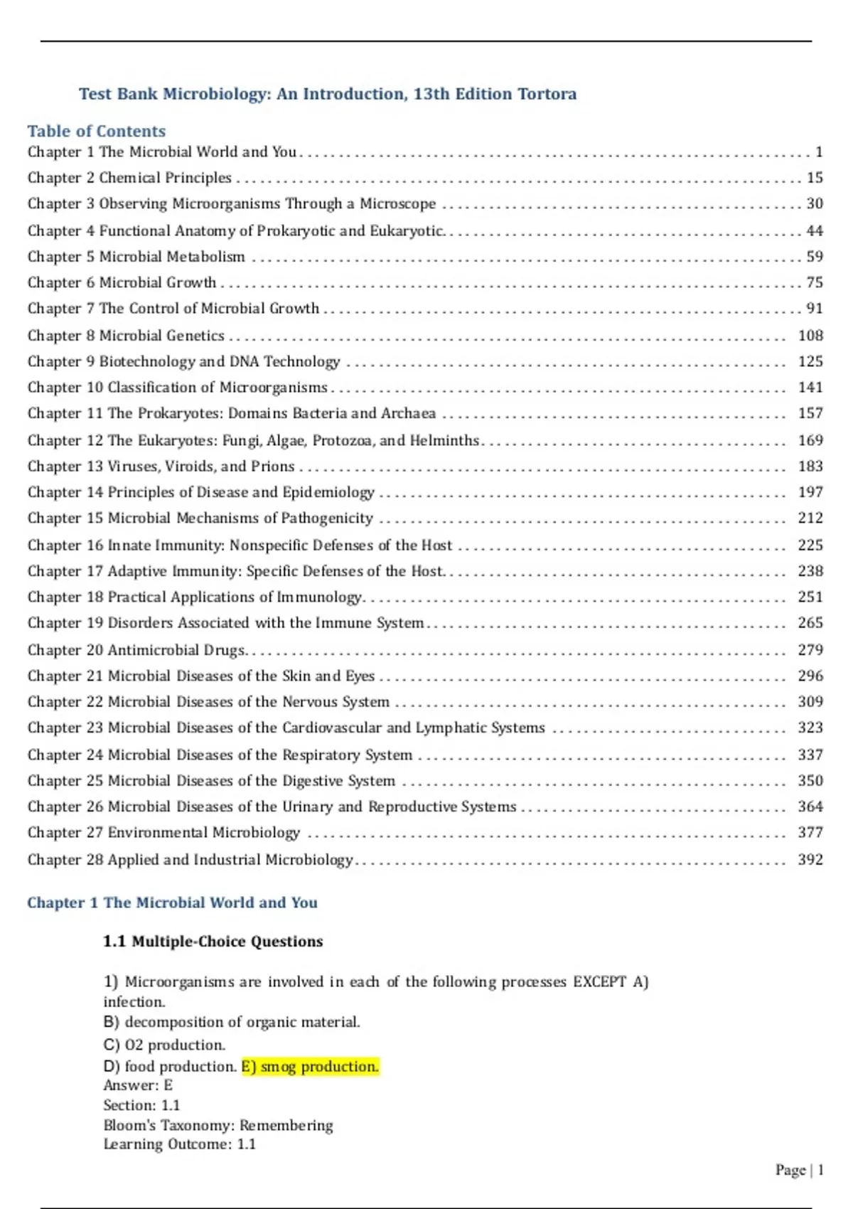 Test Bank Microbiology An Introduction, 13th Edition TortoraTable of Contents Chapter 1 The Microbial World and You ................................ ................................ . 1 Chapter 2 Chemical Principles ................................ ................................ ........ 15 Chapter 3 Observing Microorganisms Through a Microscope ................................ .............. 30 Chapter 4 Functional Anatomy of Prokaryotic and Eukaryotic................................ .............. 44 Chapter 5 Microbial Metabolism ................................ ................................ ...... 59 Chapter 6 Microbial Growth ................................ ................................ .......... 75 Chapter 7 The Control of Microbial Growth ................................ ............................. 91 Chapter 8 Microbial Genetics ................................ ................................ ....... 108 Chapter 9 Biotechnology and DNA Technology ................................ ........................ 125 Chapter 10 Classification of Microorganisms ................................ .......................... 141 Chapter 11 The Prokaryotes: Domains Bacteria and Archaea ................................ ............ 157 Chapter 12 The Eukaryotes: Fungi, Algae, Protozoa, and Helminths ................................ ....... 169 Chapter 13 Viruses, Viroids, and Prions ................................ .............................. 183 Chapter 14 Principles of Disease and Epidemiology ................................ .................... 197 Chapter 15 Microbial Mechanisms of Pathogenicity ................................ .................... 212 Chapter 16 Innate Immunity: Nonspecific Defenses of the Host ................................ .......... 225 Chapter 17 Adaptive Immunity: Specific Defenses of the Host ................................ ............ 238 Chapter 18 Practical Applications of Immunology ................................ ...................... 251 Chapter 19 Disorders Associated with the Immune System ................................ .............. 265 Chapter 20 Antimicrobial Drugs ................................ ................................ ..... 279 Chapter 21 Microbial Diseases of the Skin and Eyes ................................ .................... 296 Chapter 22 Microbial Diseases of the Nervous System ................................ .................. 309 Chapter 23 Microbial Diseases of the Cardiovascular and Lymphatic Systems .............................. 323 Chapter 24 Microbial Diseases of the Respiratory System ................................ ............... 337 Chapter 25 Microbial Diseases of the Digestive System ................................ ................. 350 Chapter 26 Microbial Diseases of the Urinary and Reproductive Systems ................................ .. 364 Chapter 27 Environmental Microbiology ................................ ............................. 377 Chapter 28 Applied and Industrial Microbiology ................................ ....................... 392 Chapter 1 The Microbial World and You 1.1 Multiple-Choice Questions 1) Microorganisms are involved in each of the following processes EXCEPT A) infection. B) decomposition of organic material. C) O2 production. D) food production. E) smog production. Answer: E Section: 1.1 Bloom's Taxonomy: Remembering Learning Outcome: 1.1 Page | 1Global Outcome: 5 2) Each of the following organisms would be considered a microbe EXCEPT A) yeast. B) protozoan. C) bacterium. D) mushroom. E) virus. Answer: D Section: 1.1 Bloom's Taxonomy: Remembering Learning Outcome: 1.4 3) The term used to describe a disease-causing microorganism is A) microbe. B) bacterium. C) virus. D) pathogen. E) infection. Answer: D Section: 1.1 Bloom's Taxonomy: Remembering Learning Outcome: 1.1 4) Common commercial benefits of microorganisms include synthesis of A) riboflavin. B) acetone. C) insulin. D) aspirin. E) riboflavin, acetone and insulin. Answer: E Section: 1.1 Bloom's Taxonomy: Remembering ASMcue Outcome: 6.3 Learning Outcome: 1.1 5) What factors contribute to the rising incidence of antibiotic resistance? A) overuse of the specific drugs B) misuse of the specific drugs C) random mutations in bacterial genomes D) random mutations, overuse and misuse of specific drugs E) overuse and misuse of specific drugs Answer: D Section: 1.5 Bloom's Taxonomy: Understanding ASMcue Outcome: 4.1 Learning Outcome: 1.19 Global Outcome: 5 6) The formal system for classifying and naming organisms was developed by A) Robert Koch. B) Ignaz Semmelweis. C) Aristotle. D) Carolus Linnaeus. E) Louis Pasteur. Answer: Page | 2D Section: 1.2 Bloom's Taxonomy: Remembering Learning Outcome: 1.3 7) In the name Staphylococcus aureus, aureus is the A) genus. B) domain name. C) species. D) kingdom. E) family name. Answer: C Section: 1.2 Bloom's Taxonomy: Understanding Learning Outcome: 1.3 8) A prokaryotic cell may possess each of the following cellular components EXCEPT A) flagella. B) a nucleus. C) ribosomes. D) a cell wall. E) a cell membrane. Answer: B Section: 1.2 Bloom's Taxonomy: Remembering ASMcue Outcome: 2.1 Learning Outcome: 1.4 9) Which of the following is NOT associated with viruses? A) organelles B) nucleic acid C) envelope D) chemical reactions E) protein coat Answer: A Section: 1.2 Bloom's Taxonomy: Understanding ASMcue Outcome: 2.1 Learning Outcome: 1.4 10) Figure 1.1 The bacterial shape of the cells in the scanning electron micrograph shown in Figure 1.1 would best be described as A) bacillus. Page | 3B) spiral. C) coccus. D) ovoid. E) columnar. Answer: A Section: 1.2 Bloom's Taxonomy: Understanding ASMcue Outcome: 2.1 Learning Outcome: 1.4 11) Protozoan motility structures include A) cilia. B) flagella. C) pseudopods. D) cilia and pseudopods only. E) cilia, flagella, and pseudopods. Answer: E Section: 1.2 Bloom's Taxonomy: Remembering Learning Outcome: 1.4 12) Viruses are not considered living orga