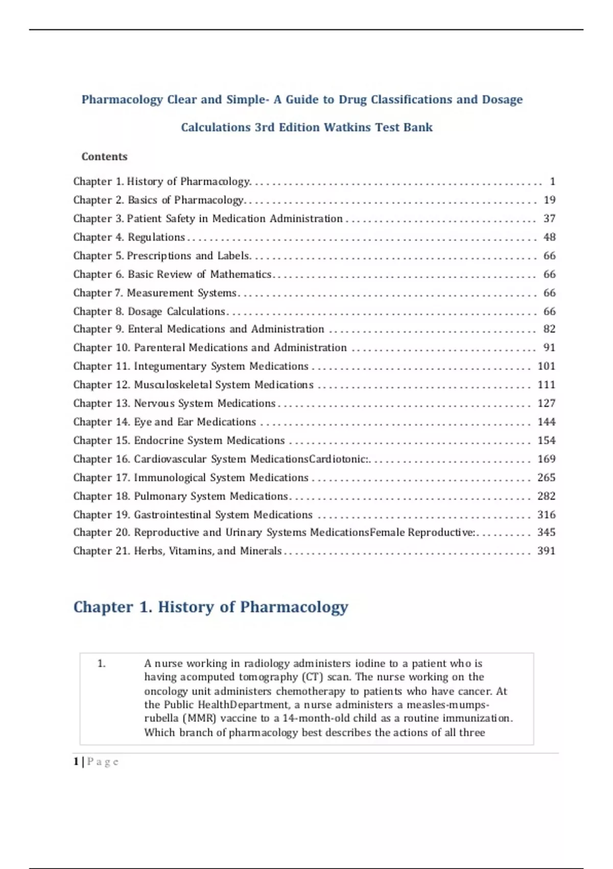 Test Bank Pharmacology Clear and Simple A Guide to Drug Classifications and Dosage Calculations 3rd Edition WatkinsContents Chapter 1. History of Pharmacology ................................ .................... 1 Chapter 2. Basics of Pharmacology ................................ .................... 19 Chapter 3. Patient Safety in Medication Administration ................................ .. 37 Chapter 4. Regulations ................................ .............................. 48 Chapter 5. Prescriptions and Labels ................................ ................... 66 Chapter 6. Basic Review of Mathematics ................................ ............... 66 Chapter 7. Measurement Systems ................................ ..................... 66 Chapter 8. Dosage Calculations ................................ ....................... 66 Chapter 9. Enteral Medications and Administration ................................ ..... 82 Chapter 10. Parenteral Medications and Administration ................................ . 91 Chapter 11. Integumentary System Medications ................................ ....... 101 Chapter 12. Musculoskeletal System Medications ................................ ...... 111 Chapter 13. Nervous System Medications ................................ ............. 127 Chapter 14. Eye and Ear Medications ................................ ................ 144 Chapter 15. Endocrine System Medications ................................ ........... 154 Chapter 16. Cardiovascular System Medications Cardiotonic: ............................. 169 Chapter 17. Immunological System Medications ................................ ....... 265 Chapter 18. Pulmonary System Medications ................................ ........... 282 Chapter 19. Gastrointestinal System Medications ................................ ...... 316 Chapter 20. Reproductive and Urinary Systems Medications Female Reproductive: .......... 345 Chapter 21. Herbs, Vitamins, and Minerals ................................ ............ 391 Chapter 1. History of Pharmacology 1. A nurse working in radiology administers iodine to a patient who is having a computed tomography (CT) scan. The nurse working on the oncology unit administers chemotherapy to patients who have cancer. At the Public Health Department, a nurse administers a measles-mumpsrubella (MMR) vaccine to a 14-month-old child as a routine immunization. Which branch of pharmacology best describes the actions of all three 1 | P a g enurses? A) B) C) D) Ans: Pharmacoeconomics Pharmacotherapeutics Pharmacodynamics Pharmacokinetics B Feedback: Pharmacology is the study of the biologic effects of chemicals. Nurses are involved with clinical pharmacology or pharmacotherapeutics, which is a branch of pharmacology that deals with the uses of drugs to treat, prevent, and diagnose disease. The radiology nurse is administering a drug to help diagnose a disease. The oncology nurse is administering a drug to help treat a disease. Pharmacoeconomics includes any costs involved in drug therapy. Pharmacodynamics involves how a drug affects the body and pharmacokinetics is how the body acts on the body. 2. A physician has ordered intramuscular (IM) injections of morphine, a narcotic, every 4 hours as needed for pain in a motor vehicle accident victim. The nurse is aware this drug has a high abuse potential. Under what category would morphine be classified? A) B) C) D) Ans: Schedule I Schedule II Schedule III Schedule IV B 2 | P a g eFeedback: Narcotics with a high abuse potential are classified as Schedule II drugs because of severe dependence liability. Schedule I drugs have high abuse potential and no accepted medical use. Schedule III drugs have a lesser abuse potential than II and an accepted medical use. Schedule IV drugs have low abuse potential and limited dependence liability. 3. A) B) C) D) Ans: When involved in phase III drug evaluation studies, what responsibilities would the nurse have? Working with animals who are given experimental drugs Choosing appropriate patients to be involved in the drug study Monitoring and observing patients closely for adverse effects Conducting research to determine effectiveness of the drug C Feedback: Phase III studies involve use of a drug in a vast clinical population in which patients are asked to record any symptoms they experience while taking the drugs. Nurses may be responsible for helping collect and analyze the information to be shared with the Food and Drug Administration (FDA) but would not conduct research independently because nurses do not prescribe medications. Use of animals in drug testing is done in the preclinical trials. Select patients who are involved in phase II studies to participate in studies where the participants have the disease the drug is intended to treat. These patients are monitored closely for drug action and adverse effects. Phase I studies involve healthy human volunteers who are usually paid for their participation. Nurses may observe for adverse effects and toxicity. 4. A) B) C) D) Ans: What concept is considered when generic drugs are substituted for brand name drugs? Bioavailability Critical concentration Distribution Half-life A Feedback: 3 | P a g eBioavailability is the portion of a dose of a drug that reaches the systemic circulation and is available to act on body cells. Binders used in a generic drug may not be the same as those used in the brand name drug. Therefore, the way the body breaks down and uses the drug may differ, which may eliminate a generic drug substitution. Critical concentration is the amount of a drug that is needed to cause a therapeutic effect and should not differ between generic and brand name medications. Distribution is the phase of pharmacokinetics, which involves the movement of a drug to the bodys tissues and is the same in generic and brand name drugs. A drugs half-life is the time it takes for the amount of drug to decrease to half the peak level, which should not c