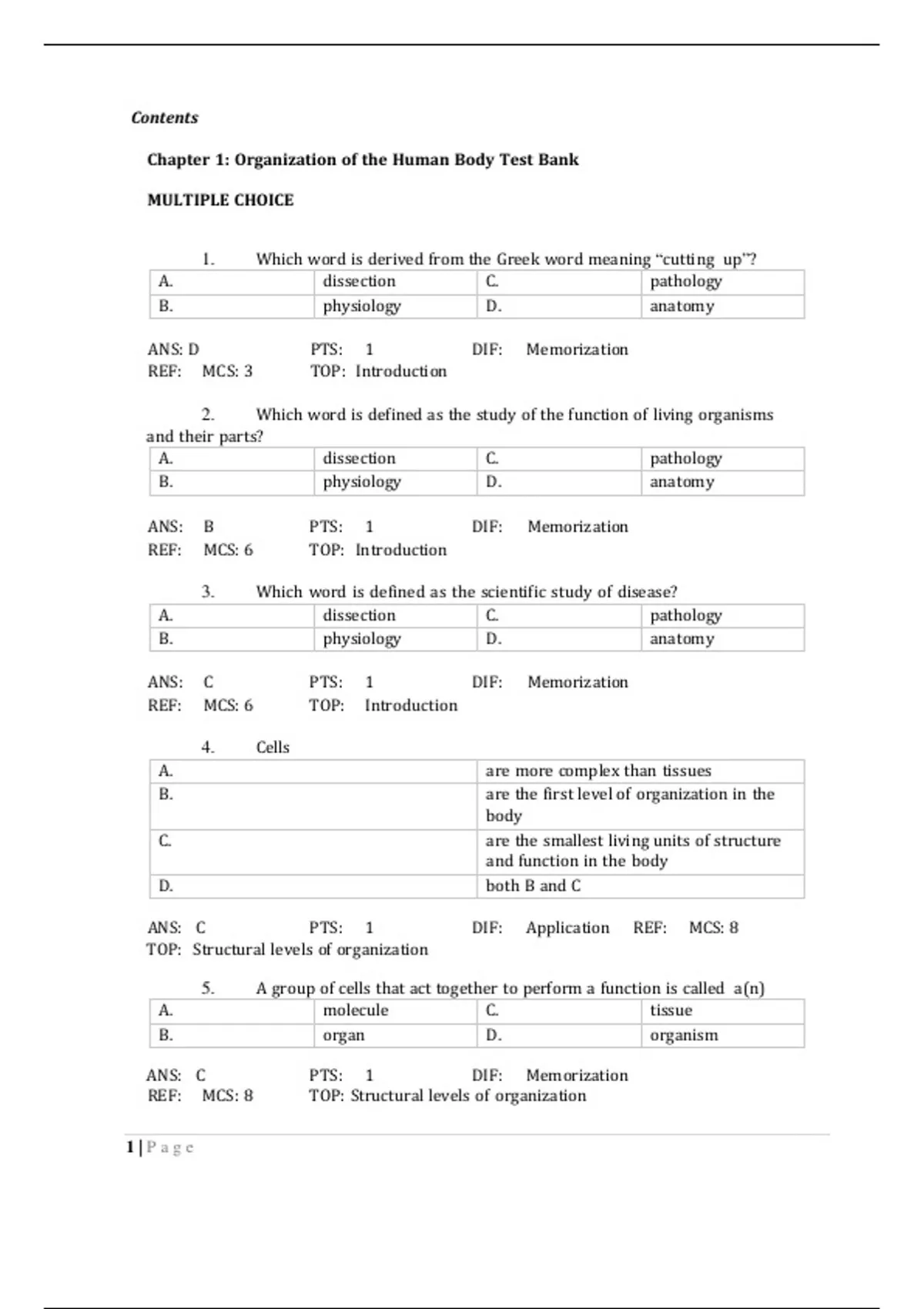 Test Bank Memmler’s The Human Body in Health and Disease 14th Edition Cohen HullContents Chapter 1: Organization of the Human Body Test Bank MULTIPLE CHOICE 1. Which word is derived from the Greek word meaning “cutting up”? A. B. ANS: D REF: MCS: 3 2. and their parts? A. B. ANS: B REF: MCS: 6 3. A. B. ANS: C REF: MCS: 6 4. A. B. C. D. ANS: C PTS: 1 TOP: Structural levels of organization 5. Cells are more complex than tissues are the first level of organization in the body are the smallest living units of structure and function in the body both B and C DIF: Application REF: MCS: 8 A group of cells that act together to perform a function is called a(n) A. B. ANS: C REF: MCS: 8 1 | P a g e molecule organ PTS: 1 C. D. DIF: Memorization TOP: Structural levels of organization tissue organism dissection physiology PTS: 1 TOP: Introduction Which word is defined as the study of the function of living organisms dissection physiology PTS: 1 TOP: Introduction Which word is defined as the scientific study of disease? dissection C. physiology PTS: 1 TOP: Introduction D. DIF: Memorization pathology anatomy C. D. DIF: Memorization pathology anatomy C. D. DIF: Memorization pathology anatomy6. A. B. ANS: A The heart is an example of a(n) organ tissue PTS: 1 TOP: Structural levels of organization 7. C. D. organism system DIF: Application REF: MCS: 8 The levels of organization from most simple to most complex are A. B. C. D. ANS: D REF: MCS: 7 8. PTS: 1 cell chemical system tissue cell system chemical system chemical system chemical tissue cell cell tissue DIF: Memorization TOP: Structural levels of organization When using directional terms to describe the body, it is assumed that the body is in what position? A. supine B. ANS: B REF: MCS: 9 9. A. B. C. D. ANS: A REF: MCS: 9 PTS: 1 DIF: Memorization TOP: Anatomical position 10. The prone position A. B. C. D. ANS: C REF: MCS: 9 2 | P a g e describes the body lying face up is also called the anatomical position describes the body lying face down both B and C anatomical PTS: 1 C. D. DIF: Memorization TOP: Anatomical position The supine position describes the body lying face up is also called anatomical position describes the body lying face down both A and B lateral prone organ organ organ organ tissuePTS: 1 DIF: Memorization TOP: Anatomical position 11. Because humans walk upright, the term dorsal can be used in place of the term A. B. ANS: B direction 12. A. B. ANS: D The opposite term for posterior in humans is C. superior anterior PTS: 1 TOP: Anatomical direction 13. D. ventral both B and C DIF: Application REF: MCS: 9 The opposite term for superficial is A. B. ANS: A REF: MCS: 10 14. section. A. B. ANS: B deep inferior PTS: 1 C. D. DIF: Memorization TOP: Anatomical direction The body section that divides the right ear from the left ear is a frontal sagittal PTS: 1 TOP: Planes or body sections 15. C. D. coronal transverse DIF: Application REF: MCS: 10 The body section that divides the nose from the back of the head is a section. A. B. ANS: A frontal sagittal PTS: 1 TOP: Planes or body sections 16. C. D. midsagittal transverse DIF: Application REF: MCS: 10 A section that divides the body into mirror images is a A. B. ANS: C frontal coronal PTS: 1 TOP: Planes or body sections 3 | P a g e section. C. D. midsagittal transverse DIF: Application REF: MCS: 10 posterior medial inferior posterior PTS: 1 Memorization REF: MCS: 9 C. D. DIF: TOP: Anatomical anterior distal17. A. The two major body cavities are called C. thoracic and abdominal dorsal and ventral 4 | P a g eB. thoracic and pelvic ANS: C REF: MCS: 10 18. A. B. ANS: D TOP: Body cavities 19. PTS: 1 TOP: Body cavities The liver can be found in the upper right quadrant epigastric region PTS: 1 C. D. hypogastric region both A and B DIF: Application REF: MCS: 11 The word “leg” correctly describes the A. B. ANS: B REF: MCS: 13 20. an example of A. B. ANS: A area from the hip to the foot area from the knee to the ankle PTS: 1 TOP: Body regions The human body tries to maintain a constant body temperature. This is homeostasis a positive feedback loop PTS: 1 TOP: The balance of body functions 21. C. D. an effector a sensor DIF: Application REF: MCS: 15 The part of a feedback loop that has the direct effect on the regulated condition is called A. homeostasis B. ANS: B of body functions 22. the effector PTS: 1 Memorization REF: MCS: 16 C. D. DIF: TOP: The balance The part of the feedback loop that detects a change in the regulated condition is called A. homeostasis B. ANS: C 5 | P a g e the effector PTS: 1 Memorization REF: MCS: 15 C. D. DIF: TOP: The balance the sensor the control center the sensor the control center C. D. DIF: Memorization area between the hip and the knee femoral area D. DIF: Memorization mediastinum and pleuralof body functions 23. The part of the feedback loop that compares the present condition to the homeostatic condition the body is trying to maintain is called A. homeostasis B. ANS: D REF: MCS: 15 the effector PTS: 1 C. D. DIF: Memorization TOP: The balance of body functions 24. When your body temperature drops below normal, your muscles begin to contract rapidly, making you shiver and generating heat. In this case your muscles are acting as the A. sensor B. ANS: B effector PTS: 1 C. D. DIF: Synthesis control center both A and C REF: MCS: 15 TOP: The balance of body functions 25. Which of the following body functions is an example of a positive feedback loop? A. B. C. D. ANS: D PTS: 1 TOP: The balance of body functions 26. maintaining a pH of 7.45 in the body forming a blood clot uterine contractions during labor both B and C DIF: Application REF: MCS: 16 The level of organization directly below the organ level is the A. B. ANS: C REF: MCS: 7 system cellular PTS: 1 C. D. DIF: Memorization TOP: Structural levels of organization 27. Which of these terms cannot be applied to a body in the anatomical position? A. B. ANS: C position A. B. 6 | P a g e 28. Which term means toward the head