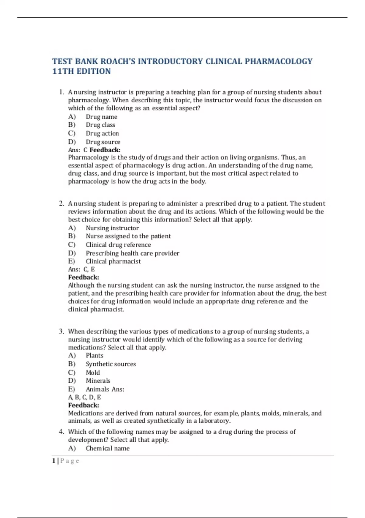 TEST BANK ROACH'S INTRODUCTORY CLINICAL PHARMACOLOGY 11TH EDITION1. A nursing instructor is preparing a teaching plan for a group of nursing students about pharmacology. When describing this topic, the instructor would focus the discussion on which of the following as an essential aspect? A) Drug name B) Drug class C) Drug action D) Drug source Ans: C Feedback: Pharmacology is the study of drugs and their action on living organisms. Thus, an essential aspect of pharmacology is drug action. An understanding of the drug name, drug class, and drug source is important, but the most critical aspect related to pharmacology is how the drug acts in the body. 2. A nursing student is preparing to administer a prescribed drug to a patient. The student reviews information about the drug and its actions. Which of the following would be the best choice for obtaining this information? Select all that apply. A) Nursing instructor B) Nurse assigned to the patient C) Clinical drug reference D) Prescribing health care provider E) Clinical pharmacist Ans: C, E Feedback: Although the nursing student can ask the nursing instructor, the nurse assigned to the patient, and the prescribing health care provider for information about the drug, the best choices for drug information would include an appropriate drug reference and the clinical pharmacist. 3. When describing the various types of medications to a group of nursing students, a nursing instructor would identify which of the following as a source for deriving medications? Select all that apply. A) Plants B) Synthetic sources C) Mold D) Minerals E) Animals Ans: A, B, C, D, E Feedback: Medications are derived from natural sources, for example, plants, molds, minerals, and animals, as well as created synthetically in a laboratory. 4. Which of the following names may be assigned to a drug during the process of development? Select all that apply. A) Chemical name 1 | P a g eB) Official name C) Pharmacologic name D) Trade name E) Nonproprietary name Ans: A, B, D, E Feedback: Throughout the process of development, drugs may have several names assigned to them including a chemical name, a generic (nonproprietary) name, an official name, and a trade or brand name. 5. A drug may be classified by which of the following? Select all that apply. A) The chemical type of the drug's active ingredient B) The way the drug is used to treat a specific condition C) The generic name of the drug D) The trade name of the drug E) The nonproprietary name of the drug Ans: A, B Feedback: A drug may be classified by the chemical type of the active ingredient or by the way it is used to treat a particular condition. Generic, trade, and nonproprietary refer to how a drug is named. 6. A group of nursing students are reviewing information about the process of drug development in the United States. The students demonstrate understanding of this process when they identify that which of the following categories are assigned by the Food and Drug Administration to newly approved drugs? Select all that apply. A) Metabolite B) Noncontrolled substance C) Prescription D) Nonprescription E) Controlled substance Ans: C, D, E Feedback: Once drugs are approved for use, the FDA assigns the drug to one of the following categories: prescription, nonprescription, or controlled substance. Metabolite refers to the inactive form of the drug. Noncontrolled substance is a term that is not used. 7. Which of the following would be most important for the nurse to do to ensure the safe use of prescription drugs in the institutional setting? Select all that apply. A) Administering drugs B) Monitoring clients for drug effects C) Prescribing drugs D) Evaluating clients for toxic effects E) Educating clients/caregivers about drugs Ans: A, B, D, E Feedback: In the institutional setting, the nurse's role to ensure safe use of prescription drugs includes administering drugs, monitoring drug effects, evaluating for toxic effects, and 2 | P a g eeducating clients and caregivers about drugs. 8. The nurse is helping a client review a prescription from the health care provider. When examining the prescription, which of the following would the nurse expect to find documented? Select all that apply. A) Name of the drug B) Dosage of the drug C) Route of drug administration D) Times of drug administration E) Licensed prescriber's signature Ans: A, B, C, D, E Feedback: The prescription must contain the client's name, the name of the drug, the dosage, the method and times of administration, and the signature of the licensed health care provider prescribing the drug. 9. After teaching a group of nursing students about nonprescription drugs, the nursing instructor determines that the teaching was successful when the students identify which of the following? Select all that apply. A) They require a licensed health care provider's signature. B) They are referred to as over-the-counter drugs. C) They can be taken without risk to the client. D) They have certain labeling requirements. E) They should be taken only as directed on the label. Ans: B, D, E Feedback: Nonprescription drugs are often referred to as over-the-counter (OTC) drugs. They do not require a prescription (a licensed health care provider's signature) but do not come without risk to the client. The federal government has imposed labeling requirements of OTC drugs and they should only be taken as directed on the label unless under the supervision of a health care provider. 10. A nursing student is reviewing information about the Controlled Substances Act of 1970. The student would expect to find which of the following as being regulated for drugs classified as controlled substances? Select all that apply. A) Manufacturing B) Elimination C) Distribution D) Formulation E) Dispensing Ans: A, C, E Feedback: The Controlled Substances Act of 1970 regulates the manufacture, distribution, and dispensing of drugs classified as controlled substances. Elimination refers to the excretion