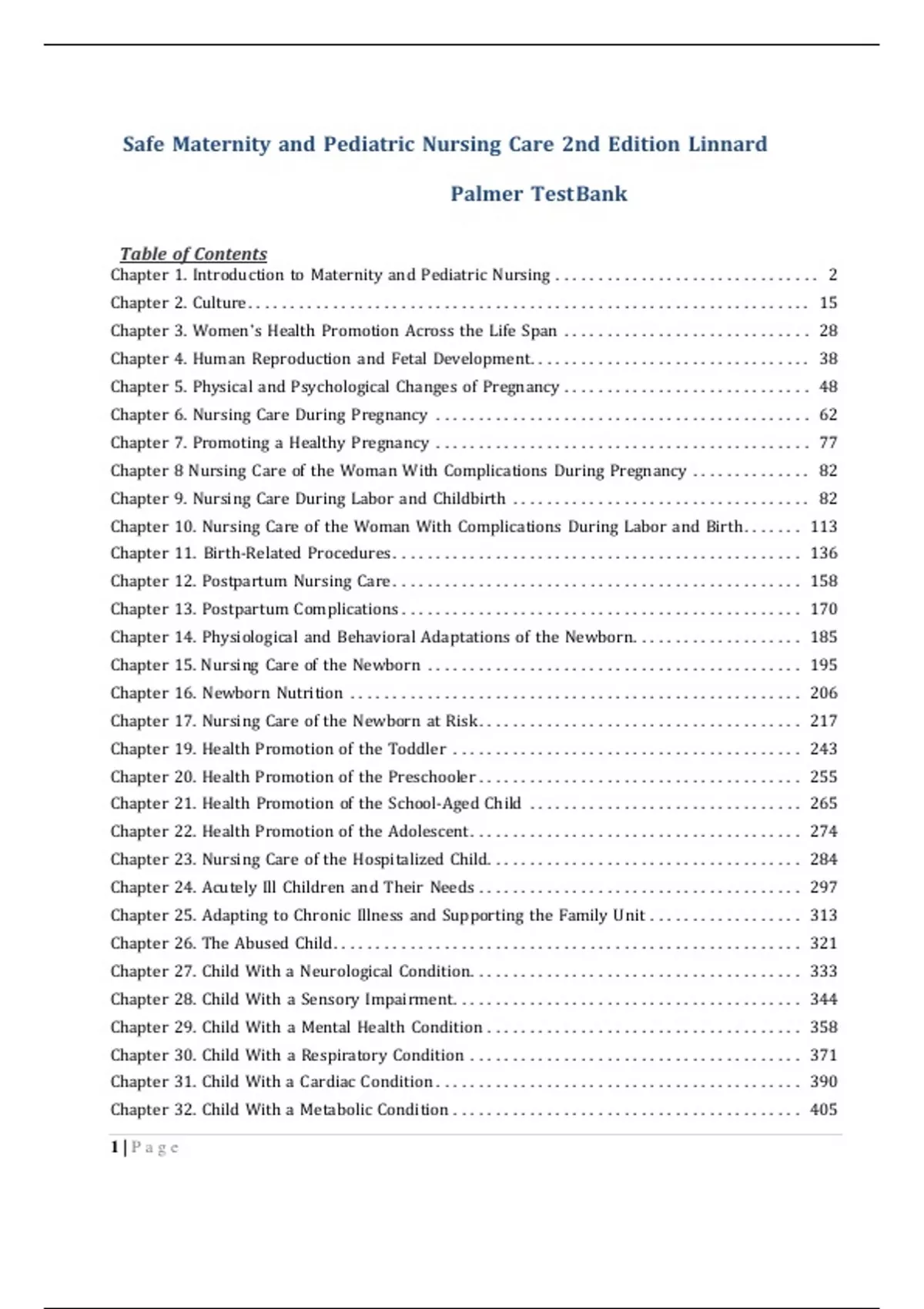 Test Bank Safe Maternity and Pediatric Nursing Care 2nd Edition Linnard-PalmerTable ofContents Chapter 1. Introduction to Maternity and Pediatric Nursing ............................... 2 Chapter 2. Culture................................ ................................ .. 15 Chapter 3. Women’s Health Promotion Across the Life Span ............................. 28 Chapter 4. Human Reproduction and Fetal Development................................ . 38 Chapter 5. Physical and Psychological Changes of Pregnancy ............................. 48 Chapter 6. Nursing Care During Pregnancy ................................ ............ 62 Chapter 7. Promoting a Healthy Pregnancy ................................ ............ 77 Chapter 8 Nursing Care of the Woman With Complications During Pregnancy .............. 82 Chapter 9. Nursing Care During Labor and Childbirth ................................ ... 82 Chapter 10. Nursing Care of the Woman With Complications During Labor and Birth....... 113 Chapter 11. Birth-Related Procedures ................................ ................ 136 Chapter 12. Postpartum Nursing Care ................................ ................ 158 Chapter 13. Postpartum Complications ................................ ............... 170 Chapter 14. Physiological and Behavioral Adaptations of the Newborn.................... 185 Chapter 15. Nursing Care of the Newborn ................................ ............ 195 Chapter 16. Newborn Nutrition ................................ ..................... 206 Chapter 17. Nursing Care of the Newborn at Risk................................ ...... 217 Chapter 19. Health Promotion of the Toddler ................................ ......... 243 Chapter 20. Health Promotion of the Preschooler ................................ ...... 255 Chapter 21. Health Promotion of the School-Aged Child ................................ 265 Chapter 22. Health Promotion of the Adolescent................................ ....... 274 Chapter 23. Nursing Care of the Hospitalized Child................................ ..... 284 Chapter 24. Acutely Ill Children and Their Needs ................................ ...... 297 Chapter 25. Adapting to Chronic Illness and Supporting the Family Unit .................. 313 Chapter 26. The Abused Child................................ ....................... 321 Chapter 27. Child With a Neurological Condition................................ ....... 333 Chapter 28. Child With a Sensory Impairment................................ ......... 344 Chapter 29. Child With a Mental Health Condition ................................ ..... 358 Chapter 30. Child With a Respiratory Condition ................................ ....... 371 Chapter 31. Child With a Cardiac Condition ................................ ........... 390 Chapter 32. Child With a Metabolic Condition ................................ ......... 405 1 | P a g eChapter 33. Child With a Musculoskeletal Condition................................ .... 414 Chapter 34. Child With a Gastrointestinal Condition................................ .... 427 Chapter 35. Child With a Genitourinary Condition ................................ ..... 444 Chapter 36. Child With a Skin Condition................................ .............. 458 Chapter 37. Child With a Communicable Disease ................................ ...... 474 Chapter 38. Child With an Oncological or Hematological Condition ....................... 484 Chapter 1. Introduction to Maternity and Pediatric Nursing MULTIPLE CHOICE 1. A patient chooses to have the certified nurse midwife (CNM) provide care during herpregnancy. What does the CNMs scope of practice include? a. Practice independent from medical supervision b. Comprehensive prenatal care c. Attendance at all deliveries d. Cesarean sectionsANS: B The CNM provides comprehensive prenatal and postnatal care, attends uncomplicated deliveries,and ensures that a backup physician is available in case of unforeseen problems. DIF: Cognitive Level: Comprehension REF: Page 6 OBJ: 12 TOP: Advance Practice Nursing Roles KEY: Nursing Process Step: Implementation MSC: NCLEX: Health Promotion and Maintenance: Prevention and Early Detection of Disease 2. Which medical pioneer discovered the relationship between the incidence of puerperal feverand unwashed hands? a. Karl Cred b. Ignaz Semmelweis c. Louis Pasteur d. Joseph Lister ANS: B Ignaz Semmelweis deduced that puerperal fever was septic, contagious, and transmitted by theunwashed hands of physicians and medical students. DIF: Cognitive Level: Knowledge REF: Page 2 OBJ: 1TOP: The Past KEY: Nursing Process Step: N/A MSC: NCLEX: Safe, Effective Care Environment: Safety and Infection Control 2 | P a g e3. A pregnant woman who has recently immigrated to the United States comments to the nurse, I am afraid of childbirth. It is so dangerous. I am afraid I will die. What is the best nursingresponse reflecting cultural sensitivity? a. Maternal mortality in the United States is extremely low. b. Anesthesia is available to relieve pain during labor and childbirth. c. Tell me why you are afraid of childbirth. d. Your condition will be monitored during labor and delivery.ANS: C Asking the patient about her concerns helps promote understanding and individualizes patientcare. DIF: Cognitive Level: Application REF: Page 7-8 OBJ: 8 TOP: Cross-Cultural Care KEY: Nursing Process Step: Implementation MSC: NCLEX: Psychosocial Integrity: Psychological Adaptation 4. An urban area has been reported to have a high perinatal mortality rate. What information doesthis provide? a. Maternal and infant deaths per 100,000 live births per year b. Deaths of fetuses weighing more than 500 g per 10,000 births per year c. Deaths of infants up to 1 year of age per 1000 live births per year d. Fetal and neonatal deaths per 1000 live births per yearANS: D The perinatal mortality rate includes fetal and neonatal deaths per 1000 live births per year. DIF: Cognitive Lev