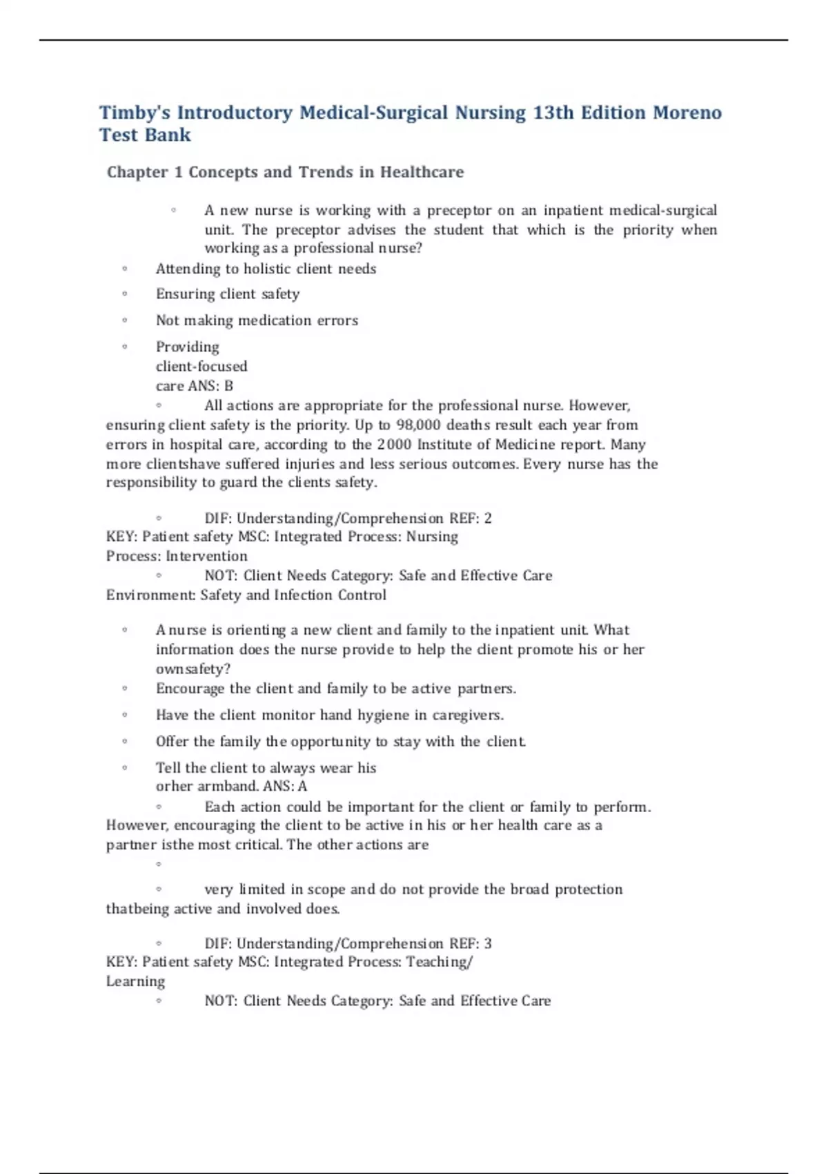 Timby's Introductory Medical-Surgical Nursing 13th Edition Moreno Test BankChapter 1 Concepts and Trends in Healthcare ◦ A new nurse is working with a preceptor on an inpatient medical-surgical unit. The preceptor advises the student that which is the priority when working as a professional nurse? ◦ Attending to holistic client needs ◦ Ensuring client safety ◦ Not making medication errors ◦ Providing client-focused care ANS: B ◦ All actions are appropriate for the professional nurse. However, ensuring client safety is the priority. Up to 98,000 deaths result each year from errors in hospital care, according to the 2000 Institute of Medicine report. Many more clientshave suffered injuries and less serious outcomes. Every nurse has the responsibility to guard the clients safety. ◦ DIF: Understanding/Comprehension REF: 2 KEY: Patient safety MSC: Integrated Process: Nursing Process: Intervention ◦ NOT: Client Needs Category: Safe and Effective Care Environment: Safety and Infection Control ◦ A nurse is orienting a new client and family to the inpatient unit. What information does the nurse provide to help the client promote his or her ownsafety? ◦ ◦ ◦ ◦ Encourage the client and family to be active partners. Have the client monitor hand hygiene in caregivers. Offer the family the opportunity to stay with the client. Tell the client to always wear his orher armband. ANS: A ◦ Each action could be important for the client or family to perform. However, encouraging the client to be active in his or her health care as a partner isthe most critical. The other actions are ◦ ◦ very limited in scope and do not provide the broad protection thatbeing active and involved does. ◦ DIF: Understanding/Comprehension REF: 3 KEY: Patient safety MSC: Integrated Process: Teaching/ Learning ◦ NOT: Client Needs Category: Safe and Effective CareEnvironment: Safety and Infection Control ◦ A nurse is caring for a postoperative client on the surgical unit. The clients bloodpressure was 142/76 mm Hg 30 minutes ago, and now is 88/50 mm Hg. What action by the nurse is best? Call the Rapid Response Team. ◦ ◦ Document and continue to monitor. ◦ Notify the primary care provider. ◦ Repeat blood pressure measurementin 15 minutes. ANS: A ◦ The purpose of the Rapid Response Team (RRT) is to intervene when clients are deteriorating before they suffer either respiratory or cardiac arrest. Since theclient has manifested a significant change, the nurse should call the RRT. Changes in blood pressure, mental status, heart rate, and pain are particularly significant. Documentation is vital, but the nurse must do more than document. The primary care provider should be notified, but this is not the priority over calling the RRT. The clients blood pressure should be reassessed frequently, but the priority is getting the rapid care to the client. ◦ DIF: Applying/Application REF: 3 ◦ KEY: Rapid Response Team (RRT)| medical emergencies MSC: Integrated Process: Communication and Documentation ◦ NOT: Client Needs Category: Physiological Integrity: Physiological Adaptation ◦ ◦ A nurse wishes to provide client-centered care in all interactions. Whichaction by the nurse best demonstrates this concept? ◦ Assesses for cultural influences affecting health care ◦ Ensures that all the clients basic needs are met ◦ ◦ Tells the client and family about all upcoming tests Thoroughly orients the client andfamily to the roomANS: A ◦ Competency in client-focused care is demonstrated when the nursefocuses on communication, culture, respect, compassion, client education, and empowerment. By assessing the effect of the ◦ ◦ clients culture on health care, this nurse is practicing client-focused care. Providing for basic needs does not demonstrate this competence. Simply tellingthe client about all upcoming tests is not providing empowering education. Orienting the client and family to the room is an important safety measure, but not directly related to demonstrating client-centered care. ◦ DIF: Understanding/Comprehension REF: 3◦ KEY: Patient-centered care| culture MSC: Integrated Process: Caring NOT: Client Needs Category: Psychosocial Integrity ◦ A client is going to be admitted for a scheduled surgical procedure. Which action does the nurse explain is the most important thing the client can doto protect against errors? ◦ ◦ ◦ ◦ Bring a list of all medications and what they are for. Keep the doctors phone number by the telephone. Make sure all providers wash hands before entering the room. Write down the name of each caregiver whocomes in the room. ANS: A ◦ Medication errors are the most common type of health care mistake. The Joint Commissions Speak Up campaign encourages clients to help ensure their safety. One recommendation is for clients to know all their medications and why theytake them. This will help prevent medication errors. ◦ ◦ DIF: Applying/Application REF: 4 KEY: Speak Up campaign| patient safety MSC: Integrated Process: Teaching/Learning NOT: Client Needs Category: Safe and Effective Care Environment: Safety and Infection Control ◦ Which action by the nurse working with a client best demonstrates respect forautonomy? ◦ Asks if the client has questions before signing a consent ◦ Gives the client accurate information when questioned ◦ ◦ ◦ Keeps the promises made to the client and family Treats the client fairly compared to other clientsANS: A Autonomy is self-determination. The client should make decisions regarding care. When the nurse obtains a signature on the consent form, assessing if the client still has questions is vital, because without full information the client cannotpractice autonomy. Giving accurate information is practicing with veracity. Keeping promises is upholding fidelity. Treating the ◦ ◦ ◦ ◦ ◦ ◦ of Care client fairly is providing social justice. DIF: Applying/Application REF: 4 KEY: Autonomy| ethical principles M