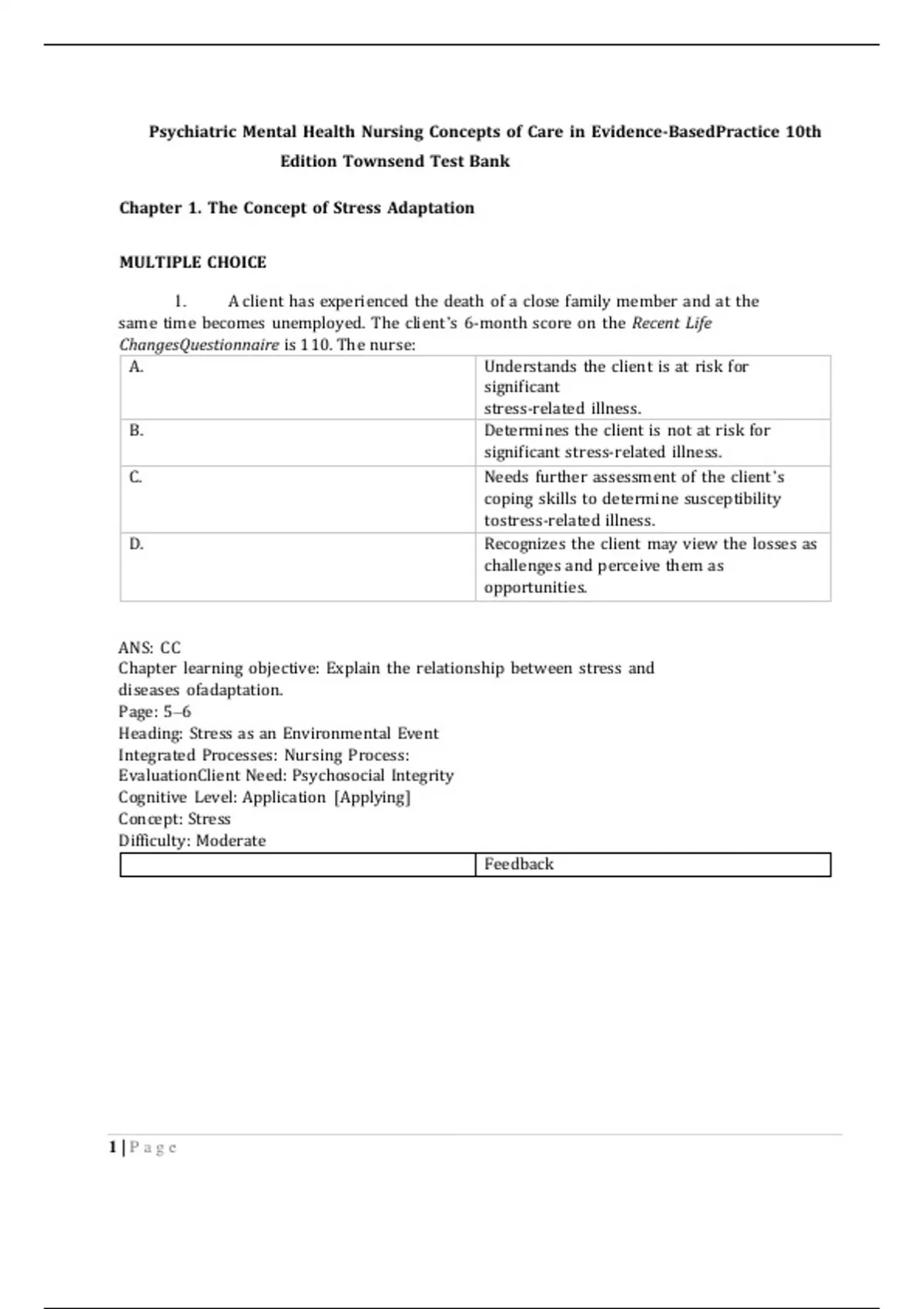 Psychiatric Mental Health Nursing Concepts of Care in Evidence-Based Practice 10th Edition Townsend Test BankChapter 1. The Concept of Stress Adaptation MULTIPLE CHOICE 1. A client has experienced the death of a close family member and at the same time becomes unemployed. The client’s 6-month score on the Recent Life Changes Questionnaire is 110. The nurse: A. Understands the client is at risk for significant stress-related illness. B. C. D. Determines the client is not at risk for significant stress-related illness. Needs further assessment of the client’s coping skills to determine susceptibility to stress-related illness. Recognizes the client may view the losses as challenges and perceive them as opportunities. ANS: C C Chapter learning objective: Explain the relationship between stress and diseases of adaptation. Page: 5–6 Heading: Stress as an Environmental Event Integrated Processes: Nursing Process: Evaluation Client Need: Psychosocial Integrity Cognitive Level: Application [Applying] Concept: Stress Difficulty: Moderate Feedback 1 | P a g eA This is incorrect. Assessment is the first step of the nursing process. The nurse should assess the client’s coping skills and available support before determining susceptibility to stress-related physical and psychological illness. The Recent Life Changes Questionnaire is an expanded version of the Schedule of Recent Experiences and the Rahe- Holmes Social Readjustment Rating Scale. A 6-month score of 300 or more, or a year-score total of 500 or more, indicates high stress in a client’s life and susceptibility to stress- related illnesses. B This is incorrect. Assessment is the first step in the nursing process. The nurse should assess the client’s coping skills and available support before determining the client’s perception of the current stresses. A 6-month score of 300 or a year-score of 500 or more on the Recent Life Changes Questionnaire indicates high stress in a client’s life and susceptibility to stress- related physical and psychological illness. C This is correct. Assessment is the first step in the nursing process. The nurse should assess the client’s coping skills and available support before determining susceptibility to stress- related physical and psychological illness. A 6-month score of 300 or a year- score of 500 or more indicates high stress in a client’s life and risk for significant stress- related physical and psychological illness. D This is incorrect. Assessment is the first step in the nursing process. The nurse should assess the client’s coping skills and available support before determining susceptibility to stress-related illness. A 6- month score of 300 or a year-score of 500 or more on the Recent Life Changes Questionnaire indicates high stress in a client’s life is susceptible to significant stress-related physical and psychological illness. 2 | P a g ePTS: 1 CON: Stress 2. A physically and emotionally healthy client has just been fired. During a routine office visit, he tells the nurse, “Perhaps this was the best thing to happen. Maybe I’ll consider pursuing an art degree.” The nurse determines the client perceives the stressor of his job loss as: A. Irrelevant. B. C. D. Harm/loss. A threat. A challenge. ANS: D Chapter: Chapter 0, The Concept of Stress Adaptation Chapter learning objective: Discuss adaptive coping strategies in the management of stress. Page: 7 Heading: Individual’s Perception of the Event > Primary Appraisal Integrated Processes: Nursing Process: Assessment Client Need: Psychosocial Integrity Cognitive Level: Application [Applying] Concept: Stress Difficulty: Easy Feedback A B C D This is incorrect. The client’s statement indicates he perceives the loss of his job as a challenge and an opportunity for growth. This is incorrect. The client’s statement indicates he perceives the loss of his job as a challenge and an opportunity for growth. This is incorrect. The client’s statement indicates he perceives the loss of his job as a challenge and an opportunity for growth. This is correct. The client’s statement indicates he perceives the loss of his job as a challenge and an opportunity for growth. PTS: 1 3. CON: Stress Which client statement alerts the nurse that the client may be responding maladaptively to stress? A. 3 | P a g e “Avoiding contact with others helps me cope.”B. “I really enjoy journaling; it’s my private time.” C. D. “I signed up for a yoga class this week.” “I made an appointment to meet with a therapist.” ANS: A Chapter: Chapter 0, The Concept of Stress Adaptation Chapter learning objective: Discuss adaptive coping strategies in the management of stress. Page: 8–9 Heading: Stress Management Integrated Processes: Nursing Process: Evaluation Client Need: Psychosocial Integrity Cognitive Level: Application [Applying] Concept: Stress Difficulty: Easy Feedback A This is correct. Reliance on social isolation as a coping mechanism is a maladaptive method to relieve stress. It can prevent learning appropriate coping skills and can prevent access to needed support systems. B C D This is incorrect. Journaling is not considered a maladaptive coping method. This is incorrect. Group exercise is not considered a maladaptive coping method. This is incorrect. Seeing a therapist is not considered a maladaptive coping method. PTS: 1 4. CON: Stress A nursing student comes down with a sinus infection toward the end of every semester. Which stage of stress is the student most likely experiencing when this occurs? A. Alarm reaction B. C. D. ANS: C Chapter: Chapter 0, The Concept of Stress Adaptation Chapter learning objective: Explain the relationship between stress and 4 | P a g e Resistance Exhaustion Fight or flightdiseases of adaptation. Page: 9 Heading: Stress as a Biological Response > Stage of Exhaustion Integrated Processes: Nursing Process: Assessment Client Need: Psychosocial Integrity Cognitive Level: Comprehension [Understandin