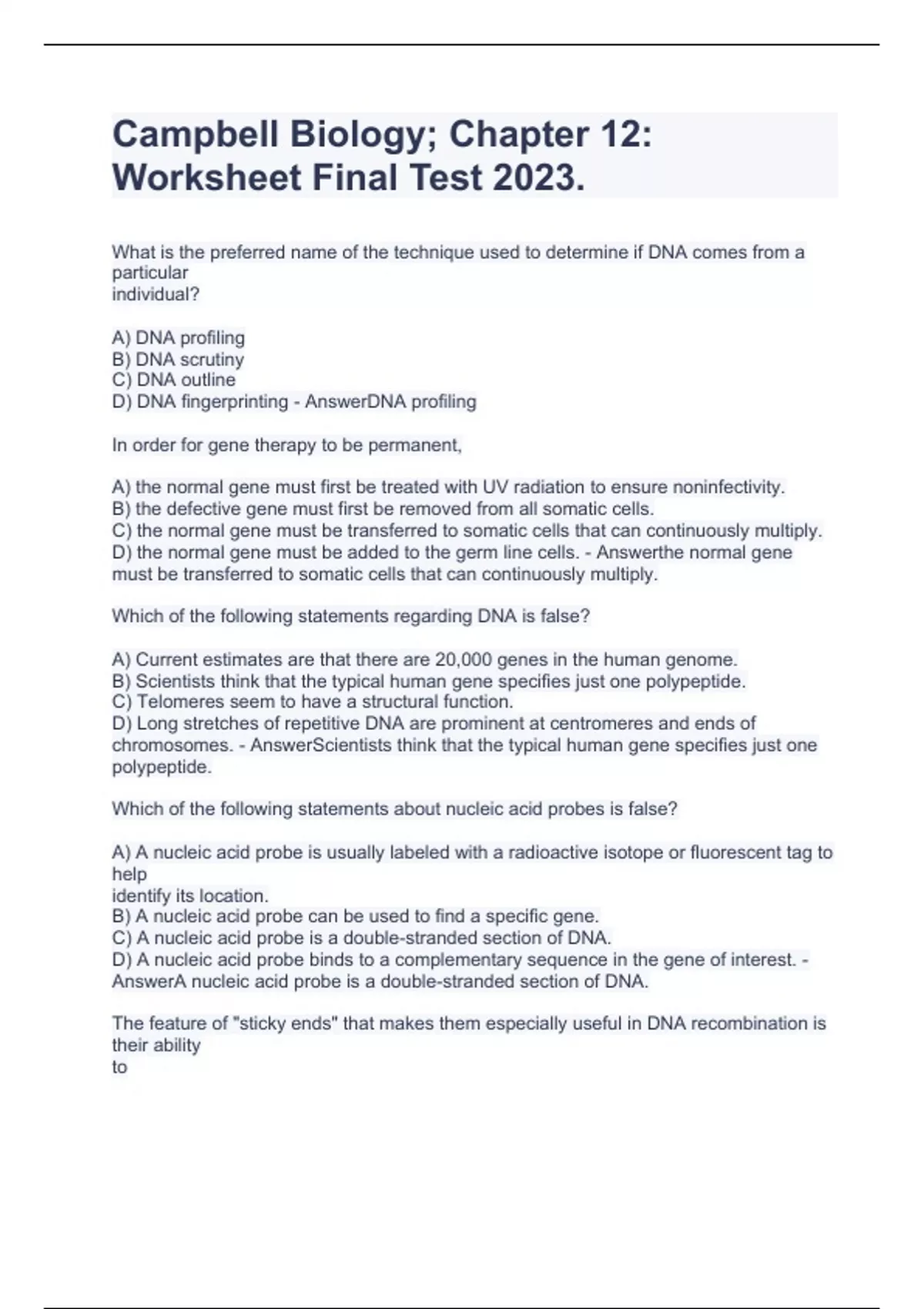 Campbell Biology; Chapter 12: Worksheet Final Test 2023. What is the preferred name of the technique used to determine if DNA comes from a particular individual? A) DNA profiling B) DNA scrutiny C) DNA outline D) DNA fingerprinting - AnswerDNA profiling In order for gene therapy to be permanent, A) the normal gene must first be treated with UV radiation to ensure noninfectivity. B) the defective gene must first be removed from all somatic cells. C) the normal gene must be transferred to somatic cells that can continuously multiply. D) the normal gene must be added to the germ line cells. - Answerthe normal gene must be transferred to somatic cells that can continuously multiply. Which of the following statements regarding DNA is false? A) Current estimates are that there are 20,000 genes in the human genome. B) Scientists think that the typical human gene specifies just one polypeptide. C) Telomeres seem to have a structural function. D) Long stretches of repetitive DNA are prominent at centromeres and ends of chromosomes. - AnswerScientists think that the typical human gene specifies just one polypeptide. Which of the following statements about nucleic acid probes is false? A) A nucleic acid probe is usually labeled with a radioactive isotope or fluorescent tag to help identify its location. B) A nucleic acid probe can be used to find a specific gene. C) A nucleic acid probe is a double-stranded section of DNA. D) A nucleic acid probe binds to a complementary sequence in the gene of interest. - AnswerA nucleic acid probe is a double-stranded section of DNA. The feature of "sticky ends" that makes them especially useful in DNA recombination is their ability to