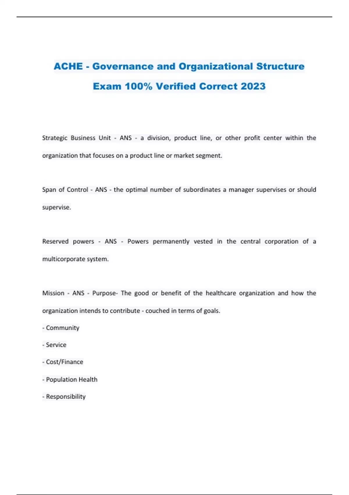 ACHE - Governance and Organizational Structure Exam 100% Verified Correct 2023 Strategic Business Unit - ANS - a division, product line, or other profit center within the organization that focuses on a product line or market segment. Span of Control - ANS - the optimal number of subordinates a manager supervises or should supervise. Reserved powers - ANS - Powers permanently vested in the central corporation of a multicorporate system. Mission - ANS - Purpose- The good or benefit of the healthcare organization and how the organization intends to contribute - couched in terms of goals. - Community - Service - Cost/Finance - Population Health - Responsibility Management Letter - ANS - A letter from the auditor to management and governing boards that accompany their audited financial report -making recommendations to the entity based on observations during the audit; the letter may include topics relating to organizational structure and efficiency issues.