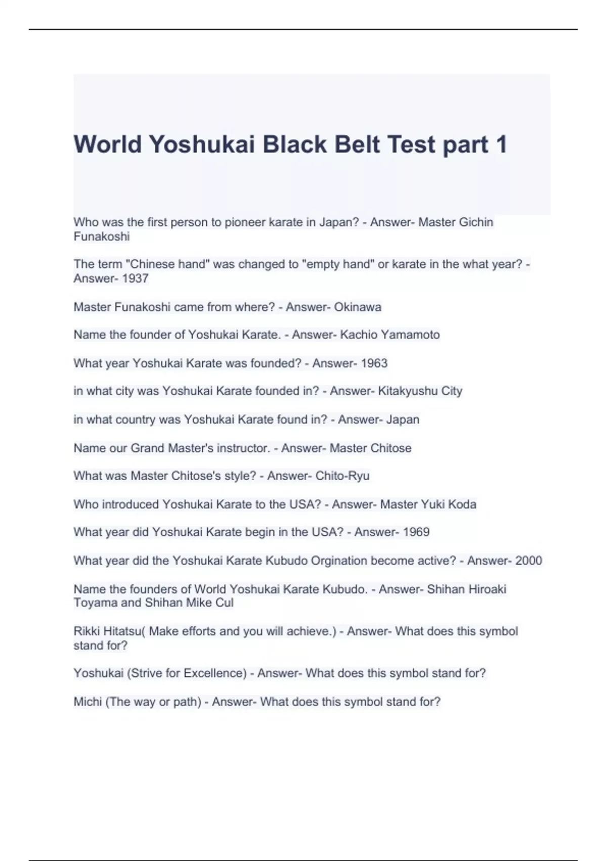 World Yoshukai Black Belt Test part 1 questions with correct answers