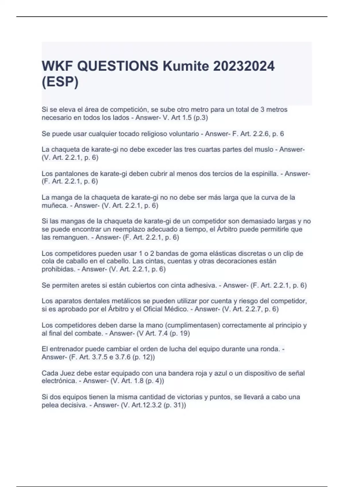 WKF QUESTIONS Kumite (ESP) with correct Answers