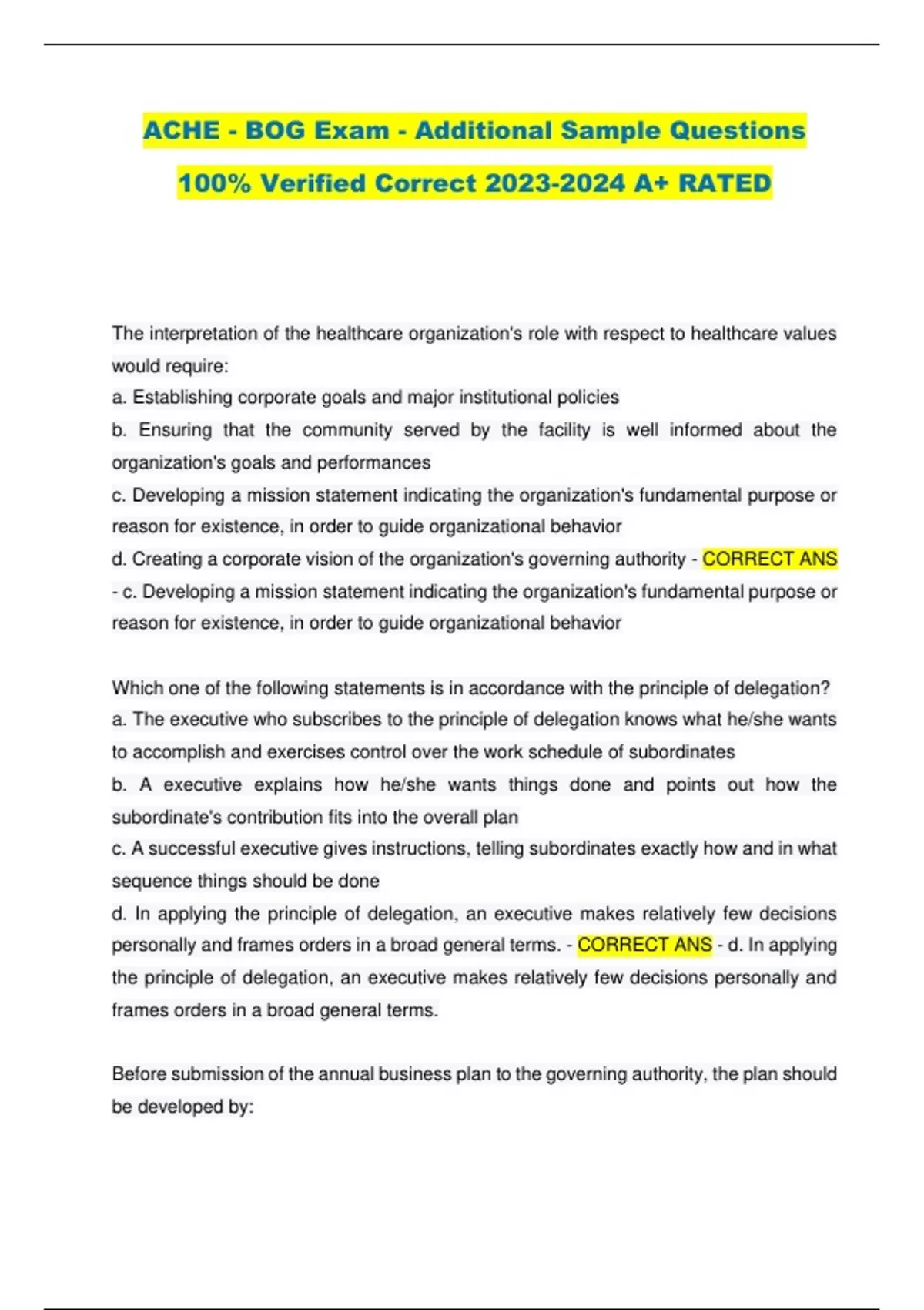 ACHE - BOG Exam - Additional Sample Questions 100% Verified Correct A+ RATED