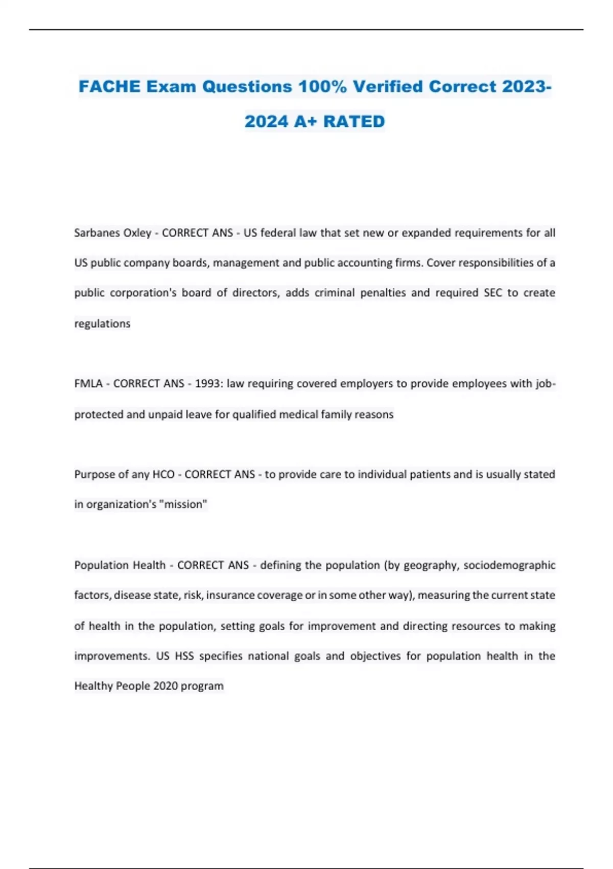 FACHE Exam Questions 100% Verified Correct A+ RATED Sarbanes Oxley - CORRECT ANS - US federal law that set new or expanded requirements for all US public company boards, management and public accounting firms. Cover responsibilities of a public corporation's board of directors, adds criminal penalties and required SEC to create regulations FMLA - CORRECT ANS - 1993: law requiring covered employers to provide employees with job-protected and unpaid leave for qualified medical family reasons Purpose of any HCO - CORRECT ANS - to provide care to individual patients and is usually stated in organization's "mission" Population Health - CORRECT ANS - defining the population (by geography, sociodemographic factors, disease state, risk, insurance coverage or in some other way), measuring the current state of health in the population, setting goals for improvement and directing resources to making improvements. US HSS specifies national goals and objectives for population health in the Healthy People 2020 program Caregiving/Clinical/Logistic/Strategic Teams - CORRECT ANS - Caregiving Teams: Provide care to patients with similar needs (PCP, ACUTE, rehab) Clinical Support Teams: provide specific clinical services to Caregiving Teams (clinical laboratory, pharmacy, imaging, cardiopulmonary) Logistic Support Teams - provide trained personnel, information, facilities, accounting, cash, management and supplies Strategic Support Teams: provide marketing, governance, internal consulting, finance, stakeholder relations management and strategic positioning