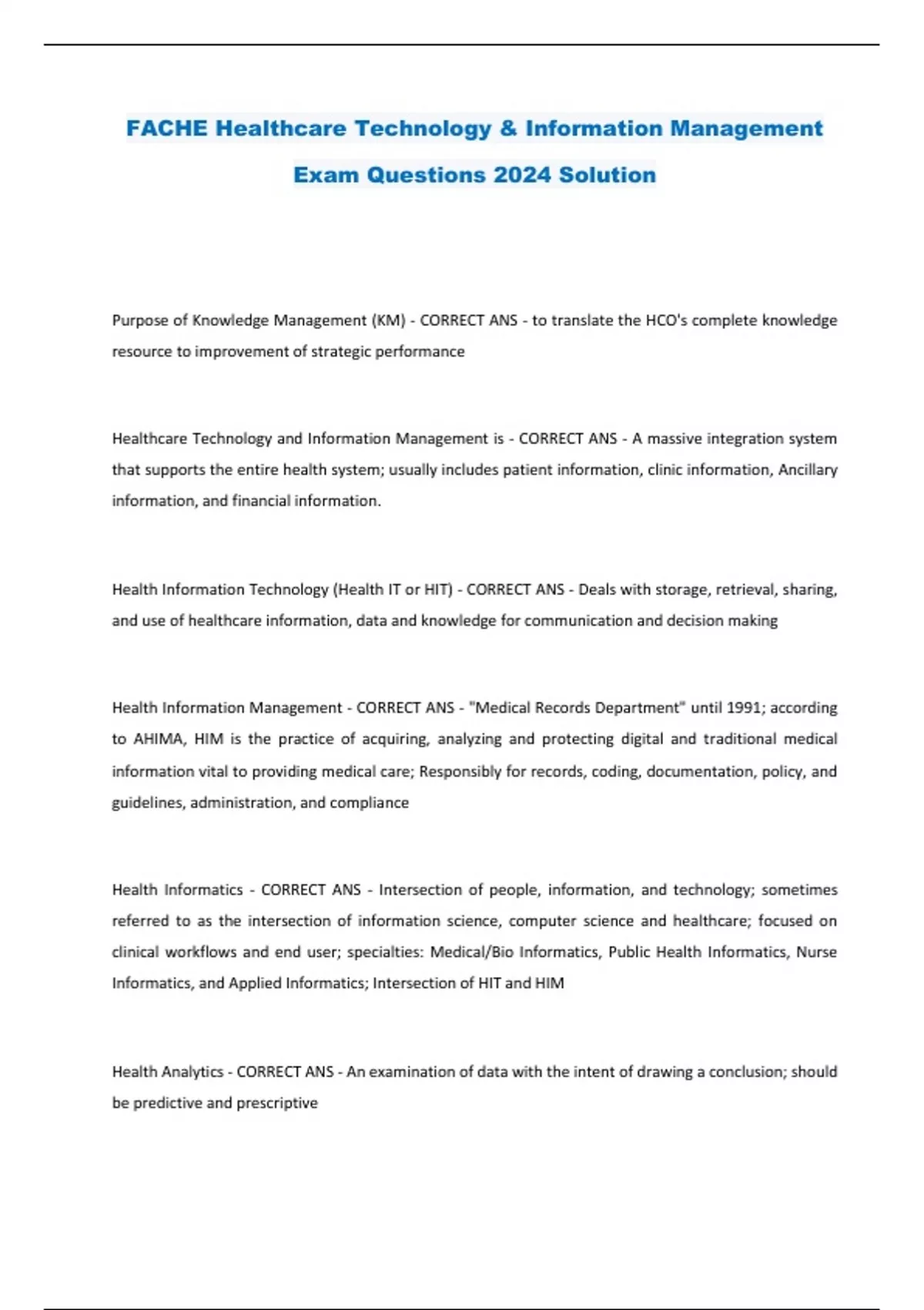 FACHE Healthcare Technology & Information Management Exam Questions 2024 Solution Purpose of Knowledge Management (KM) - CORRECT ANS - to translate the HCO's complete knowledge resource to improvement of strategic performance Healthcare Technology and Information Management is - CORRECT ANS - A massive integration system that supports the entire health system; usually includes patient information, clinic information, Ancillary information, and financial information. Health Information Technology (Health IT or HIT) - CORRECT ANS - Deals with storage, retrieval, sharing, and use of healthcare information, data and knowledge for communication and decision making Health Information Management - CORRECT ANS - "Medical Records Department" until 1991; according to AHIMA, HIM is the practice of acquiring, analyzing and protecting digital and traditional medical information vital to providing medical care; Responsibly for records, coding, documentation, policy, and guidelines, administration, and compliance Health Informatics - CORRECT ANS - Intersection of people, information, and technology; sometimes referred to as the intersection of information science, computer science and healthcare; focused on clinical workflows and end user; specialties: Medical/Bio Informatics, Public Health Informatics, Nurse Informatics, and Applied Informatics; Intersection of HIT and HIM Health Analytics - CORRECT ANS - An examination of data with the intent of drawing a conclusion; should be predictive and prescriptive