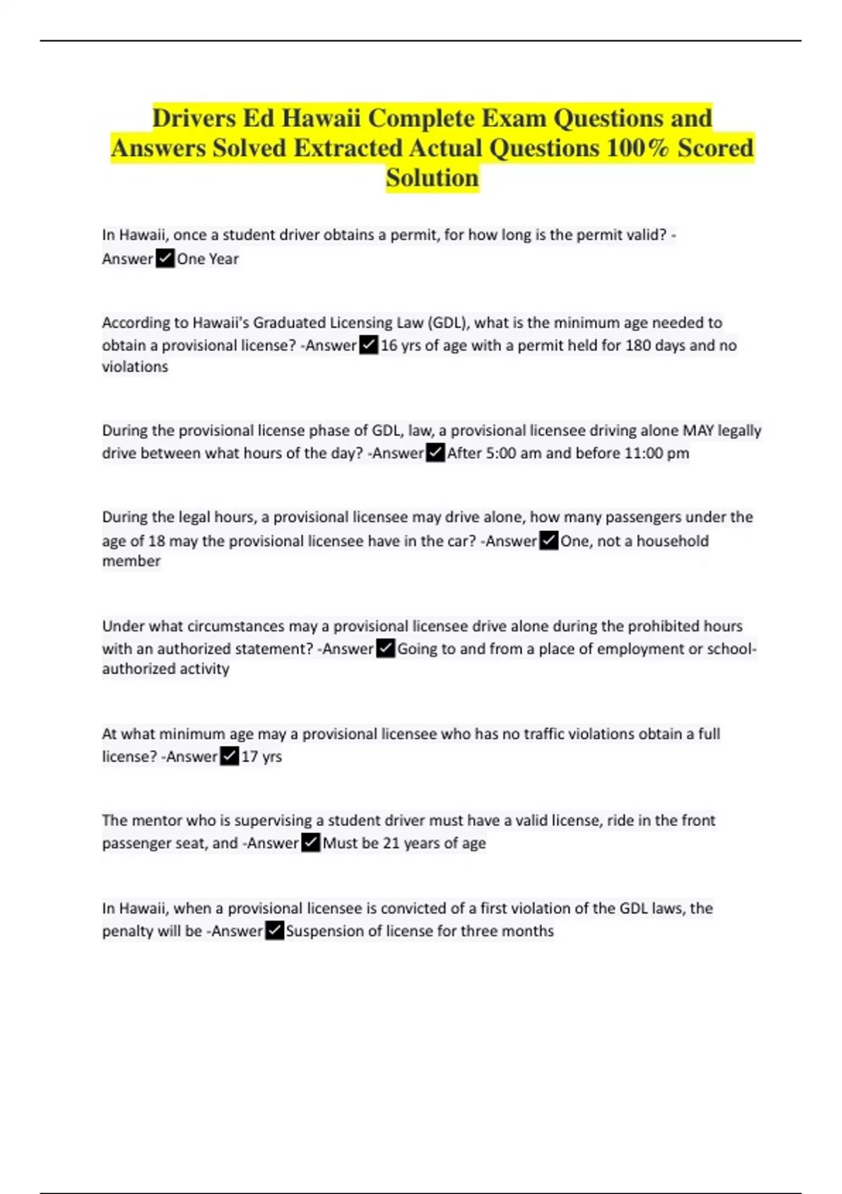 Drivers Ed Hawaii Complete Exam Questions and Answers Solved Extracted Actual Questions 100% Scored Solution