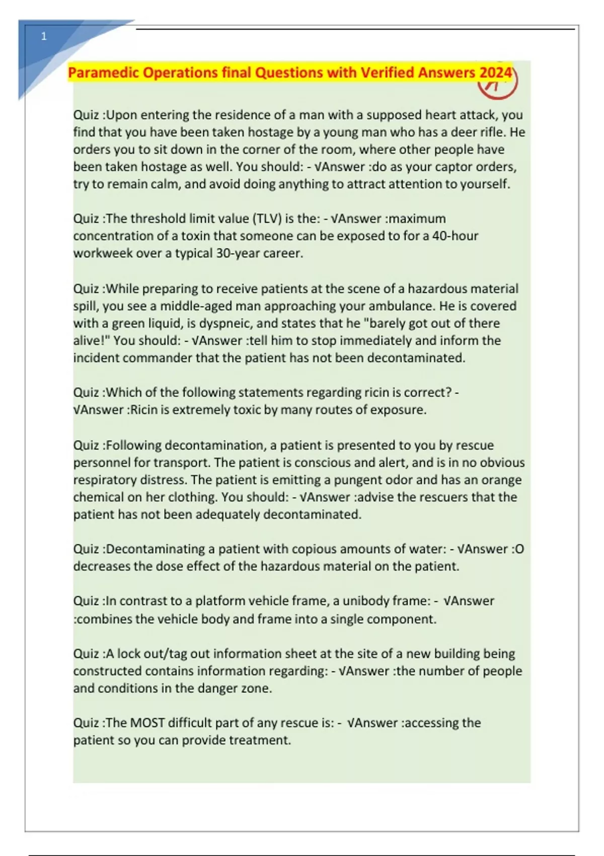 Paramedic Operations final Questions with Verified Answers 2024