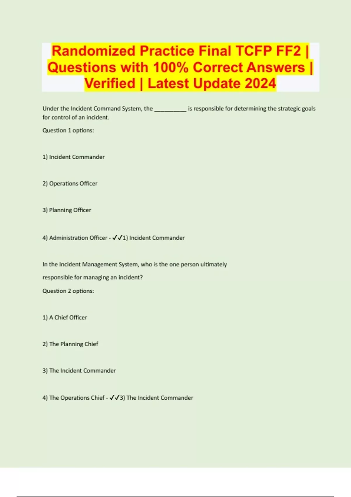 Randomized Practice Final TCFP FF2 | Questions with 100% Correct Answers | Verified | Latest Update 2024