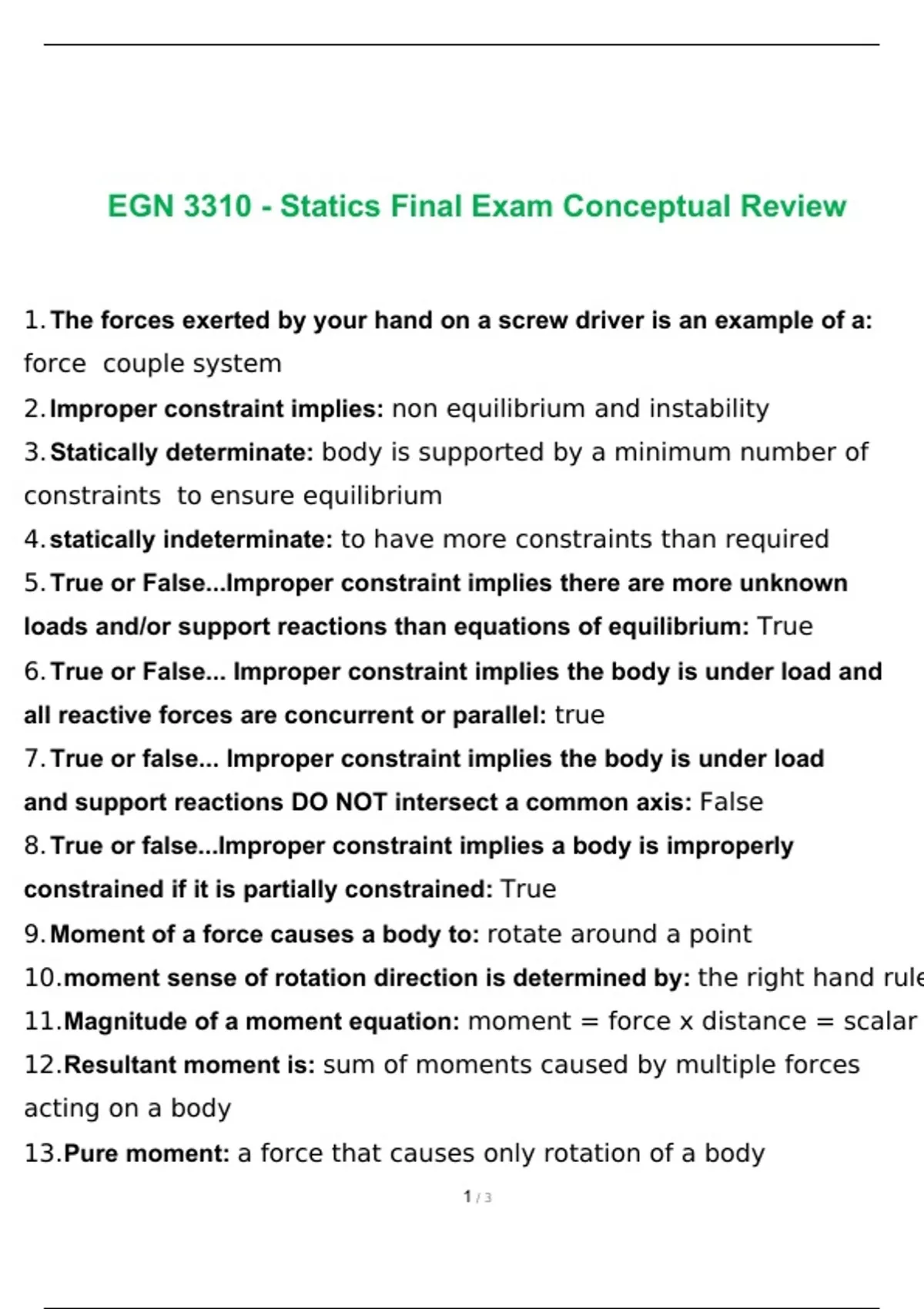 EGN 3310 - Statics Final Exam Conceptual Review 2023 with complete solution