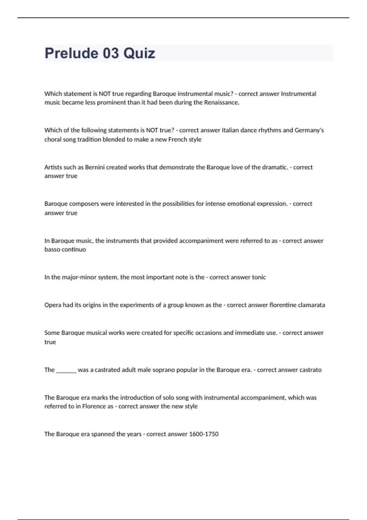 Prelude 03 Quiz Which statement is NOT true regarding Baroque instrumental music? - correct answer Instrumental music became less prominent than it had been during the Renaissance. Which of the following statements is NOT true? - correct answer Italian dance rhythms and Germany's choral song tradition blended to make a new French style Artists such as Bernini created works that demonstrate the Baroque love of the dramatic. - correct answer true Baroque composers were interested in the possibilities for intense emotional expression. - correct answer true In Baroque music, the instruments that provided accompaniment were referred to as - correct answer basso continuo In the major-minor system, the most important note is the - correct answer tonic Opera had its origins in the experiments of a group known as the - correct answer florentine clamarata Some Baroque musical works were created for specific occasions and immediate use. - correct answer true The ______ was a castrated adult male soprano popular in the Baroque era. - correct answer castrato The Baroque era marks the introduction of solo song with instrumental accompaniment, which was referred to in Florence as - correct answer the new style The Baroque era spanned the years - correct answer The Baroque era was characterized by peaceful relations between Protestants and Catholics. - correct answer false The term "baroque" derives from the Portuguese word for - correct answer misshapen The tuning system established in the Baroque that made it possible for instruments to play in any key is called - correct answer equal temperment What famous assertion by Louis XIV summed up a way of life in which all art and culture served the ruler? - correct answer I AM THE STATE What roles did women play in music during the Baroque era? - correct answer singers and composers Which French palace influenced the courts of other European rulers? - correct answer palace of versailles Which genres, filled with keen and witty observations on life, are associated with the middle classes? - correct answer comic opera and the novel Which of the following became a more popular texture during the early Baroque? - correct answer homophony Which of the following is a Baroque-era poetic epic? - correct answer miltons paradise lost Which of the following was NOT an historical event from the Baroque era? - correct answer invention of printing by johannes Which of the following was a hallmark of Baroque performance style? - correct answer increased improvisation