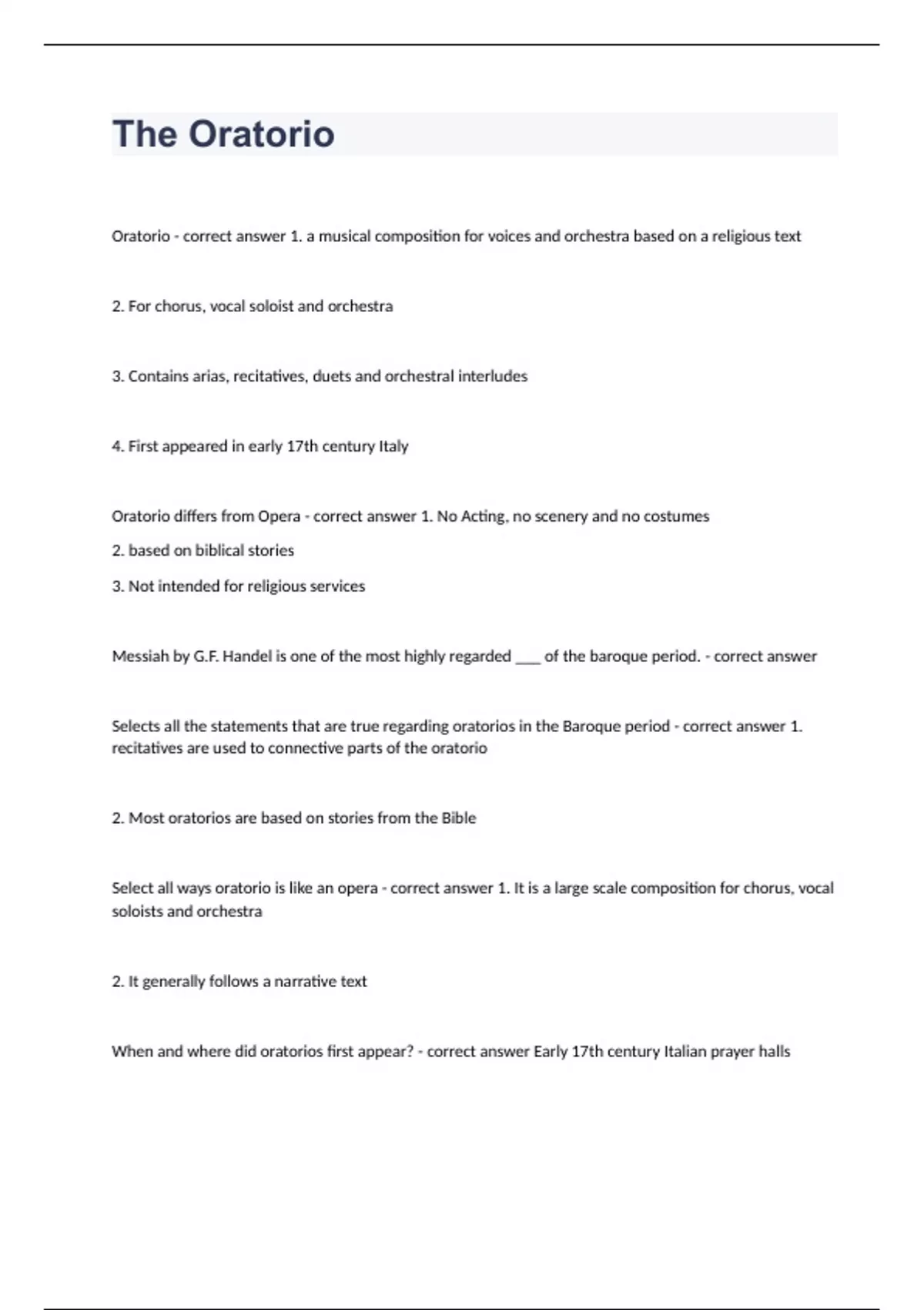 The OratorioOratorio - correct answer 1. a musical composition for voices and orchestra based on a religious text 2. For chorus, vocal soloist and orchestra 3. Contains arias, recitatives, duets and orchestral interludes 4. First appeared in early 17th century Italy Oratorio differs from Opera - correct answer 1. No Acting, no scenery and no costumes 2. based on biblical stories 3. Not intended for religious services Messiah by G.F. Handel is one of the most highly regarded ___ of the baroque period. - correct answer Selects all the statements that are true regarding oratorios in the Baroque period - correct answer 1. recitatives are used to connective parts of the oratorio 2. Most oratorios are based on stories from the Bible Select all ways oratorio is like an opera - correct answer 1. It is a large scale composition for chorus, vocal soloists and orchestra 2. It generally follows a narrative text When and where did oratorios first appear? - correct answer Early 17th century Italian prayer halls Which is one of the most well known and beloved oratorios of the Baroque period? - correct answer Handel's Messiah What did Handel do after the failure of the Royal Academy of music opera Company, where Handel was the music director? - correct answer He formed a new company to produce his works Select all musical genres Handel composed - correct answer Oratorios Operas Concertos Ev'ry Valley Shall Be Exalted from Handel's Messiah is sung by - correct answer Tenor aria Handel wrote the Italian duet before this work and used the same melodic ideas in For Unto Us a Child is Born - correct answer what is the texture of the music from "HallelujahChorus" from the messiah, by Handel - correct answer Homophonic How does Handel's Messiah differ from his previous oratorios? - correct answer it is based mainly on the New Testament rather than using a story from the Old Testament Which statement best describes Handel's treatment of the music for Unto Us a Child is Born? - correct answer Handel alternates between polyphonic and homophonic textures and makes changes in dynamics