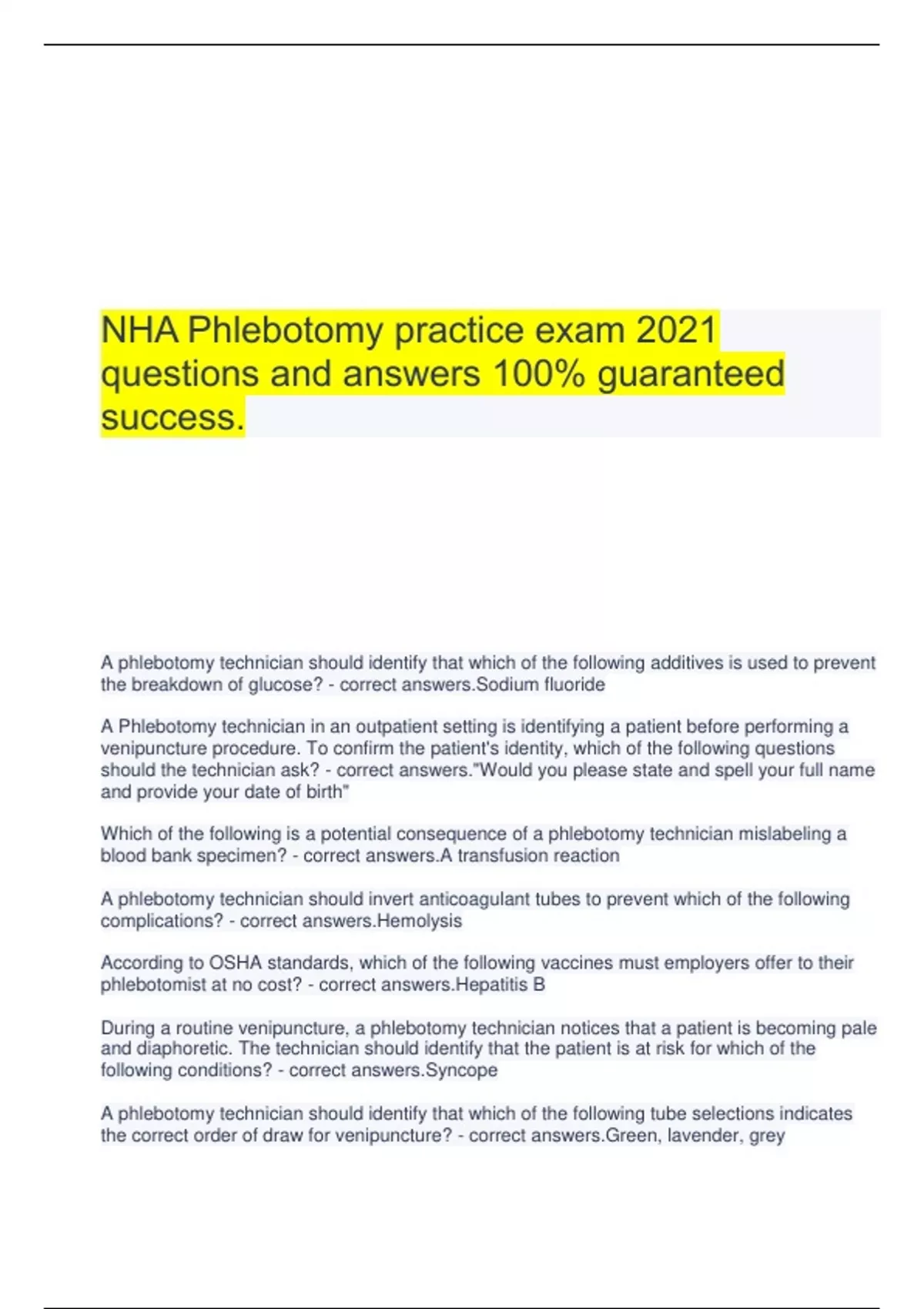 NHA Phlebotomy practice exam 2021 questions and answers 100% guaranteed success. A phlebotomy technician should identify that which of the following additives is used to prevent the breakdown of glucose? - correct answers.Sodium fluoride A Phlebotomy technician in an outpatient setting is identifying a patient before performing a venipuncture procedure. To confirm the patient's identity, which of the following questions should the technician ask? - correct answers."Would you please state and spell your full name and provide your date of birth" Which of the following is a potential consequence of a phlebotomy technician mislabeling a blood bank specimen? - correct answers.A transfusion reaction A phlebotomy technician should invert anticoagulant tubes to prevent which of the following complications? - correct answers.Hemolysis According to OSHA standards, which of the following vaccines must employers offer to their phlebotomist at no cost? - correct answers.Hepatitis B During a routine venipuncture, a phlebotomy technician notices that a patient is becoming pale and diaphoretic. The technician should identify that the patient is at risk for which of the following conditions? - correct answers.Syncope A phlebotomy technician should identify that which of the following tube selections indicates the correct order of draw for venipuncture? - correct answers.Green, lavender, grey Phlebotomy technician is preparing to collect a blood specimen from the hand of a patient whose veins are difficult to access. Which of the following devices should the technician use? - correct answers.Hand immobilizer A phlebotomy technician is preparing to use an evacuated tube system to obtain a venous blood specimen from a patient. The tourniquet is in place and the technician has cleansed the puncture site. Which of the following procedural steps should the technician perform next? - correct answers.Ask the patient to make a fist Which of the following actions by a phlebotomy technician can result in a grossly hemolyzed specimen? - correct answers.Using an incorrect needle gauge A phlebotomy technician should identify that which of the following series of venipuncture steps is in the appropriate order? - correct s the site, cleanse the site, insert the needle A phlebotomy technician should comply with HIPAA to protect which of the following? - correct answers.Patients information A phlebotomy technician is performing a capillary blood collection for an older adult patient. Which of the following sites should the technician select? - correct answers.The distal phalanx of either middle finger A phlebotomy technician is preparing to collect a blood specimen from a patient who signed a general informed consent form upon admission to the facility. Which of the following actions by the patient indicates implied consent for the venipuncture? - correct answers.Rolling up his shirtsleeve A phlebotomy technician is using an evacuated needle holder and blood collection tubes to collect blood from a patient. Which of the following actions should the technician take? - correct answers.Push the first collection tube gently into the holder For an older adult patient who has difficult-to-access veins, a phlebotomy technician should select which of the following beans to perform a venipuncture? - correct answers.Dorsal veins How often should a phlebotomy technician run quality control test on point-of-care testing instruments? - correct answers.Daily A phlebotomy technician must comply with which of the following OSHA requirements when performing a venipuncture? - correct answers.Wear gloves when contact with blood is anticipated Which of the following actions should the phlebotomy technician take when performing a venipuncture using an evacuated tube system? - correct answers.Position the needle at a 30° angle in the same direction as the vein and with the bevel up A phlebotomy technician is collecting a blood specimen from a patient to measure the trough level of a medication. The technician should collect the specimen at which of the following times? - correct answers.Within 15 mins before the patient receives the next dose of medication. For which of the following test should a phlebotomy technician follow chain of custody guidelines? - correct answers.Blood alcohol