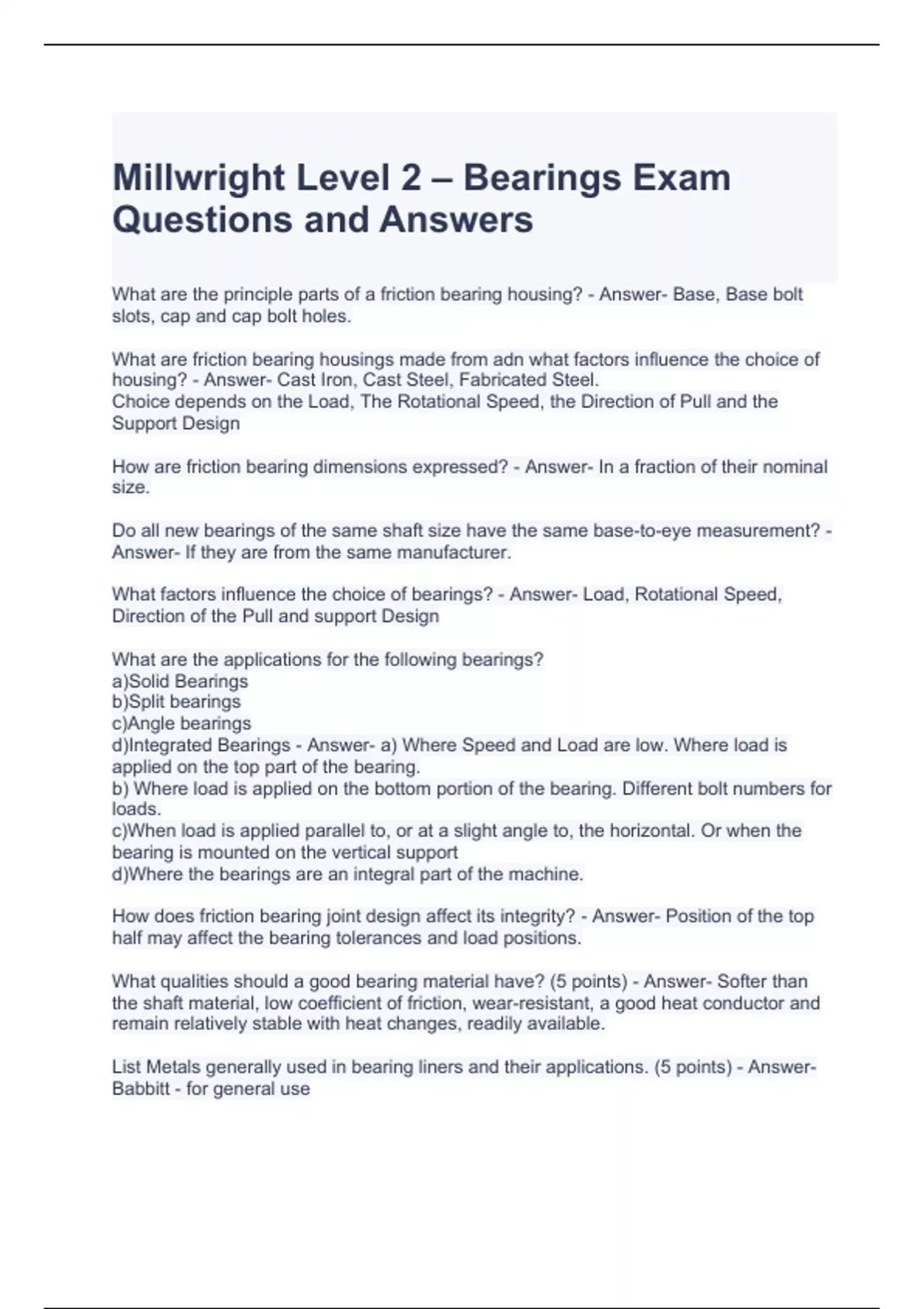 millwright level 2 bearings exam questions and a