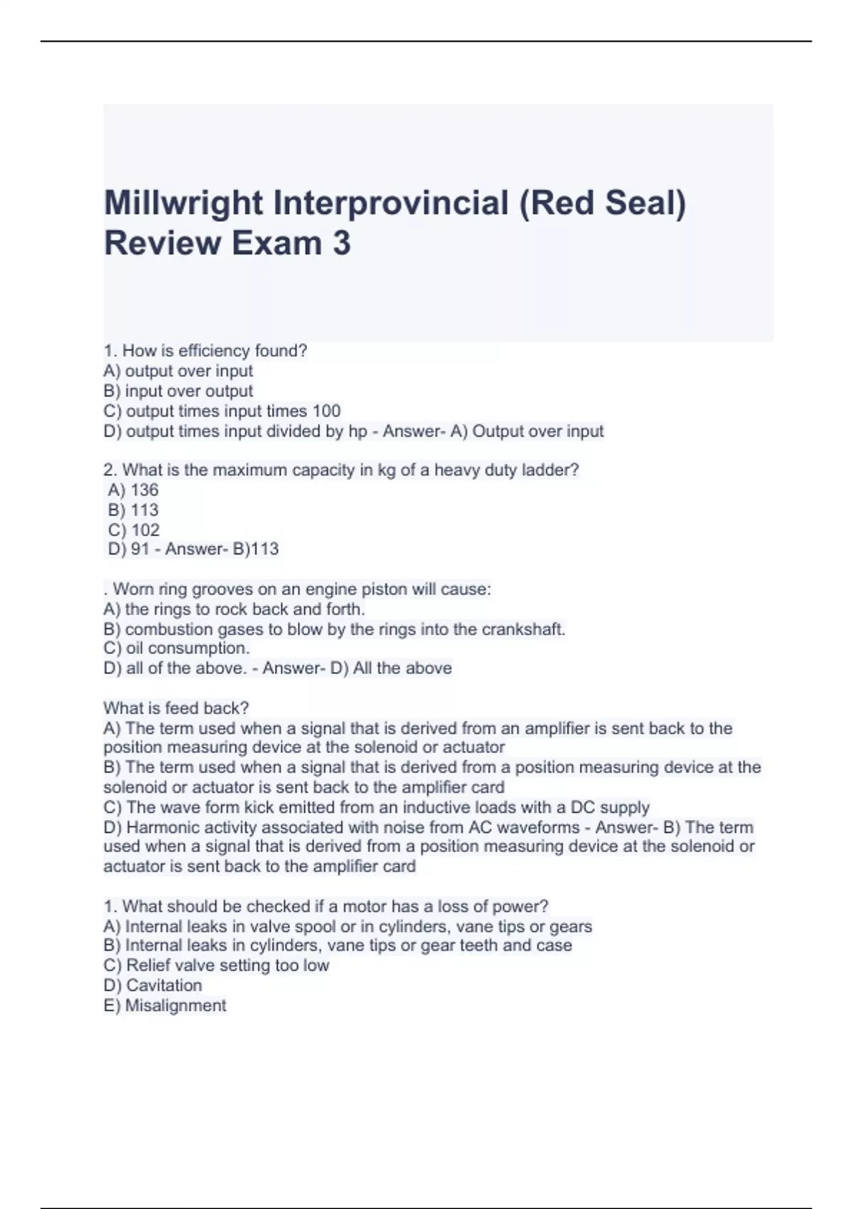 Millwright Interprovincial (Red Seal) Review Exam 3 Questions and Answers