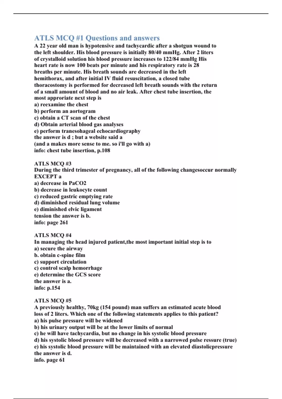 A 22 year old man is hypotensive and tachycardic after a shotgun wound to the left shoulder. His blood pressure is initially 80/40 mmHg. After 2 liters of crystalloid solution his blood pressure increases to 122/84 mmHg His heart rate is now 100 beats per minute and his respiratory rate is 28 breaths per minute. His breath sounds are decreased in the left hemithorax, and after initial IV fluid resuscitation, a closed tube thoracostomy is performed for decreased left breath sounds with the return of a small amount of blood and no air leak. After chest tube insertion, the most approriate next step is a) reexamine the chest b) perform an aortogram c) obtain a CT scan of the chest d) Obtain arterial blood gas analyses e) perform tranesohageal echocardiography the answer is d ; but a website said a (and a makes more sense to me. so i'll go with a) info: chest tube insertion, p.108 ATLS MCQ #3 During the third trimester of pregnancy, all of the following changesoccur normally EXCEPT a a) decrease in PaCO2 b) decrease in leukocyte count c) reduced gastric emptying rate d) diminished residual lung volume e) diminished elvic ligament tension the answer is b. info: page 261 ATLS MCQ #4 In managing the head injured patient,the most important initial step is to a) secure the airway b. obtain c-spine film c) support circulation c) control scalp hemorrhage e) determine the GCS score the answer is a. info: p.154 ATLS MCQ #5 A previously healthy, 70kg (154 pound) man suffers an estimated acute blood loss of 2 liters. Which one of the following statements applies to this patient? a) his pulse pressure will be widened b) his urinary output will be at the lower limits of normal c) he will have tachycardia, but no change in his systolic blood pressure d) his systolic blood pressure will be decreased with a narrowed pulse ressure (true) e) his systolic blood pressure will be maintained with an elevated diastolicpressure the answer is d. info. page 61 ATLS MCQ #6 The physiologic hypervolemia of pregnancy has clinical significance in the management of the severely injured, gravid woman by a) reducing the need for blood transfusion b) increasing the risk of pulmonary edema c) complicating the management of closed head injury d) reducing the volume of crystalloid required for resuscitation e) increasing the volume of blood loss to produce maternal hypotension the answer is e. info. page 261 ATLS MCQ #7 The best guide for adequate fluid resuscitation of the burn patient is a) adequate urinary output b) reversal of systemic acidosis c) normalization of the heart rate d) a normal central venous pressure e) 4mL/kg/percent body burn/24 hours the answer is a. (not sure..) info: pg. 216-217 background: The adequacy of therapy is confirmed by simple determination of adequate urine output and of the haemoglobin and haematocrit levels. The most important guide is the patient’s clinical response source: ATLS MCQ #8 Establishing a diagnosis of shock must include a) hypoxemia b) acidosis c) hypotension d) increased vascular resistance e) evidence of inadequate organ perfusion the answer is e. the info: p.58 ATLS MCQ #9 A 7 year old boy is brought to the emergency department by his parents several minutes after he fell through a window. He is bleeding profusely from a 6-cm wound of his medial right thigh.Immediate management of the wound should consist of a) application of a tourniquet b) direct pressure on the wound c) packing the wound with gauze d) direct pressure on the femoral artery at the groin e) debridement of devitalized tissue the answer is: b info is: p.79; in obvious external bleeding section on table background - tourniquet can be found on p.194, 195. they imply that you use a tourniquet if you are choosing life over limb, and if direct pressure isn't working. (p.195) ATLS MCQ #10 For the patient with severe traumatic brain injury, profound hypocarbia should be avoided to prevent a) respiratory alkalosis b) metabolic acidosis c) cerebral vasoconstriction with diminished perfusion d) neurogenic pulmonary edema e) shift of the oxyhemoglobin dissociation curve the answer is: c info is: related info on page 136,137 -------- background info Carbon dioxide is perhaps the most potent available modulator of cerebrovascular tone and thus cerebral blood flow (CBF) ----------- Hypercarbia and hypoxia are both potent cerebral vasodilators that result in increased cerebral blood flow and volume and, potentially, increased ICP; thus, they must be avoided. Orotracheal intubation allows for airway protection in patients who are severely obtunded and allows for better control of oxygenation and ventilation. ------------ ATLS MCQ #11 A 25 year old man is brought to a hospital with a general surgeon after being involved in a motor vehicle crash. He has a GCS of 13 and complains of abdominal pain. His blood pressure was 80mHg systolic by palpation on arrival at the hospital, but increases to 110/70 mmHg with the administration of 2 liters of intravenous fluid. His heart rate remains 120 beats per minute. Computed tomography shows an aortic injury and splenic laceration with free abdominal fluid. His blood pressure falls to 70mmHg after CT. The next step is a) contrast angiography b) transfer to higher level trauma center c) exploratory laparotomy d) transfuse packed red blood cells e) transesophageal echocardiography the answer is: c info: page 12 - list background info: none for now ATLS MCQ #12 Which one of the following statements regarding abdominal trauma in the pregnant patient is true? a) the fetus is in jeopardy only with major abdominal trauma b) leakage of amniotic fluid is an indication for hospital admission c) indications for peritoneal lavage are different from those in the nonpregnant patient d) penetration of an abdominal hollow viscus is more common in late than in early pregnancy e) the secondary survey follows a different pattern from that of the nonpregnant patient the answer is: b info: page 265, i've marked 