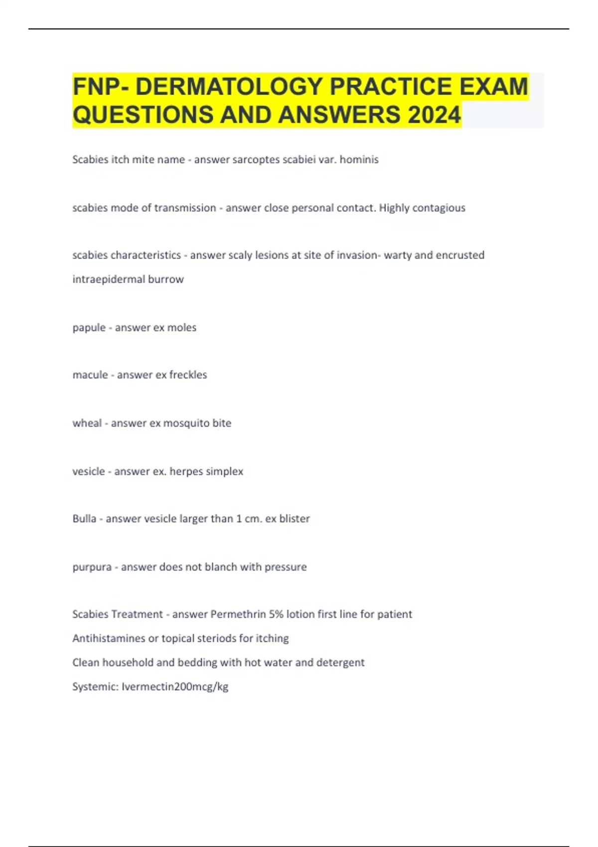 FNP- DERMATOLOGY PRACTICE EXAM QUESTIONS AND ANSWERS 2024