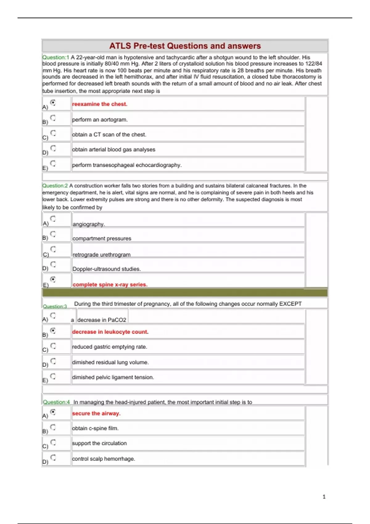 ATLS Pre-test Questions and answers Question:1 A 22-year-old man is hypotensive and tachycardic after a shotgun wound to the left shoulder. His blood pressure is initially 80/40 mm Hg. After 2 liters of crystalloid solution his blood pressure increases to 122/84 mm Hg. His heart rate is now 100 beats per minute and his respiratory rate is 28 breaths per minute. His breath sounds are decreased in the left hemithorax, and after initial IV fluid resuscitation, a closed tube thoracostomy is performed for decreased left breath sounds with the return of a small amount of blood and no air leak. After chest tube insertion, the most appropriate next step is A) reexamine the chest. B) perform an aortogram. C) obtain a CT scan of the chest. D) obtain arterial blood gas analyses E) perform transesophageal echocardiography. Question:2 A construction worker falls two stories from a building and sustains bilateral calcaneal fractures. In the emergency department, he is alert, vital signs are normal, and he is complaining of severe pain in both heels and his lower back. Lower extremity pulses are strong and there is no other deformity. The suspected diagnosis is most likely to be confirmed by A) B) C) D) E) Question:3 A) angiography. compartment pressures retrograde urethrogram Doppler-ultrasound studies. complete spine x-ray series. During the third trimester of pregnancy, all of the following changes occur normally EXCEPT a decrease in PaCO2 B) decrease in leukocyte count. C) reduced gastric emptying rate. D) dimished residual lung volume. E) dimished pelvic ligament tension. Question:4 In managing the head-injured patient, the most important initial step is to A) secure the airway. B) obtain c-spine film. C) support the circulation D) control scalp hemorrhage. 1 E) determine the GCS Score. Question:5 A previously healthy, 70-kg (154-pound) man suffers an estimated acute blood loss of 2 liters. Which one of the following statements applies to this patient? A) His pulse pressure will be widened. B) His urinary output will be at the lower limits of normal. C) He will have tachycardia, but no change in his systolic blood pressure. D) His systolic blood pressure will be decreased with a narrowed pulse pressure. E) His systolic blood pressure will be maintained with an elevated diastolic pressure. Question:6 The physiologic hypervolemia of pregnancy has clinical significance in the management of the severely injured, gravid woman by A) reducing the need for blood transfusion. B) increasing the risk of pulmonary edema. C) complicating the mangement of closed head injury. D) reducing the volume of crystalloid required for resuscitation. E) Question:7 A) B) C) D) E) increasing the volume of blood loss to produce maternal hypotension. The best guide for adequate fluid resuscitation of the burn patient is adequate urinary output. reversal of systemic acidosis. normalization of the heart rate. a normal central venous pressure. 4 mL/kg/percent body burn/ 24 hours. Question:8 Establishing a diagnosis of shock must include A) hypoxemia. B) acidosis. C) hypotension. D) increased vascular resistance. E) evidence of inadequate organ perfusion. Question:9 A 7-year-old boy is brought to the emergency department by his parents several minutes after he fell 2 through a window. He is bleeding profusely from a 6-cm wound of his medial right thigh. Immediate management of the wound should consist of A) application of a tourniquet. B) direct pressure on the wound. C) packing the wound with gauze. D) direct pressure on the femoral artery at the groin. E) debridement of devitalized tissue. Question:10 For the patient with severe traumatic brain injury, profound hypocarbia should be avoided to prevent A) respiratory alkalosis. B) metabolic acidosis. C) cerebral vasoconstriction with diminished perfusion. D) neurogenic pulmonary edema. E) shift of the oxyhemoglobin dissociation curve. Question:11 A 25-year-old man is brought to a hospital with a general surgeon after being involved in a motor vehicle crash. He has a GCS of 13 and complains of abdominal pain. His blood pressure was 80 mm Hg systolic by palpation on arrival at the hospital, but increases to 110/70 mm Hg with the administration of 2 liters of intravenous fluid. His heart rate remains 120 beats per minute. Computed tomography shows an aortic injury and splenic laceration with free abdominal fluid. His blood pressure falls to 70 mm Hg after CT. The next step is A) contrast angiography. B) transfer to a higher level trauma center. C) exploratory laparotomy. D) transfuse packed red blood cells. E) transesophageal echocardiography. Question:12 Which one of the following statements regarding abdominal trauma in the pregnant patient is TRUE? A) The fetus is in jeopardy only with major abdominal trauma. B) Leakage of amniotic fluid is an indication for hospital admission. C) Indications for peritoneal lavage are different from those in the nonpregnant patient. D) Penetration of an abdominal hollow viscus is more common in late than in early pregnancy. E) The secondary survey follows a pattern from that of the nonpregnant patient. Question:13 The first maneuver to improve oxygenation after chest injury is 3 A) intubate the patient. B) assess arterial blood gases. C) administer supplemental oxygen. D) ascertain the need for a chest tube. E) obtain a chest x-ray. Question:14 A 25-year-old man, injured in a motor vehicular crash, is admitted to the emergency department. His pupils react sluggishly and his eyes open to painful stimuli. He does not follow commands, but he does moan periodically. His right arm is deformed and does not respond to painful stimulus; however, his left hand reaches purposefully toward the painful stimulus. Both legs are stiffly extended. His GCS Score is A) 2 B) 4 C) 6 D) 9 E) 12 Question:15 A 20-year-old woman, at 32 weeks gestation, is stabbed in the upper right chest. In the emergency department, her blood pressure is 80/60 mm Hg. She is gasping for