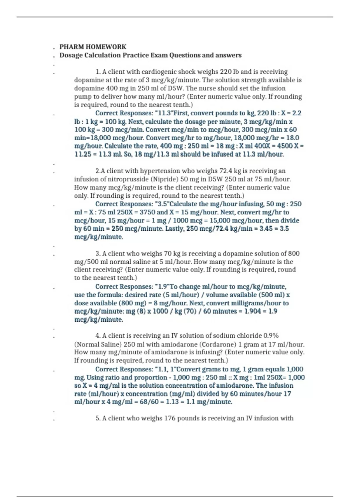A client with cardiogenic shock weighs 220 lb and is receiving dopamine at the rate of 3 mcg/kg/minute. The solution strength available is dopamine 400 mg in 250 ml of D5W. The nurse should set the infusion pump to deliver how many ml/hour? (Enter numeric value only. If rounding is required, round to the nearest tenth.) . Correct Responses: "11.3"First, convert pounds to kg, 220 lb : X = 2.2 lb : 1 kg = 100 kg. Next, calculate the dosage per minute, 3 mcg/kg/min x 100 kg = 300 mcg/min. Convert mcg/min to mcg/hour, 300 mcg/min x 60 min=18,000 mcg/hour. Convert mcg/hr to mg/hour, 18,000 mcg/hr = 18.0 mg/hour. Calculate the rate, 400 mg : 250 ml = 18 mg : X ml 400X = 4500 X = 11.25 = 11.3 ml. So, 18 mg/11.3 ml should be infused at 11.3 ml/hour. . . 2.A client with hypertension who weighs 72.4 kg is receiving an infusion of nitroprusside (Nipride) 50 mg in D5W 250 ml at 75 ml/hour. How many mcg/kg/minute is the client receiving? (Enter numeric value only. If rounding is required, round to the nearest tenth.) . Correct Responses: "3.5"Calculate the mg/hour infusing, 50 mg : 250 ml = X : 75 ml 250X = 3750 and X = 15 mg/hour. Next, convert mg/hr to mcg/hour, 15 mg/hour = 1 mg / 1000 mcg = 15,000 mcg/hour, then divide by 60 min = 250 mcg/minute. Lastly, 250 mcg/72.4 kg/min = 3.45 = 3.5 mcg/kg/minute. . . 3. A client who weighs 70 kg is receiving a dopamine solution of 800 mg/500 ml normal saline at 5 ml/hour. How many mcg/kg/minute is the client receiving? (Enter numeric value only. If rounding is required, round to the nearest tenth.) . Correct Responses: "1.9"To change ml/hour to mcg/kg/minute, use the formula: desired rate (5 ml/hour) / volume available (500 ml) x dose available (800 mg) = 8 mg/hour. Next, convert milligrams/hour to mcg/kg/minute: mg (8) x 1000 / kg (70) / 60 minutes = 1.904 = 1.9 mcg/kg/minute. . . 4. A client is receiving an IV solution of sodium chloride 0.9% (Normal Saline) 250 ml with amiodarone (Cordarone) 1 gram at 17 ml/hour. How many mg/minute of amiodarone is infusing? (Enter numeric value only. If rounding is required, round to the nearest tenth.) . Correct Responses: "1.1, 1"Convert grams to mg, 1 gram equals 1,000 mg. Using ratio and proportion - 1,000 mg : 250 ml :: X mg : 1ml 250X= 1,000 so X = 4 mg/ml is the solution concentration of amiodarone. The infusion rate (ml/hour) x concentration (mg/ml) divided by 60 minutes/hour 17 ml/hour x 4 mg/ml = 68/60 = 1.13 = 1.1 mg/minute. . . 5. A client who weighs 176 pounds is receiving an IV infusion with esmolol hydrochloride (Brevibloc) at 48 ml/hour. The IV solution is labeled with the concentration of Brevibloc 10 mg/ml. How many mcg/kg/minute is the client receiving? (Enter numeric value only.) . Correct Responses: "100"Convert pounds to kg by dividing 176 pounds by 2.2 pounds = 80 kg. Convert the IV concentration from mg to mcg. 1 mg : 1000 mcg :: 10 mg : 10,000 mcg. Infusion rate (48 ml/hour) x concentration (10,000 mcg/ml) divided by 60 minutes/hour x 80 kg = 48 x 10,000 divided by 60 x 80 = 480,000 / 4800 = 100 mcg/kg/minute. . . 6. The nurse is preparing the change-of-shift report for a client who has a 265 ml secondary infusion that was started 2 hours ago at a rate of 85 ml/hour via an infusion pump. The nurse should report that how many ml remain to be infused by the on-coming nurse? (Enter numeric value only.) . Correct Responses: "95"85 ml x 2 hours = 170 ml has infused. 265 ml (total amount to be infused) - 170 ml (amount infused) = 95 ml remain to be infused. . . 7.A male client receives a prescription for ondansetron hydrochloride (Zofran) 4 mg IV to prevent postoperative nausea after an inguinal hernia repair. The medication is available in 2 mg/ml. How many ml should the nurse administer? (Enter numeric value only.) . Correct Responses: "2"Use ratio and proportion, 4 mg : X ml = 2 mg : 1 ml 2X = 4 X = 2 . . 8. The nurse is preparing to administer Hepatitis B Vaccine, Recombinant (Energix-B) 5 mcg IM to a school-aged child. The vaccine is labeled, 10 mcg/ml. How many ml should the nurse administer? (Enter numeric value only. If rounding is required, round to the nearest tenth). . Correct Responses: "0.5, 1"Use ratio and proportion, 5 mcg : X ml :: 10 mcg : 1ml 10X = 5 X = 0.5 ml . . 9. A client's daily PO prescription for aripiprazole (Abilify) is increased from 15 mg to 30 mg. The medication is available in 15 mg tablets, and the client already received one tablet today. How many additional tablets should the nurse administer so the client receives the total newly prescribed dose for the day? (Enter numeric value only.) . Correct Responses: "1"30 mg (total dose) - 15 mg (dose already administered) = 15 mg that still needs to be administered. Using the Desired/Have formula: 15 mg/15 mg = 1 tablet . . 10. At the end of the shift, the nurse is recording the fluid balance for a client receiving a continuous gastrostomy tube (GT) feeding. Based on the client's records, how many ml should the nurse record for the total fluid balance (intake - output) for the shift that started at 0700 and ended at 1900? (Enter numeric value only.) (Click on each image asset for additional information.) Correct Responses: "695"The tube feeding is administered at 75 ml/hour for 11 hours () and then turned off for one hour because the residual is greater than 200 ml. 11 hours x 75 ml/hr = 825 ml. Three doses of 20 ml of medication are administered, with 10 ml of water used to flush the GT before and after each dose. 20 ml x 3 doses = 60 ml; 10 ml (flush) x 2 x 3 doses = 60 ml; so 825 ml + 60 ml + 60 ml = 945 ml. 250 ml of residual is removed and not replaced. 945 ml - 250 ml = 695 ml total fluid balance (Intake - output). . . 11. The nurse is administering a 250 milliliter (ml) intravenous solution to be infused over 2 hours. How many ml/hour should the nurse program the infusion pump? (Enter numeric value only.) . Correct Responses: "125"250 ml : 2 hours = X ml : 1 hour 250 = 2X X = 250 divided by 2 = 125 ml/hr . . 12. The nu