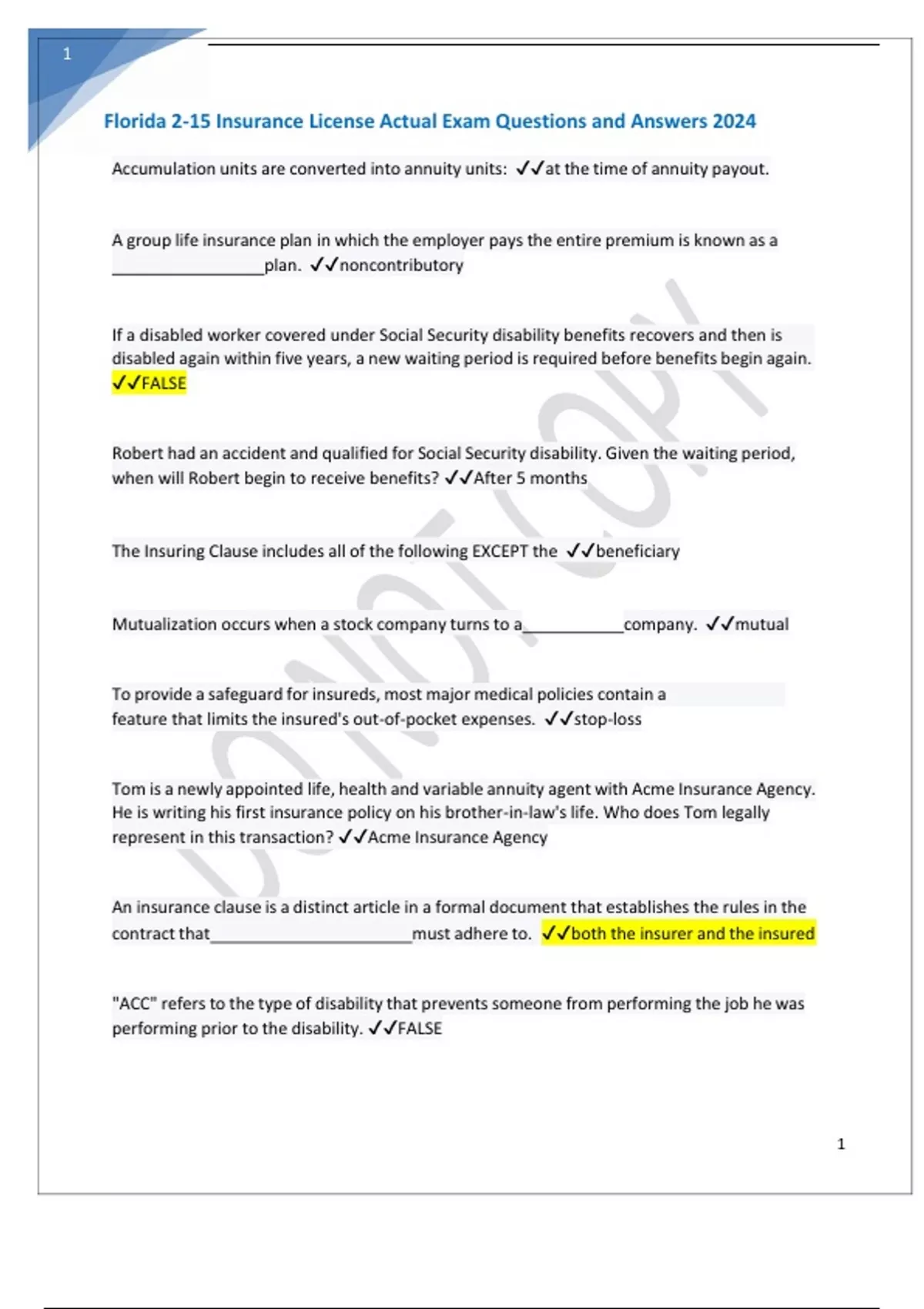 Florida 2-15 Insurance License Actual Exam Questions and Answers 2024
