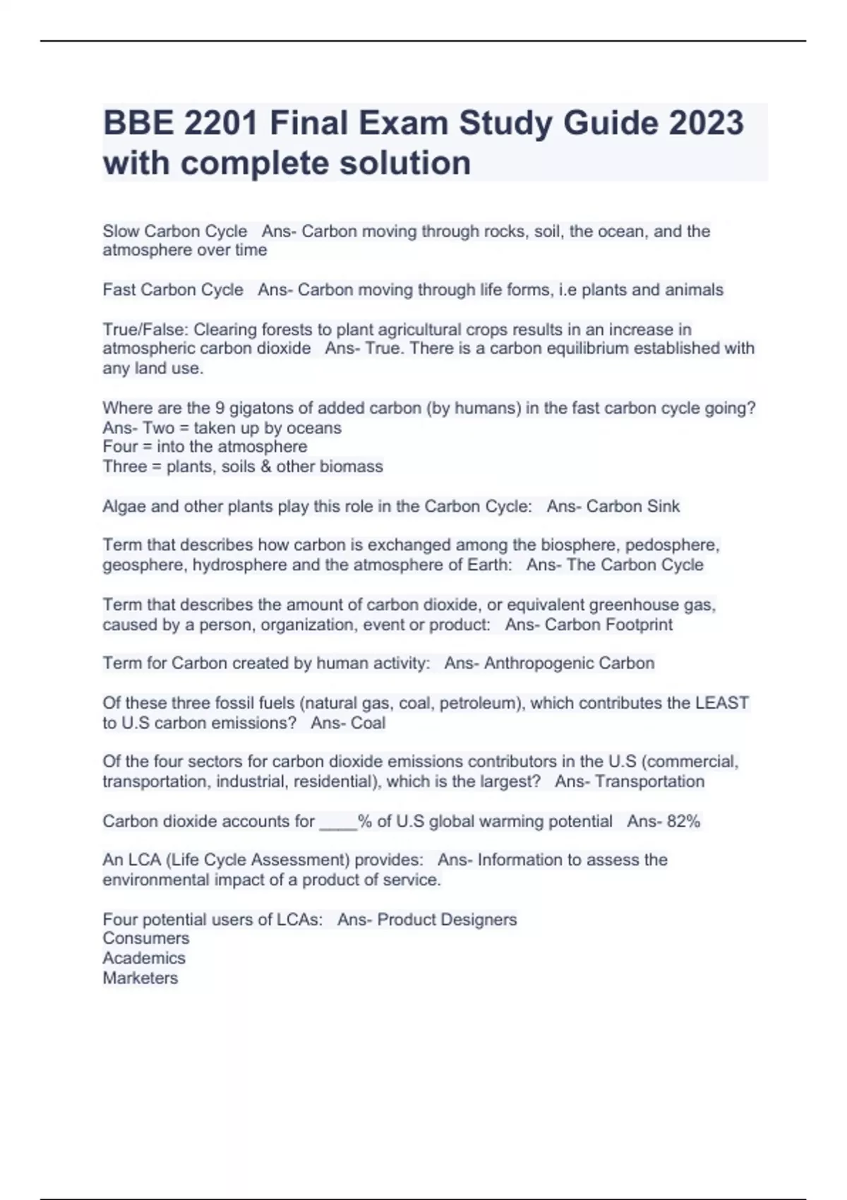 BBE 2201 Final Exam Study Guide 2023 with complete solution