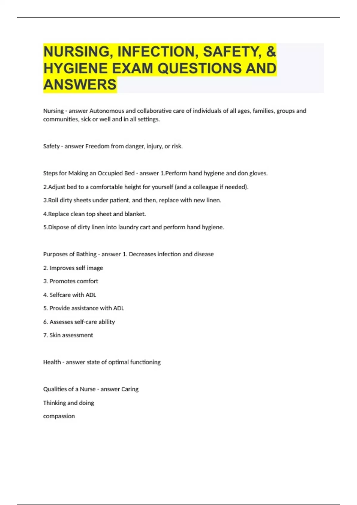 NURSING, INFECTION, SAFETY, & HYGIENE EXAM QUESTIONS AND ANSWERS