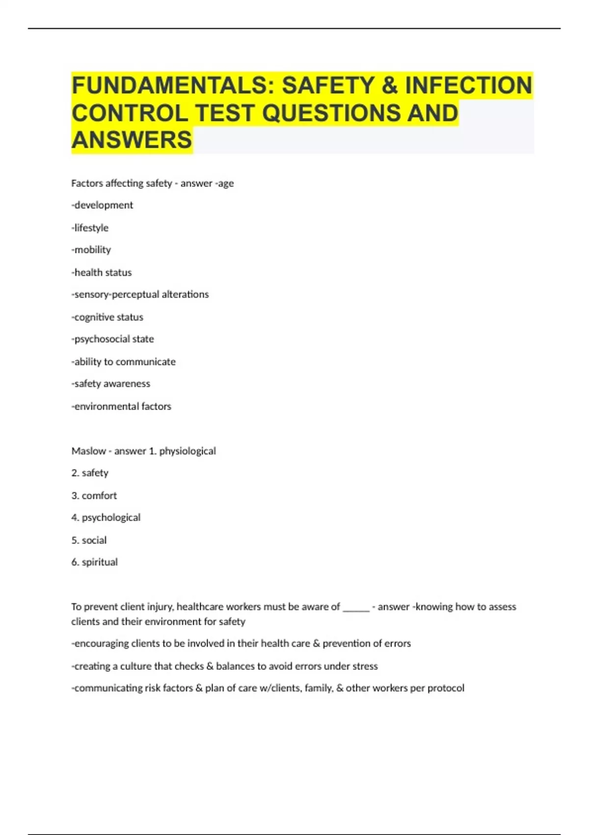 FUNDAMENTALS SAFETY & INFECTION CONTROL TEST QUESTIONS AND ANSWERS