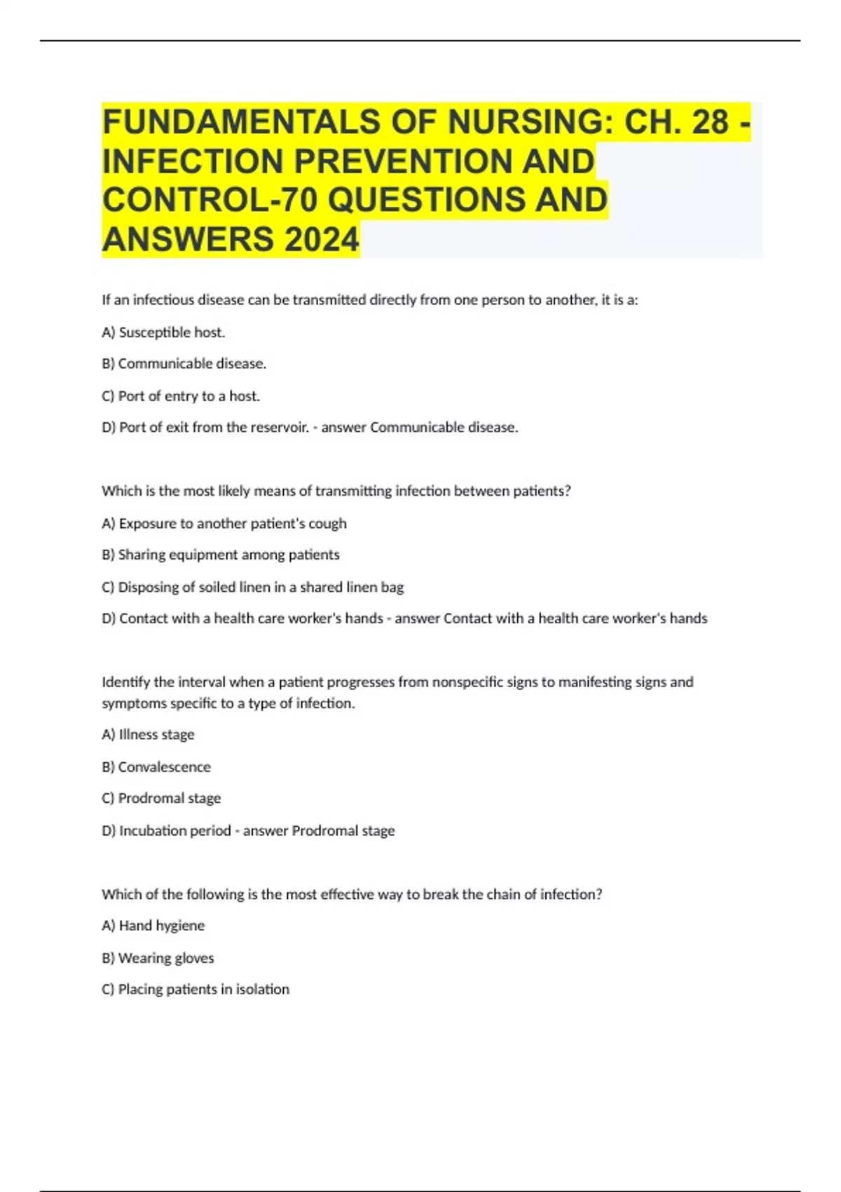 FUNDAMENTALS OF NURSING CH. 28 - INFECTION PREVENTION AND CONTROL-70 QUESTIONS AND ANSWERS