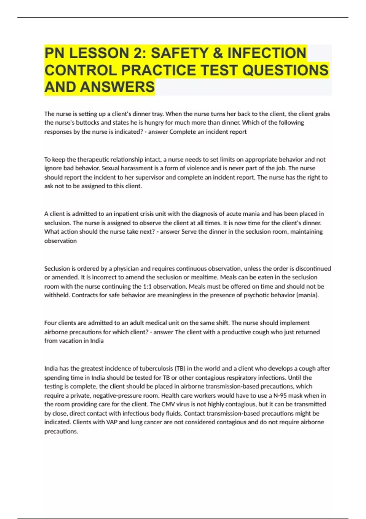 PN LESSON 2 SAFETY & INFECTION CONTROL PRACTICE TEST QUESTIONS AND ANSWERS