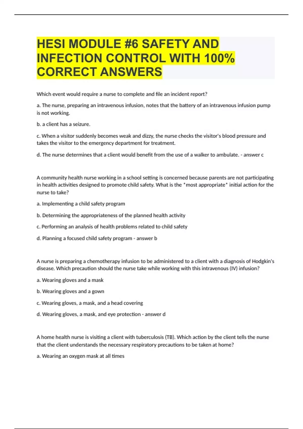 Which event would require a nurse to complete and file an incident report? a. The nurse, preparing an intravenous infusion, notes that the battery of an intravenous infusion pump is not working. b. a client has a seizure. c. When a visitor suddenly becomes weak and dizzy, the nurse checks the visitor's blood pressure and takes the visitor to the emergency department for treatment. d. The nurse determines that a client would benefit from the use of a walker to ambulate. c A community health nurse working in a school setting is concerned because parents are not participating in health activities designed to promote child safety. What is the most appropriate initial action for the nurse to take? a. Implementing a child safety program b. Determining the appropriateness of the planned health activity c. Performing an analysis of health problems related to child safety d. Planning a focused child safety program b Brainpower Read More 0:03 / 0:15 A nurse is preparing a chemotherapy infusion to be administered to a client with a diagnosis of Hodgkin's disease. Which precaution should the nurse take while working with this intravenous (IV) infusion? a. Wearing gloves and a mask b. Wearing gloves and a gown c. Wearing gloves, a mask, and a head covering d. Wearing gloves, a mask, and eye protection d A home health nurse is visiting a client with tuberculosis (TB). Which action by the client tells the nurse that the client understands the necessary respiratory precautions to be taken at home? a. Wearing an oxygen mask at all times b. Staying secluded in the bedroom c. Disposing of contaminated tissues in a container with a leak-proof bag d. Keeping the house closed up to minimize the spread of disease c A nurse provides instruction to a new nursing assistant regarding the application of a restraint to a client. The nurse watches as the nursing assistant applies the restraint. What observation tells the nurse that the nursing assistant is using correct procedure? a. The assistant secures the restraint in such a way that it is impossible to slip a finger between the restraint and the client's skin. b. The assistant applies a tie knot in the restraint strap. c. The assistant attaches the restraint straps securely to the side rails. d. The assistant applies the restraint so that the strap does not tighten when force is applied against it. d A nurse receives a telephone call from the admissions office and is told that a client scheduled for an internal radiation implant will be admitted to the nursing unit. Which of the following precautions does the nurse include in the client's plan of care? a. Wearing gloves when emptying the client's bedpan b. Placing used linen in double bags and sending a bag to the laundry room every evening c. Allowing the client to ambulate in the hall only once a day d. Placing the client in a semiprivate room at the end of a hallway a A home care nurse is instructing a client in the use of ice packs to treat an eye injury. What does the nurse instruct the client to do? a. Wrap a plastic bag filled with ice in a pillowcase and place it on the eye b. Avoid the use of commercially prepared ice bags c. Place the ice pack directly on the eye d. Keep the ice pack on the eye continuously for 24 hours a A nurse is assisting with disaster relief after a tornado. The nurse's goal with the overall community is to prevent as much injury and death resulting from the uncontrollable event as possible. Finding safe housing for survivors, providing support to families, organizing counseling sessions, and securing physical care when needed are all examples of which level of prevention? a. secondary b. primary c. initial d. tertiary d A staff nurse caring for a client with a head injury notes that the client is restless and pulling at the intravenous (IV) line. The client's primary health care provider does not want to prescribe sedation, and the family has requested that the client not be restrained. Which action by the nurse is best? a. Asking a family member to sit with the client b. Telling the family that the application of wrist restraints is critical in preventing injury to the client c. Asking a nursing assistant to monitor the client d. Staying with the client and consulting with the nurse manager about the situation d An industrial nurse at a large factory provides information to the employees in the mailroom and shipping department about the signs of skin (cutaneous) anthrax. For which early sign of cutaneous anthrax does the nurse tell the employees to check their skin? a. a weeping blister b. a black skin area of skin c. an itchy bump d. an open ulcer c An older client in a long-term care facility is at risk for injury because of confusion. Which of the following devices would be the best choice to help prevent injury while the client is in bed? a. mittens b. bed alarm c. wrist restraints d. belt b A nurse caring for a 9-month-old who has undergone repair of a cleft palate applies elbow restraints to the child. The mother visits her child and asks the nurse to remove the restraints. According to the guidelines for the use of restraints, what should the nurse do in response to the mother's request? a. Remove a restraint from one extremity b. Tell the mother that the restraints may not be removed c. remove both restraints d. Loosen the restraints after telling the mother that they may not be removed a A client with a new diagnosis of tuberculosis (TB) is being admitted to the hospital. During the collection of data from the client, which of the following considerations is most important? a. The name of the person from whom the client contracted TB, so that the person may be reported for follow-up care b. What medications have been prescribed and what the client knows about his or her side effects c. The religious affiliation or church of preference d. The names of close friends and family members d An adolescent client asks the nurse questions about the transmission of the Epstein-Ba