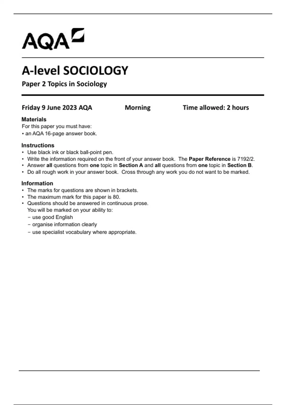 AQA A-level SOCIOLOGY Paper 2 Topics in Sociology 7192-2-QP-Sociology-A-9Jun23