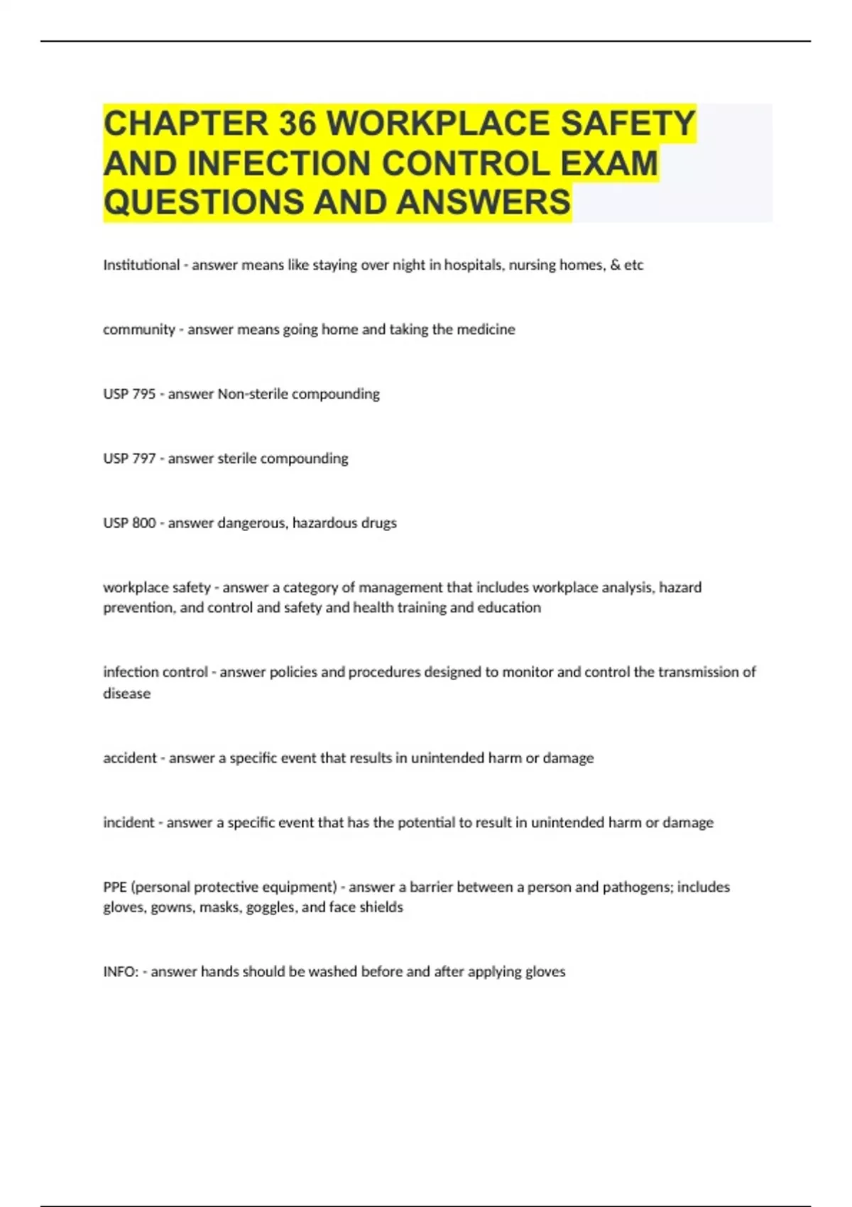 CHAPTER 36 WORKPLACE SAFETY AND INFECTION CONTROL EXAM QUESTIONS AND ANSWERS.