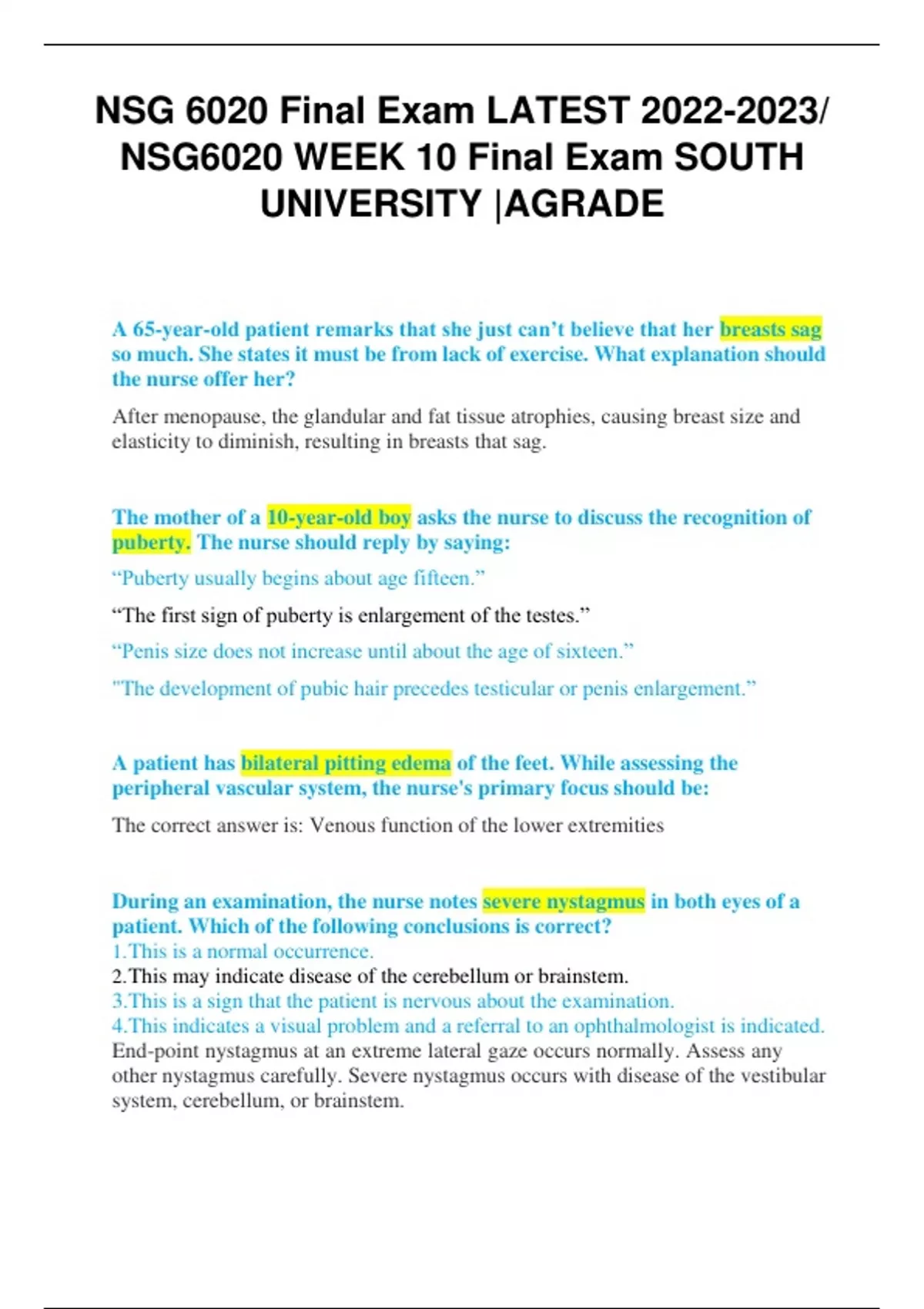 NSG 6020 Final Exam LATEST / NSG6020 WEEK 10 Final Exam SOUTH UNIVERSITY |AGRADE A 65-year-old patient remarks that she just can’t believe that her breasts sag so much. She states it must be from lack of exercise. What explanation should the nurse offer her? After menopause, the glandular and fat tissue atrophies, causing breast size and elasticity to diminish, resulting in breasts that sag. The mother of a 10-year-old boy asks the nurse to discuss the recognition of puberty. The nurse should reply by saying: “Puberty usually begins about age fifteen.” “The first sign of puberty is enlargement of the testes.” “Penis size does not increase until about the age of sixteen.” "The development of pubic hair precedes testicular or penis enlargement.” A patient has bilateral pitting edema of the feet. While assessing the peripheral vascular system, the nurse's primary focus should be: The correct answer is: Venous function of the lower extremities During an examination, the nurse notes severe nystagmus in both eyes of a patient. Which of the following conclusions is correct? 1.This is a normal occurrence. 2.This may indicate disease of the cerebellum or brainstem. 3.This is a sign that the patient is nervous about the examination. 4.This indicates a visual problem and a referral to an ophthalmologist is indicated. End-point nystagmus at an extreme lateral gaze occurs normally. Assess any other nystagmus carefully. Severe nystagmus occurs with disease of the vestibular system, cerebellum, or brainstem. When performing a musculoskeletal assessment, the nurse knows the correct approach for the examination should be: proximal to distal A 43-year-old woman is at the clinic for a routine examination. She reports that she has had a breast lump in her right breast for years. Recently, it has begun to change in consistency and is becoming harder. She reports that 5 years ago her physician evaluated the lump and determined that it “was nothing to worry about.” The examination validates the presence of a mass in the right upper outer quadrant at 1 o’clock, approximately 5 cm from the nipple. It is firm, mobile, nontender, with borders that are not well defined. The nurse’s recommendation to her is: “Because of the change in consistency of the lump, it should be further evaluated by a physician.” The nurse practitioner is examining a 3-month-old infant. While holding the thumbs on the infant's inner–mid-thighs and the fingers outside on the hips, touching the greater trochanter, the nurse practitioner adducts the legs until the nurse practitioner's thumbs touch and then abducts the legs until the infant's knees touch the table. The nurse practitioner does not note any "clunking" sounds and is confident to record a: Negative Ortolani's sign. A patient's mother has noticed that her son, who has been to a new babysitter, has some blisters and scabs on his face and buttocks. On examination, the nurse notices moist, thin-roofed vesicles with a thin erythematous base and suspects: Impetigo The nurse is testing superficial reflexes on an adult patient. When stroking up the lateral side of the sole and across the ball of the foot, the nurse notices the plantar flexion of the toes. How would the nurse document this finding? 1.Positive Babinski sign 2.Plantar reflex abnormal 3.Plantar reflex present 4.Plantar reflex “2+” on a scale from “0 to 4+” With the same instrument, draw a light stroke up the lateral side of the sole of the foot and across the ball of the foot, like an upside-down “J.” The normal response is plantar flexion of the toes and sometimes of the whole foot. A woman is in the family planning clinic seeking birth control information. She states that her breasts “change all month long” and that she is worried that this is unusual. What is the nurse’s best response? Tell her that, because of the changing hormones during the monthly menstrual cycle, cyclic breast changes are common. A patient states during the interview that she noticed a new breast lump in the shower a few days ago. It was on her left breast nea