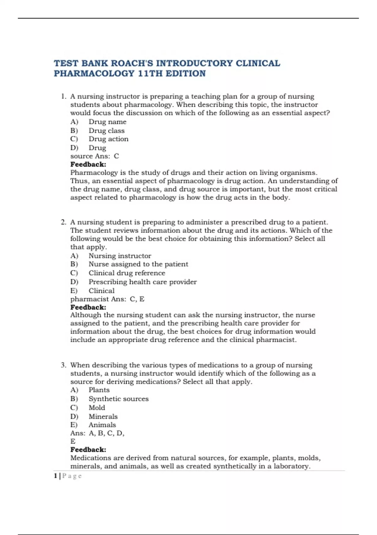 TEST BANK ROACH'S INTRODUCTORY CLINICAL PHARMACOLOGY 11TH EDITION1. A nursing instructor is preparing a teaching plan for a group of nursing students about pharmacology. When describing this topic, the instructor would focus the discussion on which of the following as an essential aspect? A) Drug name B) Drug class C) Drug action D) Drug source Ans: C Feedback: Pharmacology is the study of drugs and their action on living organisms. Thus, an essential aspect of pharmacology is drug action. An understanding of the drug name, drug class, and drug source is important, but the most critical aspect related to pharmacology is how the drug acts in the body. 2. A nursing student is preparing to administer a prescribed drug to a patient. The student reviews information about the drug and its actions. Which of the following would be the best choice for obtaining this information? Select all that apply. A) Nursing instructor B) Nurse assigned to the patient C) Clinical drug reference D) Prescribing health care provider E) Clinical pharmacist Ans: C, E Feedback: Although the nursing student can ask the nursing instructor, the nurse assigned to the patient, and the prescribing health care provider for information about the drug, the best choices for drug information would include an appropriate drug reference and the clinical pharmacist. 3. When describing the various types of medications to a group of nursing students, a nursing instructor would identify which of the following as a source for deriving medications? Select all that apply. A) Plants B) Synthetic sources C) Mold D) Minerals E) Animals Ans: A, B, C, D, E Feedback: Medications are derived from natural sources, for example, plants, molds, minerals, and animals, as well as created synthetically in a laboratory. 1 | P a g e4. Which of the following names may be assigned to a drug during the process of development? Select all that apply. A) Chemical name B) Official name C) Pharmacologic name D) Trade name E) Nonproprietary name Ans: A, B, D, E Feedback: Throughout the process of development, drugs may have several names assigned to them including a chemical name, a generic (nonproprietary) name, an official name, and a trade or brand name. 5. A drug may be classified by which of the following? Select all that apply. A) The chemical type of the drug's active ingredient B) The way the drug is used to treat a specific condition C) The generic name of the drug D) The trade name of the drug E) The nonproprietary name of the drug Ans: A, B Feedback: A drug may be classified by the chemical type of the active ingredient or by the way it is used to treat a particular condition. Generic, trade, and nonproprietary refer to how a drug is named. 6. A group of nursing students are reviewing information about the process of drug development in the United States. The students demonstrate understanding of this process when they identify that which of the following categories are assigned by the Food and Drug Administration to newly approved drugs? Select all that apply. A) Metabolite B) Noncontrolled substance C) Prescription D) Nonprescription E) Controlled substance Ans: C, D, E Feedback: Once drugs are approved for use, the FDA assigns the drug to one of the following categories: prescription, nonprescription, or controlled substance. Metabolite refers to the inactive form of the drug. Noncontrolled substance is a term that is not used. 7. Which of the following would be most important for the nurse to do to ensure the safe use of prescription drugs in the institutional setting? Select all that apply. A) Administering drugs B) Monitoring clients for drug effects 2 | P a g eC) Prescribing drugs D) Evaluating clients for toxic effects E) Educating clients/caregivers about drugs Ans: A, B, D, E Feedback: In the institutional setting, the nurse's role to ensure safe use of prescription drugs includes administering drugs, monitoring drug effects, evaluating for toxic effects, and educating clients and caregivers about drugs. 8. The nurse is helping a client review a prescription from the health care provider. When examining the prescription, which of the following would the nurse expect to find documented? Select all that apply. A) Name of the drug B) Dosage of the drug C) Route of drug administration D) Times of drug administration E) Licensed prescriber's signature Ans: A, B, C, D, E Feedback: The prescription must contain the client's name, the name of the drug, the dosage, the method and times of administration, and the signature of the licensed health care provider prescribing the drug. 9. After teaching a group of nursing students about nonprescription drugs, the nursing instructor determines that the teaching was successful when the students identify which of the following? Select all that apply. A) They require a licensed health care provider's signature. B) They are referred to as over-the-counter drugs. C) They can be taken without risk to the client. D) They have certain labeling requirements. E) They should be taken only as directed on the label. Ans: B, D, E Feedback: Nonprescription drugs are often referred to as over-the-counter (OTC) drugs. They do not require a prescription (a licensed health care provider's signature) but do not come without risk to the client. The federal government has imposed labeling requirements of OTC drugs and they should only be taken as directed on the label unless under the supervision of a health care provider. 10. A nursing student is reviewing information about the Controlled Substances Act of 1970. The student would expect to find which of the following as being regulated for drugs classified as controlled substances? Select all that apply. A) Manufacturing B) Elimination C) Distribution D) Formulation 3 | P a g eE) Dispensin g Ans: A, C, E Feedback: The Controlled Substances Act of 1970 regulates the manufacture, distribution, and dispensing of drugs classified as controlled substances. Elimination refers to t