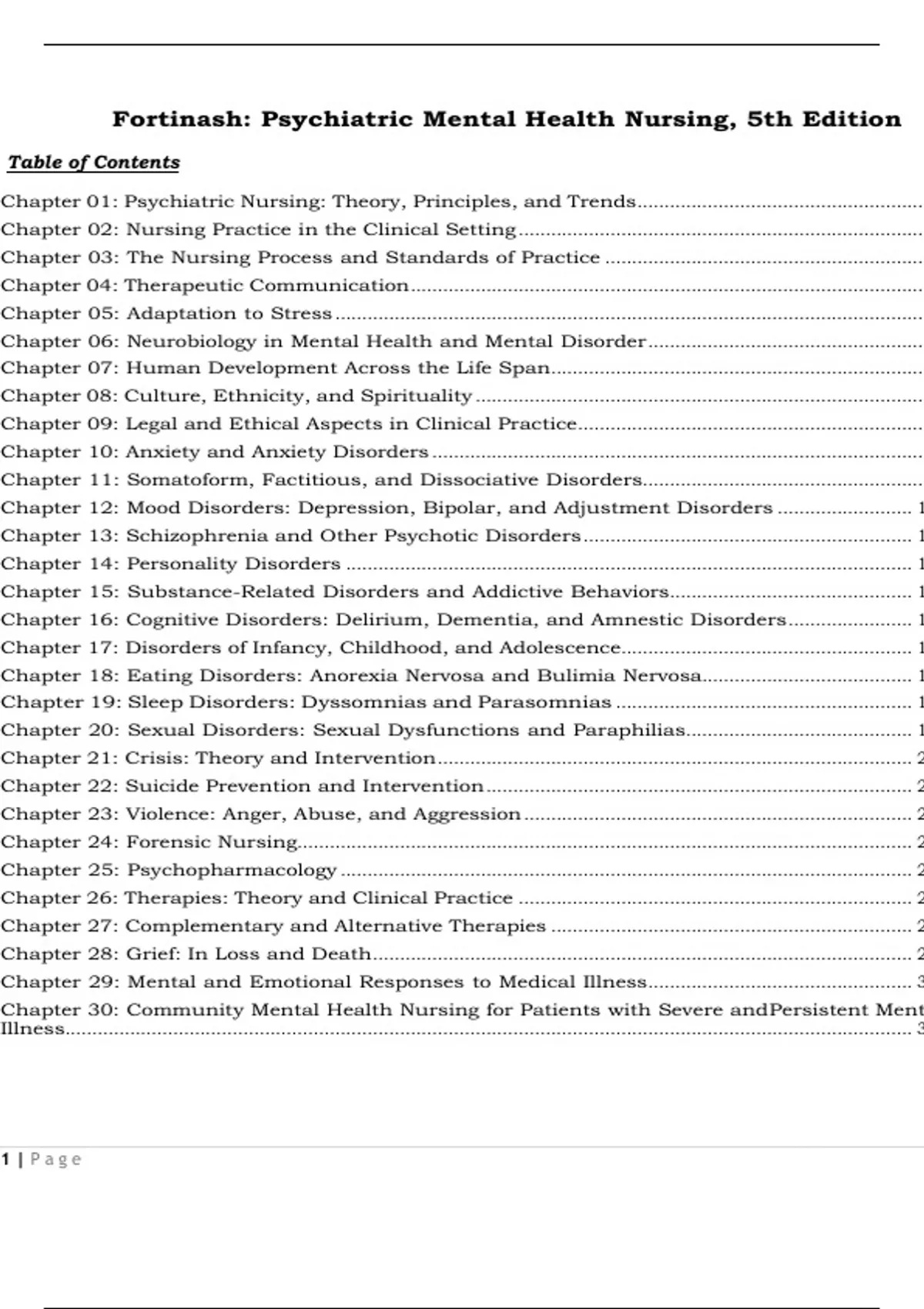 TEST BANK PSYCHIATRIC MENTAL HEALTH NURSING 5TH EDITION FORTINASHTable of Contents Chapter 01: Psychiatric Nursing: Theory, Principles, and Trends ....................................................... 2 Chapter 02: Nursing Practice in the Clinical Setting ............................................................................. 8 Chapter 03: The Nursing Process and Standards of Practice ........................................................... 14 Chapter 04: Therapeutic Communication ............................................................................................... 25 Chapter 05: Adaptation to Stress ............................................................................................................. 39 Chapter 06: Neurobiology in Mental Health and Mental Disorder ................................................... 45 Chapter 07: Human Development Across the Life Span ..................................................................... 54 Chapter 08: Culture, Ethnicity, and Spirituality ................................................................................... 63 Chapter 09: Legal and Ethical Aspects in Clinical Practice ................................................................ 76 Chapter 10: Anxiety and Anxiety Disorders ........................................................................................... 85 Chapter 11: Somatoform, Factitious, and Dissociative Disorders.................................................... 97 Chapter 12: Mood Disorders: Depression, Bipolar, and Adjustment Disorders ......................... 105 Chapter 13: Schizophrenia and Other Psychotic Disorders ............................................................. 121 Chapter 14: Personality Disorders ......................................................................................................... 135 Chapter 15: Substance-Related Disorders and Addictive Behaviors............................................. 146 Chapter 16: Cognitive Disorders: Delirium, Dementia, and Amnestic Disorders ....................... 158 Chapter 17: Disorders of Infancy, Childhood, and Adolescence ...................................................... 170 Chapter 18: Eating Disorders: Anorexia Nervosa and Bulimia Nervosa....................................... 182 Chapter 19: Sleep Disorders: Dyssomnias and Parasomnias ....................................................... 193 Chapter 20: Sexual Disorders: Sexual Dysfunctions and Paraphilias .......................................... 199 Chapter 21: Crisis: Theory and Intervention ........................................................................................ 207 Chapter 22: Suicide Prevention and Intervention ............................................................................... 218 Chapter 23: Violence: Anger, Abuse, and Aggression ........................................................................ 232 Chapter 24: Forensic Nursing.................................................................................................................. 246 Chapter 25: Psychopharmacology .......................................................................................................... 252 Chapter 26: Therapies: Theory and Clinical Practice ......................................................................... 267 Chapter 27: Complementary and Alternative Therapies ................................................................... 284 Chapter 28: Grief: In Loss and Death .................................................................................................... 292 Chapter 29: Mental and Emotional Responses to Medical Illness ................................................. 303 Chapter 30: Community Mental Health Nursing for Patients with Severe and Persistent Mental Illness ............................................................................................................................................................. 311 1 | P a g eChapter 01: Psychiatric Nursing: Theory, Principles, and Trends 1. Which understanding is the basis for the nursing actions focused on minimizing mental health promotion of families with chronically mentally ill members? a. Family members are at an increased risk for mental illness. b. The mental health care system is not prepared to deal with family crises. c. Family members are seldom prepared to cope with a chronically ill individual. d. The chronically mentally ill receive care best when delivered in a formal setting. ANS: A When families live with a dominant member who has a persistent and severe mental disorder the outcomes are often expressed as family members who are at increased risk for physical and mental illnesses. The remaining options are not necessarily true. DIF: Cognitive Level: Application REF: Page 3 2. Which nursing activity shows the nurse actively engaged in the primary prevention of mental disorders? a. Providing a patient, whose depression is well managed, with medication on time b. Making regular follow-up visits to a new mother at risk for post- partum depression c. Providing the family of a patient, diagnosed with depression, information on suicide prevention d. Assisting a patient who has obsessive compulsive tendencies prepare and practice for a job interview ANS: B Primary prevention helps to reduce the occurrence of mental disorders by staying involved with a patient. Providing medication and information on existing illnesses are examples of secondary prevention which helps to reduce the prevalence of mental disorders. Assisting a mentally ill patient with preparation for a job interview is tertiary prevention since it involves rehabilitation. DIF: Cognitive Level: Application REF: Page 4 3. Which intervention reflects attention being focused on the patient’s intentions regarding his diagnosis of severe depression? a. Being placed on suicide precautions b. Encouraging visits by his family members c. Receiving a combi