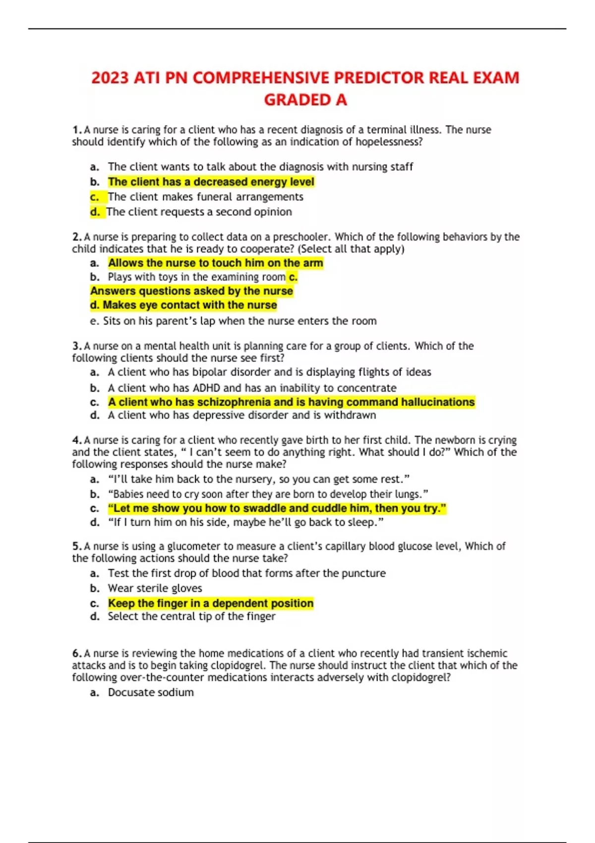 1. A nurse is caring for a client who has a recent diagnosis of a terminal illness. The nurse should identify which of the following as an indication of hopelessness? a. The client wants to talk about the diagnosis with nursing staff b. The client has a decreased energy level c. The client makes funeral arrangements d. The client requests a second opinion 2. A nurse is preparing to collect data on a preschooler. Which of the following behaviors by the child indicates that he is ready to cooperate? (Select all that apply) a. Allows the nurse to touch him on the arm b. Plays with toys in the examining room c. Answers questions asked by the nurse d. Makes eye contact with the nurse e. Sits on his parent’s lap when the nurse enters the room 3. A nurse on a mental health unit is planning care for a group of clients. Which of the following clients should the nurse see first? a. A client who has bipolar disorder and is displaying flights of ideas b. A client who has ADHD and has an inability to concentrate c. A client who has schizophrenia and is having command hallucinations d. A client who has depressive disorder and is withdrawn 4. A nurse is caring for a client who recently gave birth to her first child. The newborn is crying and the client states, “ I can’t seem to do anything right. What should I do?” Which of the following responses should the nurse make? a. “I’ll take him back to the nursery, so you can get some rest.” b. “Babies need to cry soon after they are born to develop their lungs.” c. “Let me show you how to swaddle and cuddle him, then you try.” d. “If I turn him on his side, maybe he’ll go back to sleep.” 5. A nurse is using a glucometer to measure a client’s capillary blood glucose level, Whic
