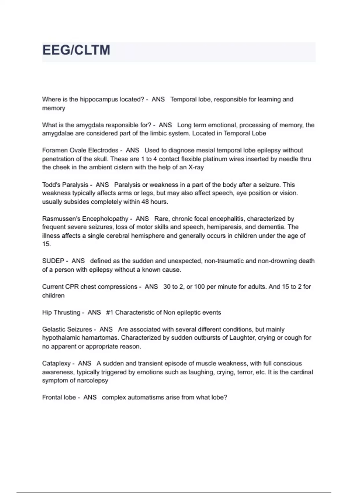 EEG/CLTM EXAM QUESTIONS AND ANSWERS ALL VERIFIED Where is the hippocampus located? - ANS Temporal lobe, responsible for learning and memory What is the amygdala responsible for? - ANS Long term emotional, processing of memory, the amygdalae are considered part of the limbic system. Located in Temporal Lobe Foramen Ovale Electrodes - ANS Used to diagnose mesial temporal lobe epilepsy without penetration of the skull. These are 1 to 4 contact flexible platinum wires inserted by needle thru the cheek in the ambient cistern with the help of an X-ray Todd's Paralysis - ANS Paralysis or weakness in a part of the body after a seizure. This weakness typically affects arms or legs, but may also affect speech, eye position or vision. usually subsides completely within 48 hours. Rasmussen's Encepholopathy - ANS Rare, chronic focal encephalitis, characterized by frequent severe seizures, loss of motor skills and speech, hemiparesis, and dementia. The illness affects a single cerebral hemisphere and generally occurs in children under the age of 15. SUDEP - ANS defined as the sudden and unexpected, non-traumatic and non-drowning death of a person with epilepsy without a known cause. Current CPR chest compressions - ANS 30 to 2, or 100 per minute for adults. And 15 to 2 for children Hip Thrusting - ANS #1 Characteristic of Non epileptic events Gelastic Seizures - ANS Are associated with several different conditions, but mainly hypothalamic hamartomas. Characterized by sudden outbursts of Laughter, crying or cough for no apparent or appropriate reason. Cataplexy - ANS A sudden and transient episode of muscle weakness, with full conscious awareness, typically triggered by emotions such as laughing, crying, terror, etc. It is the cardinal symptom of narcolepsy Frontal lobe - ANS complex automatisms arise from what lobe? Cortical Dysplasia - ANS A congenital abnormality where the neurons in an area of the brain failed to migrate in the proper formation in utero, commonly found near the cerebral cortex and is associated with seizures Lennox Gastaut - ANS Onset between age 2 & 6. characterized by frequent seizures of different types; is often accompanied by developmental delay, psychological and behavioral problems. About half of patients will have status. interictal EEG shows slow spike-wave complexes. Keppra - ANS Levetiracetam: used for partial seizures, or as an adjunctive therapy for partial, myoclonic and tonic-clonic seizures. Juvenile Myoclonic Epilepsy (JME) - ANS Seen in ages 12 to 18, brief involuntary muscle twitching in the morning. Most have generalized seizures, many also have absence seizures. Treated with Depakote (Valproic Acid). EEG shows generalized 3-4 Hz polyspike and slow wave discharges. Often provoked by Photic and HV Temporal Lobe Epilepsy - ANS Recurrent, unprovoked seizures which originate from the temporal lobe. Seizures involve sensory changes; such as smelling an unusual odor that is not there, or a memory disturbance. The most common cause is mesial temporal sclerosis. Surgery can be complicated by decreased cognitive function. Simple Partial Seizures - ANS Are seizures involving small areas of the temporal lobe such as the amygdala and hippocampus. There is no impairment to the level of consciousness.