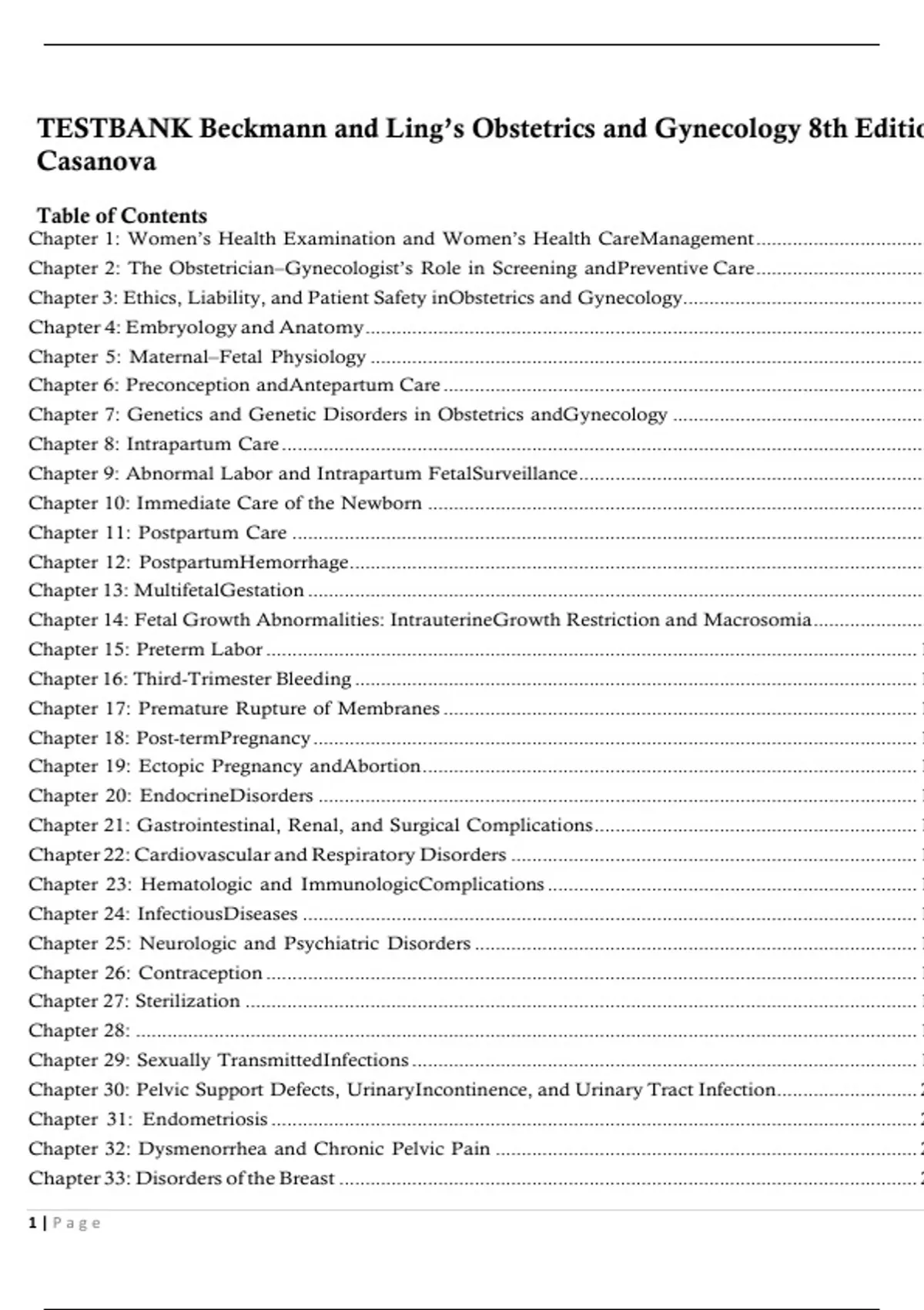 TESTBANK Beckmann and Ling’s Obstetrics and Gynecology 8th Edition CasanovaTable of Contents Chapter 1: Women’s Health Examination and Women’s Health Care Management ................................... 2 Chapter 2: The Obstetrician–Gynecologist’s Role in Screening and Preventive Care ................................... 9 Chapter 3: Ethics, Liability, and Patient Safety in Obstetrics and Gynecology............................................... 14 Chapter 4: Embryology and Anatomy ............................................................................................................ 18 Chapter 5: Maternal–Fetal Physiology ........................................................................................................... 25 Chapter 6: Preconception and Antepartum Care ............................................................................................. 33 Chapter 7: Genetics and Genetic Disorders in Obstetrics and Gynecology ................................................. 43 Chapter 8: Intrapartum Care ............................................................................................................................ 51 Chapter 9: Abnormal Labor and Intrapartum Fetal Surveillance ................................................................... 59 Chapter 10: Immediate Care of the Newborn ................................................................................................ 69 Chapter 11: Postpartum Care .......................................................................................................................... 76 Chapter 12: Postpartum Hemorrhage ............................................................................................................... 84 Chapter 13: Multifetal Gestation ....................................................................................................................... 88 Chapter 14: Fetal Growth Abnormalities: Intrauterine Growth Restriction and Macrosomia ...................... 95 Chapter 15: Preterm Labor ............................................................................................................................. 102 Chapter 16: Third-Trimester Bleeding ............................................................................................................ 110 Chapter 17: Premature Rupture of Membranes ........................................................................................... 116 Chapter 18: Post-term Pregnancy .................................................................................................................... 122 Chapter 19: Ectopic Pregnancy and Abortion ............................................................................................... 129 Chapter 20: Endocrine Disorders ................................................................................................................... 138 Chapter 21: Gastrointestinal, Renal, and Surgical Complications .............................................................. 140 Chapter 22: Cardiovascular and Respiratory Disorders .............................................................................. 145 Chapter 23: Hematologic and Immunologic Complications ....................................................................... 153 Chapter 24: Infectious Diseases ...................................................................................................................... 160 Chapter 25: Neurologic and Psychiatric Disorders ..................................................................................... 169 Chapter 26: Contraception ............................................................................................................................. 171 Chapter 27: Sterilization ................................................................................................................................. 177 Chapter 28: ...................................................................................................................................................... 184 Chapter 29: Sexually Transmitted Infections ................................................................................................. 192 Chapter 30: Pelvic Support Defects, Urinary Incontinence, and Urinary Tract Infection ........................... 203 Chapter 31: Endometriosis ............................................................................................................................ 211 Chapter 32: Dysmenorrhea and Chronic Pelvic Pain ................................................................................. 217 Chapter 33: Disorders of the Breast ............................................................................................................... 227 1 | P a g eChapter 34: Gynecologic Procedures ............................................................................................................ 233 Chapter 35: Human Sexuality ........................................................................................................................ 239 Chapter 36: Sexual Assault and Domestic Violence .................................................................................... 244 Chapter 37: Reproductive Cycles .................................................................................................................. 247 Chapter 38: Puberty ........................................................................................................................................ 253 Chapter 39: Amenorrhea and Abnormal Uterine Bleeding ........................................................................ 261 Chapter 40: Hirsutism and Virilization .......................................................................................................... 267 Chapter 41: Menopause ................................................................................................................................. 274 Chap